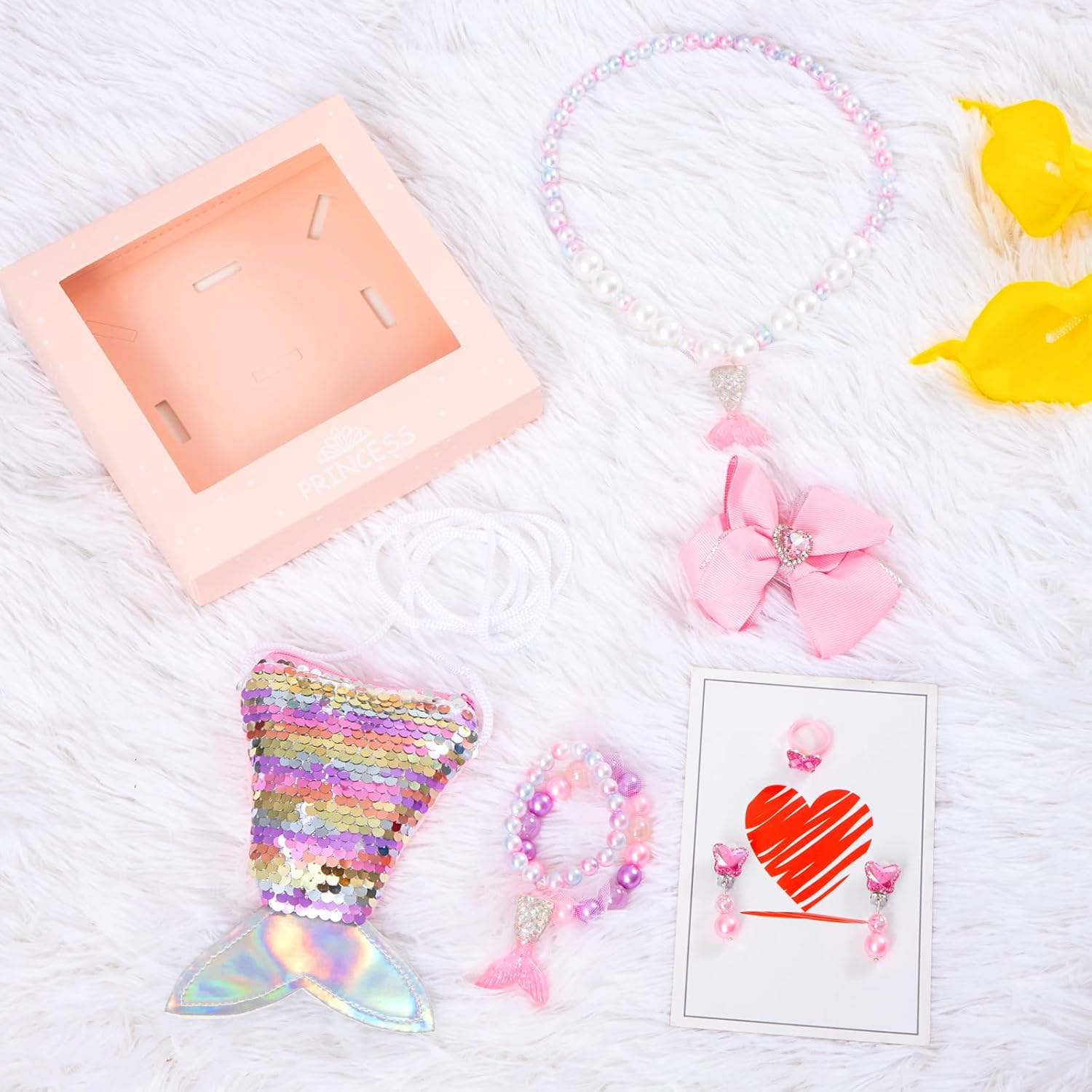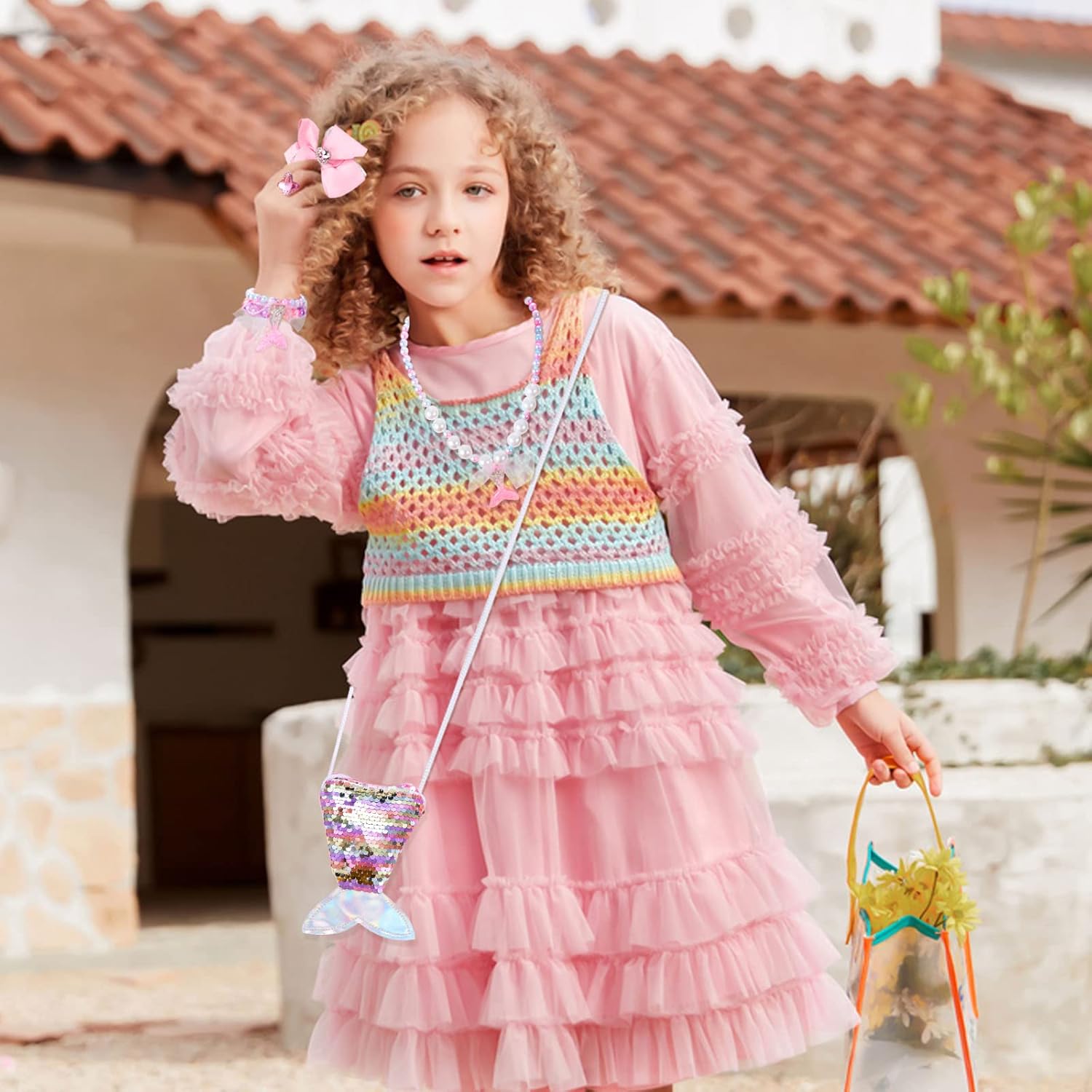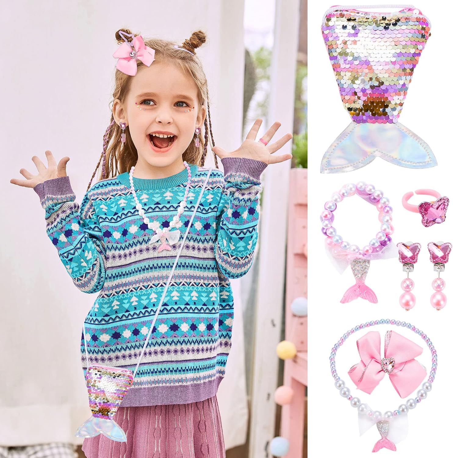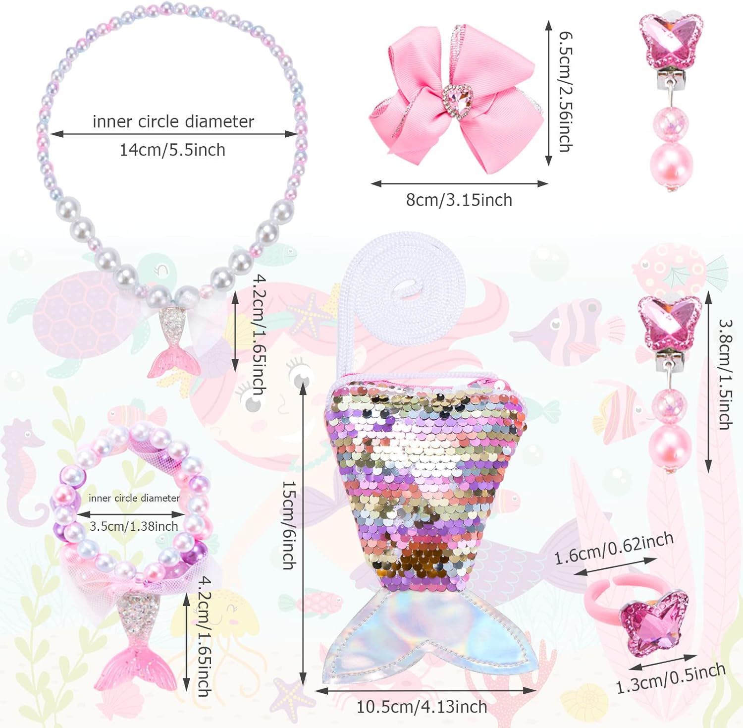 Descrizione prodotto Vesti la tua principessa con il set di gioielli a sirena e fai brillare la tua piccola principessa quest'estate. Caratteristiche: - Set regalo di gioielli principessa sirena che include 1 braccialetto, 1 fermaglio per capelli, 1 anelli, 1 portamonete, 2 fermagli per le orecchie, 1 collana. - Dal design accattivante con colori sgargianti e forme dolci di perline, la tua piccola principessa adorerà questi scintillanti parure di gioielli. - Le ragazze possono mettere il braccialetto della collana nella bellissima borsa a tracolla con portamonete a coda di sirena, è comoda per viaggiare o fare festa e abbinare i vari abiti della ragazza. - Borsa e ciondolo a coda di pesce a tema sirena, perline, orecchini e anello simili a pietre preziose. Questo set di gioielli è pieno di elementi di mare, oceano, spiaggia e sirena. - Ottima scelta per forniture per feste di Natale, sacchetti regalo di massa, omaggi natalizi, premi di giochi, premi in classe e feste a tema sirena. Specifica: Materiale: plastica e resina Colore: rosa / blu Peso: 140 g Per ragazze dai 3 agli 8 anni Il pacchetto include: 1 braccialetto 1 fermaglio per capelli 1 portamonete 2 clip per le orecchie 1 collana 1 x anelli Nota: 1. Si prega di consentire un errore di 1-3 mm, a causa della misurazione manuale, assicurarsi che non ti dispiaccia prima di fare un'offerta. 2. I colori possono essere diversi per lo schermo diverso, si prega gentilmente di capire. 3. Rischio di avvolgimento e piccoli oggetti inclusi, si prega di tenerli lontani dai bambini piccoli. Avviso di sicurezza Solo per uso esterno. Tenere lontano da fiamme libere e fonti dirette di calore.
