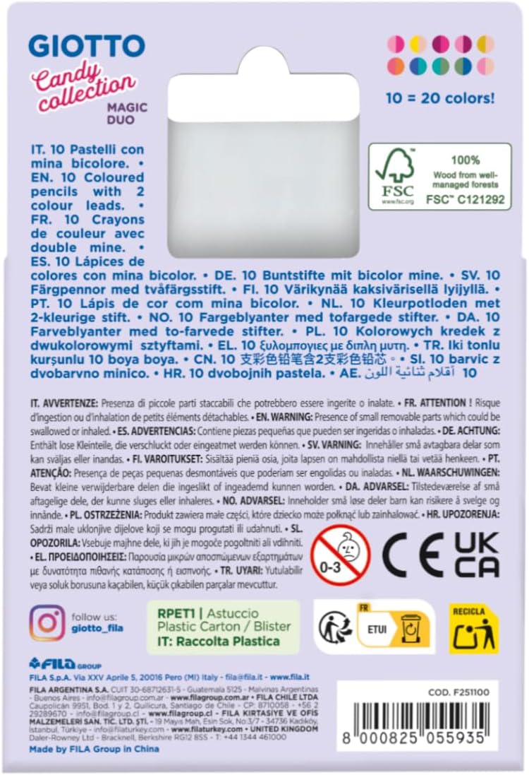 GIOTTO Magic Duo – Candy Collection: doppio colore, infinite possibilità creative! Scopri Giotto Magic Duo, il nuovo pastello con punta a doppio colore che arricchisce la famiglia Candy Collection Perfetto per chi ama personalizzare e aggiungere sfumature uniche, grazie alle sue tonalità candy che donano un tocco di dolcezza ai tuoi disegni. Ogni pastello ha una mina gigante doppio colore e morbidissima, che rende facile applicare il colore e sfumarlo per effetti davvero creativi Con una lunghezza di 9 cm e un diametro di 1 cm, sono comodi da impugnare e durano a lungo Ogni confezione contiene 10 pastelli con punta doppio colore, per infinite combinazioni e un’esperienza artistica ancora più divertente Fai volare la tua fantasia con Giotto Magic Duo, il pastello che trasforma ogni creazione in un’opera colorata