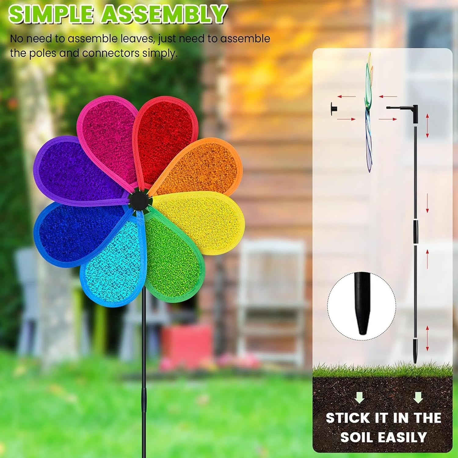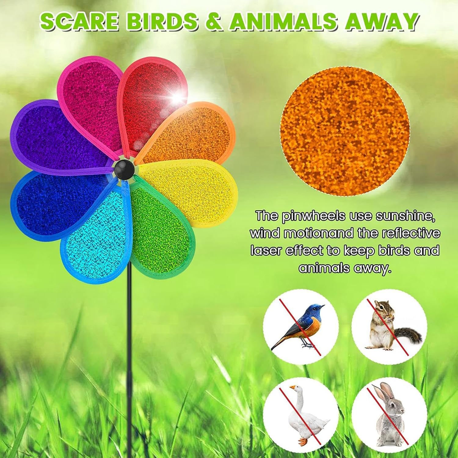 Controllo riflettente degli uccelli: protegge piante e colture riflettendo punti luminosi che spaventano gli uccelli, assicurando un'efficace prevenzione dei problemi legati agli uccelli, mantenendo allo stesso tempo uno spazio esterno armonioso senza sforzo Solido e resistente alle intemperie: la robusta composizione in PVC della girandola a vento assicura una struttura solida e impermeabile, resiste efficacemente allo sbiadimento e ai danni causati dall'acqua per prestazioni all'aperto durature Installazione a prova di problemi: presenta una facile installazione e assemblaggio delle parti per un uso rapido, mentre il suo design portatile e leggero garantisce un posizionamento sicuro a terra, migliorando comodità e stabilità durante le attività all'aperto Affascinante aggiunta da giardino: con attenzione all'aspetto estetico, queste girandole combinano un design colorato e vivace per promuovere la bellezza del giardino fornendo allo stesso tempo decorazione e funzionalità Ampia gamma di usi: perfetto per cortili e giardini, ideale per fattorie e prati, e si adatta a vasi e balconi con il suo design adattabile per vari spazi esterni