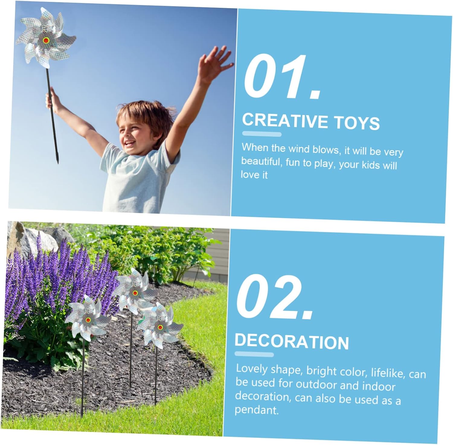 Girandola: ha molti usi, può essere usata come decorazione del tuo giardino e può anche essere usata come mulino a vento per far giocare i tuoi bambini, Ruota riflettente: un ottimo modo per sbarazzarsi degli uccelli senza far loro del male, giocattoli a forma di mulino a vento Girandola con : può essere utilizzata anche per parchi, decorazioni per parchi giochi per bambini, inaugurazioni di asili, maliziosi, supermercati, zoo, ecc., gadget per la casa Girandole: possono essere utilizzate anche come giocattolo da esterno e come oggetto fotografico, girandole paraocchi per uccelli Dispositivo per uccelli: realizzato con materiali di qualità, puoi conservarlo a lungo termine, ruota con paillettes