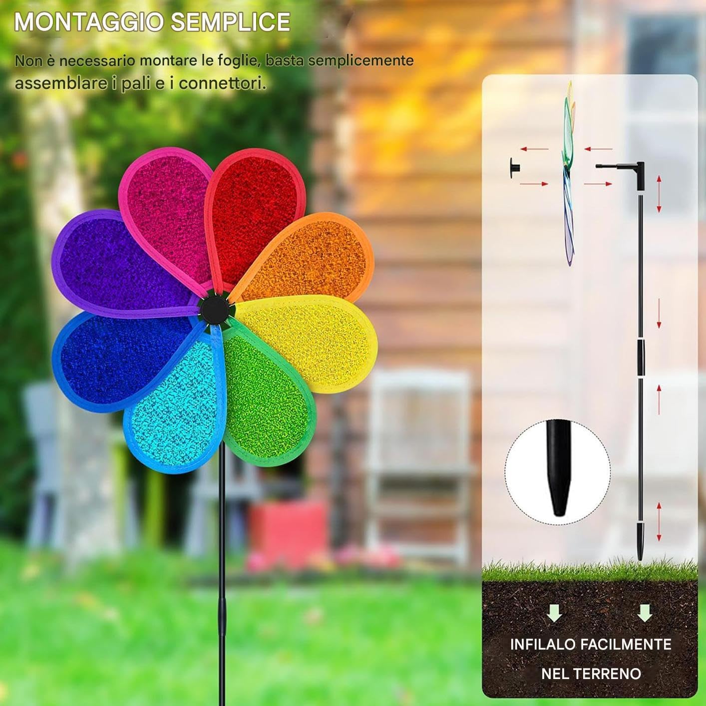 Posizionamento Flessibile: Valorizza cortili e giardini, si integra in fattorie e prati, aggiunge fascino a vasi e balconi con applicazione esterna polivalente Protezione Anti Uccelli: Tiene lontani gli uccelli da piante e coltivazioni grazie a punti luce altamente riflettenti che riflettono la luce, fornendo una protezione efficace senza effetti nocivi per l'ambiente esterno Assemblaggio Immediato: Guida passo-passo inclusa per un montaggio autonomo in massimo 5 minuti, materiali leggeri ma resistenti per collocazione stabile su , cemento o ghiaia con zero manutenzione Elemento Decorativo: Queste girandole da esterno portano appeal estetico al tuo spazio verde mostrando un design vivace che esalta la bellezza 'area esterna attraverso movimento e colori dinamici Resistente Scolorimento: Realizzato in PVC solido, questo spinner eolico da esterno offre una struttura impermeabile che combatte lo scolorimento e i danni nel