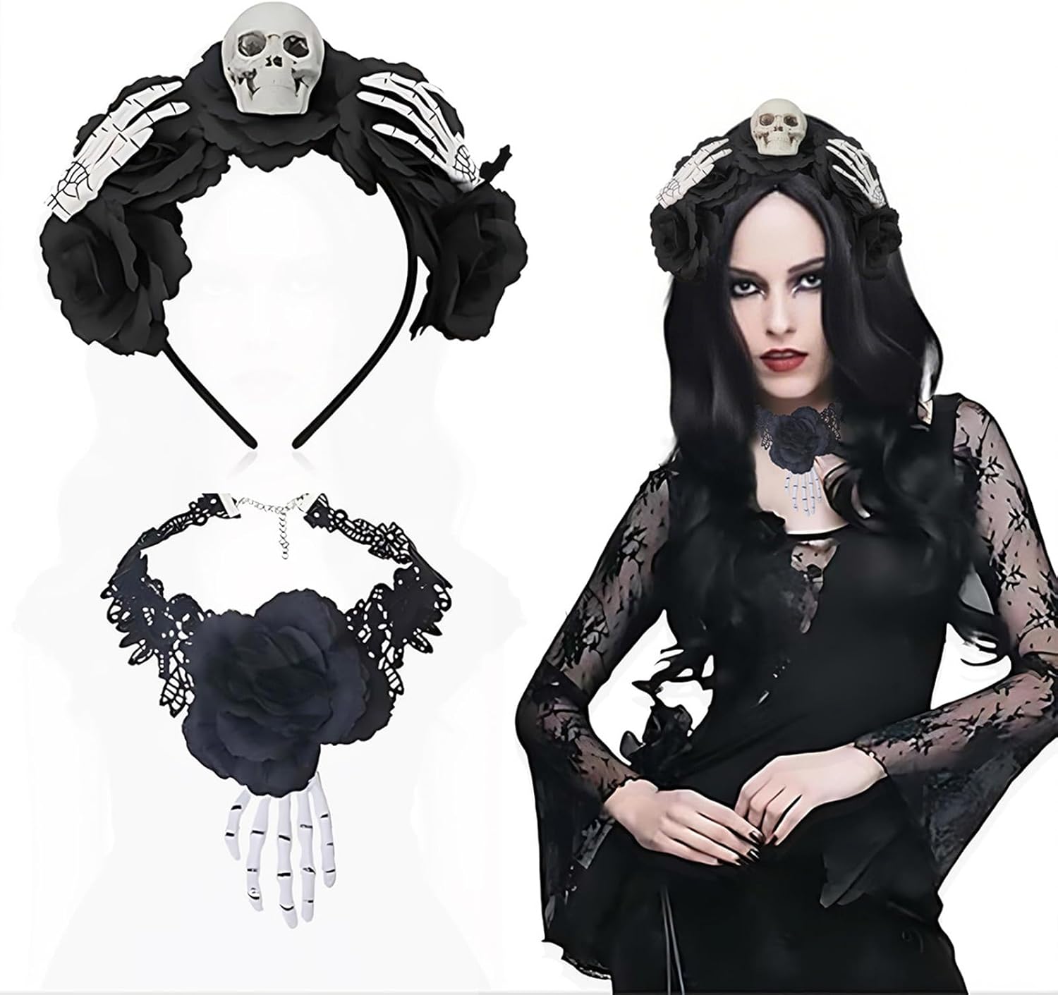 Girocollo regolabile confortevole teschio e copricapo floreale accessori costume per Halloween Cosplay feste ed eventi Caratteristiche: Migliora il nostro look di Halloween con questo esclusivo set di fascia e girocollo con fiore scheletro che combina dettagli realistici del teschio e fiori finti per stili misteriosi elevazioni. Realizzato in poliestere, estetica mistica, vestibilità comoda, si abbina a qualsiasi acconciatura e outfit. Ideale per adulti che cercano moda distintiva, appassionati di cosplay, e chiunque partecipi a eventi a tema. Ideale per abbellire oggetti di scena fotografici, matrimoni a tema cosplay, feste di Halloween o aggiungere un tocco mistico a abiti da festival e ritratti creativi. Con i suoi dettagli creativi e la sua struttura pratica, questa fascia è un'aggiunta alla tua collezione di accessori di Halloween e attrezzatura per feste. Specifiche tecniche: Componente: e poliestere Colore opzionale: come da immagine. Dimensioni: ca. come da immagine. Quantità: 1 set. La confezione include: 1 fascia per capelli per Halloween. 1 girocollo per collo. Nota: Si prega di considerare un margine di errore di 1-3 cm dovuto alla misurazione Si prega di assicurarsi che non sia un problema prima di effettuare l'ordine. A causa della differenza tra i diversi monitor, l'immagine potrebbe non riflettere il colore reale dell'articolo.