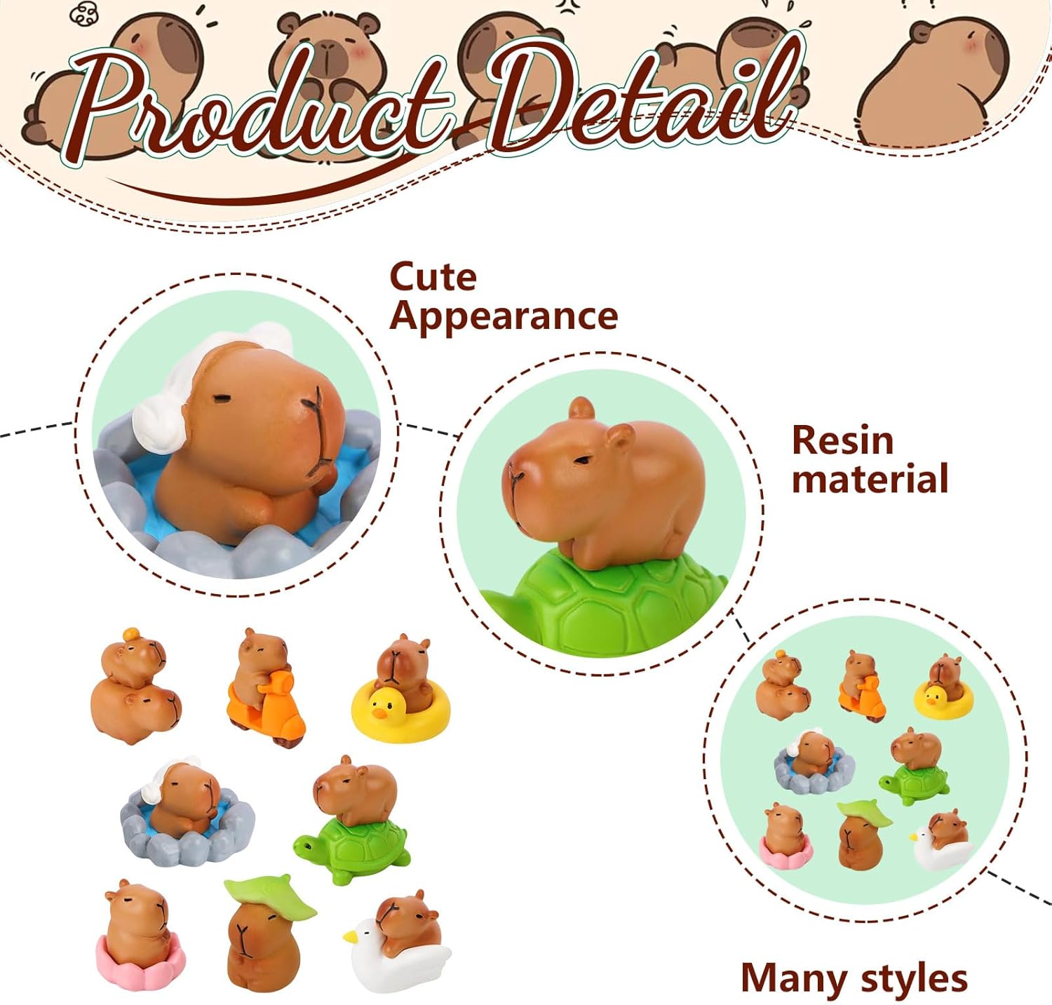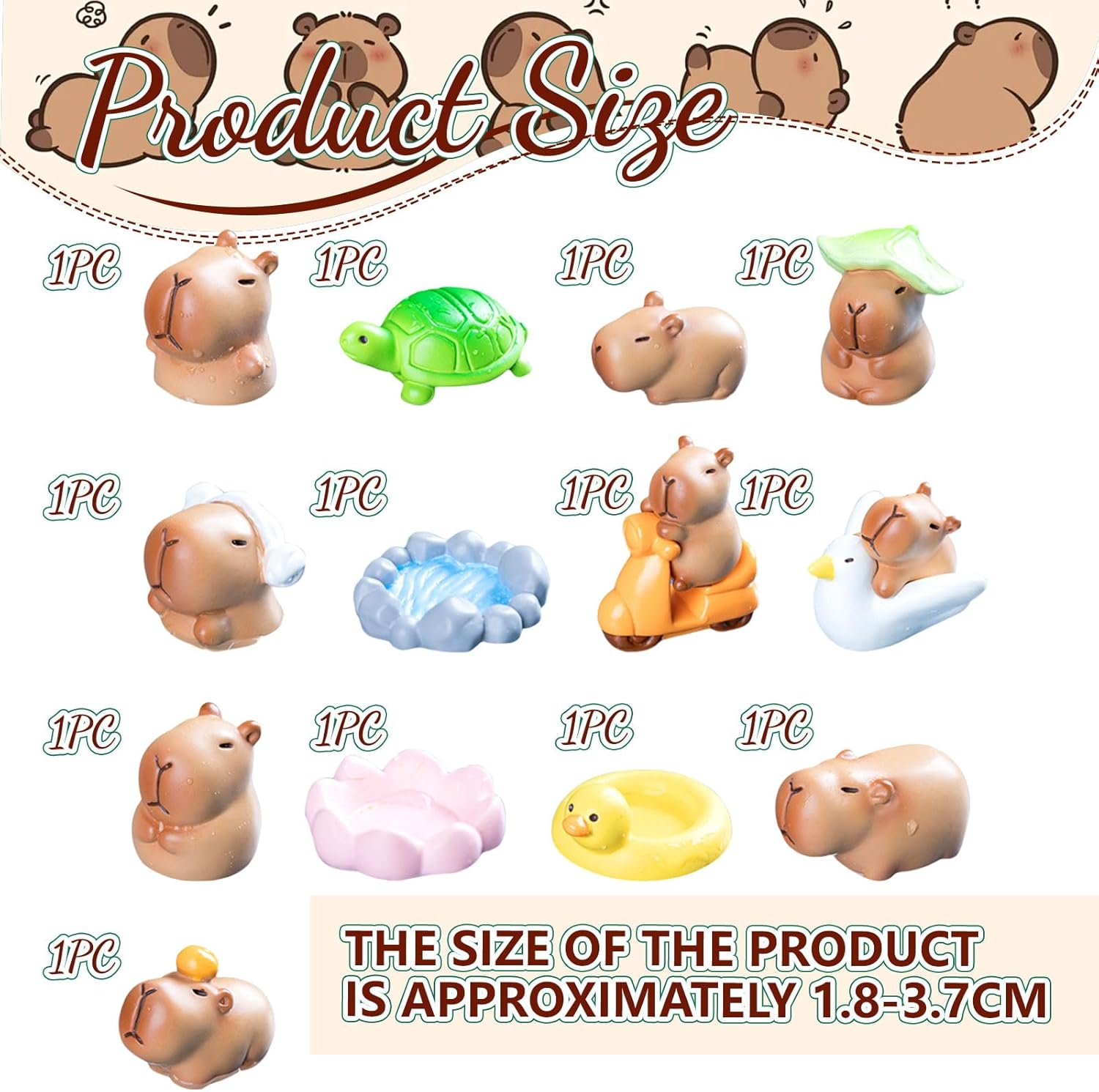 Mini figure di capibara: set di 8 decorazioni in miniatura di capibara con 8 design scenici. Dimensioni: 13 modelli di dimensioni, la dimensione massima è 2,99 * 3,51 cm, e la dimensione minima è 2,08 * 1,60 cm Materiale: resina. Liscio, chiaro e impermeabile Design carino e interessante: queste miniature in resina a forma di capibara hanno posture basse, orecchie ed espressioni che le rendono molto vivaci ed energiche. Versatile applicazione: Questi mini animali sono molto adatti per case delle bambole, bonsai, vasi di fiori, micropaesaggi, paesaggi in piccoli contenitori di vetro, mini giardini, esposizioni di microscenari, decorazioni per automobili, ecc.