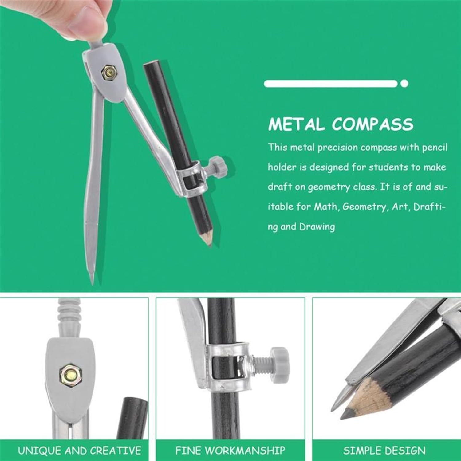 - Il design a vite impedisce movimenti involontari delle gambe. - Realizzato in metallo con placcatura lucida, ha una lunga durata. - Viene fornito con custodia e matita. - Adatto a studenti e impiegati per scrivere e disegnare. - Dimensioni: 12 x 3 x 3 cm Adatto a insegnanti e studenti, il nostro set di compassi può disegnare qualsiasi forma geometrica.