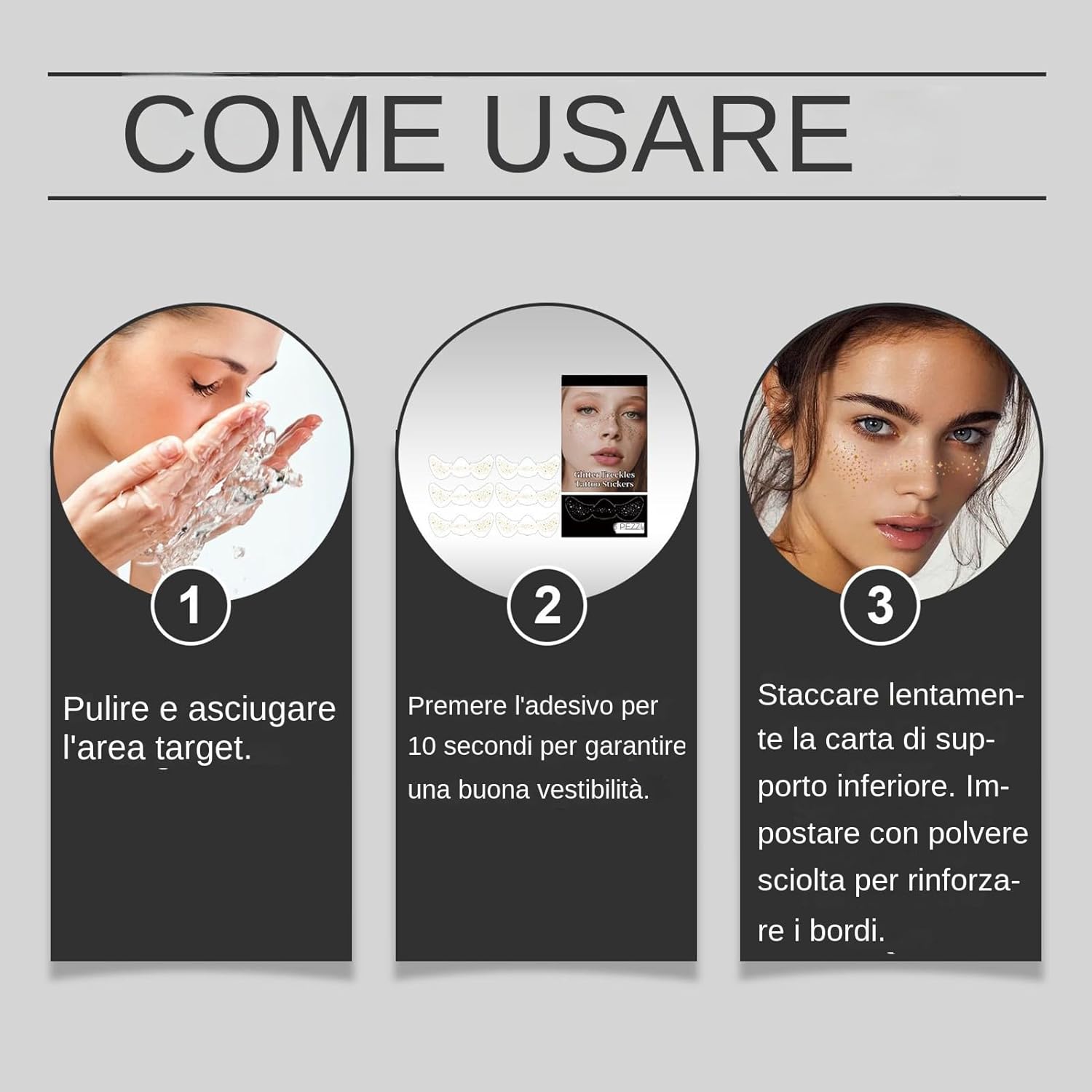 Materiale sicuro: Tecnologia di adesione delicata sviluppata per pelli sensibili. La speciale composizione garantisce uniforme senza tracce e preserva l'idratazione cutanea durante l'utilizzo continuativo Formula resistente: Combinazione ottimizzata di rivestimento protettivo e tecnologia adesiva specializzata previene il distacco dei glitter, mantenendo intatta la decorazione per tutto il giorno senza sbavature o alterazioni Adattabilità a eventi: Unisci versatilità di stile e libertà creativa, regolando forme e densità per soddisfare le esigenze estetiche di diversi eventi Applicazione Rapida: Semplifica la tua routine di trucco con il design a strappo e pressione di Freckles Face , garantendo una pressione uniforme per creazioni festive e affascinanti che ottimizzano il senza compromettere l'estetica Adesivo Potente: Prova la resistenza al sudore e stabilità anti-attrito con adesivo ad alta intensità per una durata prolungata, garantendo tatuaggi viso effetto lentiggini perfetti senza sfiorire