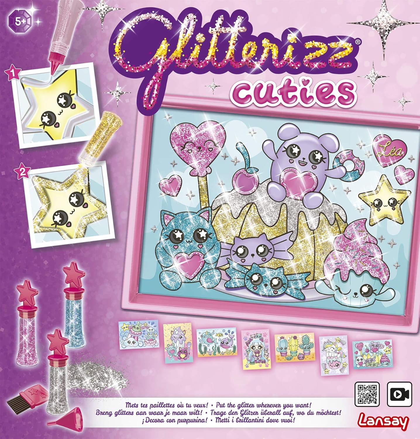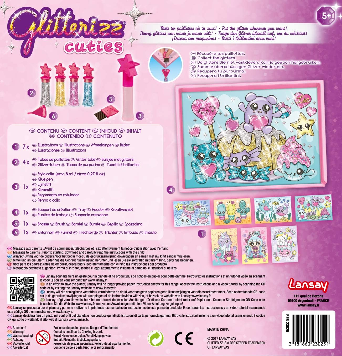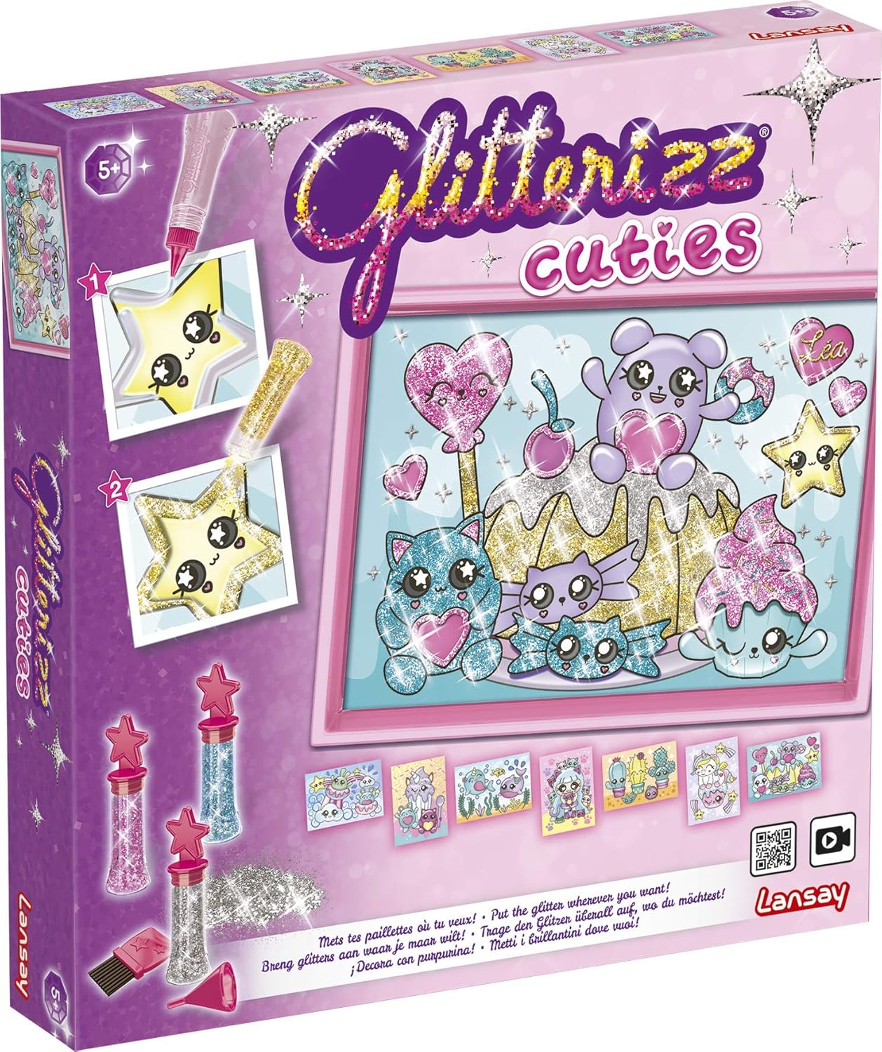 Scoprite l'universo troppo carino dei Cuties e fate brillare mettendo dei glitter dove volete! Seleziona un'illustrazione e copre ogni parte che desideri far brillare con l'aiuto della penna colla precisa. Un vero artista, prende un tubo di glitter e salva il tuo disegno. A5:A13 Asciugatura rapida e perfetta tenuta dei glitter. Recupera le tue paillettes per realizzare nuove illustrazioni. È facile mettere dei glitter nella sua vita con Glitterizz. Questa volta, provate per l'universo troppo carino delle illustrazioni Glitterizz Cuties.