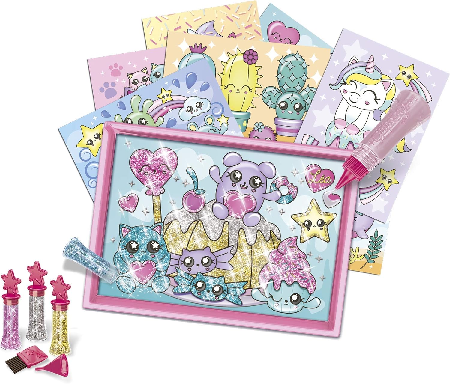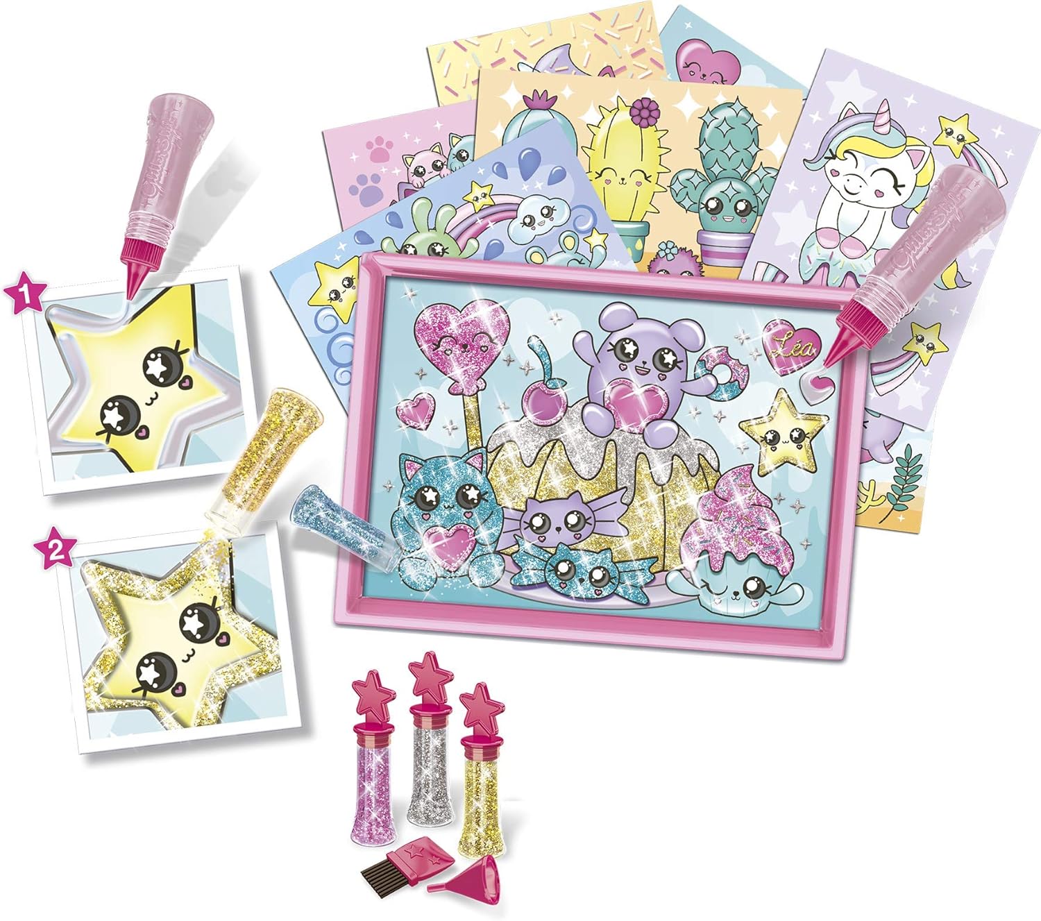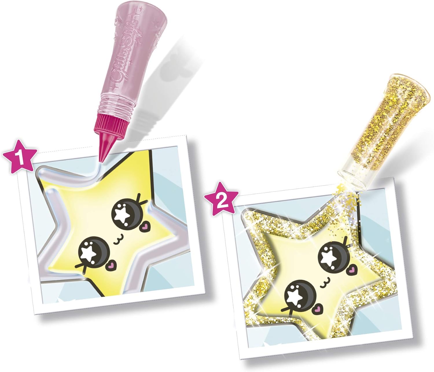 Scoprite l'universo troppo carino dei Cuties e fate brillare mettendo dei glitter dove volete! Seleziona un'illustrazione e copre ogni parte che desideri far brillare con l'aiuto della penna colla precisa. Un vero artista, prende un tubo di glitter e salva il tuo disegno. A5:A13 Asciugatura rapida e perfetta tenuta dei glitter. Recupera le tue paillettes per realizzare nuove illustrazioni. È facile mettere dei glitter nella sua vita con Glitterizz. Questa volta, provate per l'universo troppo carino delle illustrazioni Glitterizz Cuties.