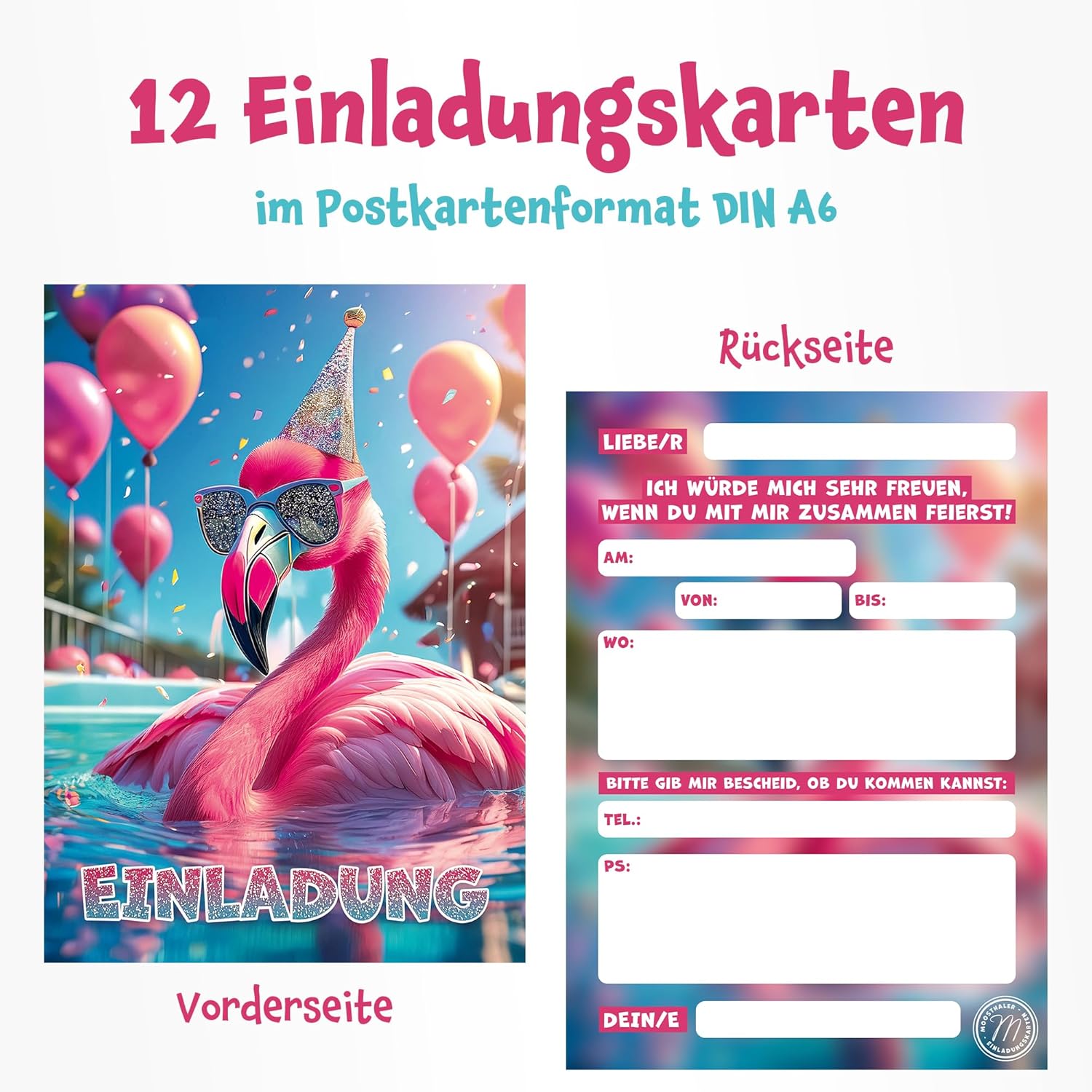 Flamingo: perfetto per la tua festa estiva! Sia in piscina, in piscina o al lago: con questi eleganti biglietti per feste con vernice glitterata parziale entusiasmerete i vostri ospiti Con brillantini – Per ancora più stile, abbiamo parzialmente impreziosito la parte anteriore dei biglietti di invito con vernice glitterata. SUGGERIMENTO: nel nostro video lo vedi particolarmente bene! Riempito rapidamente: compilato in un batter d'occhio attraverso i campi predefiniti. In questo modo è possibile invitare anche le feste più grandi in modo rapido e semplice Biglietti di alta qualità: stampati su carta rigida da 350 g/m². La parte anteriore è parzialmente rifinita con vernice glitterata, mentre il retro rimane scrivibile con tutte le penne comuni Contenuto della confezione: 12 biglietti d'invito per feste a tema fenicottero, stampati su entrambi i lati in formato cartolina DIN A6 (10,5 cm x 14,8). Stampato in Germania con compensazione CO₂.