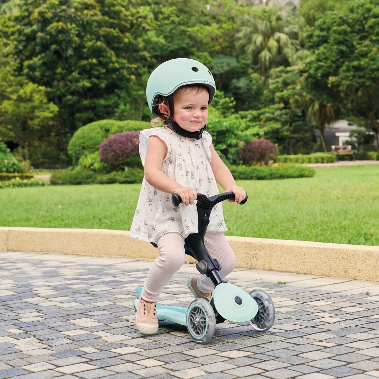 Globber - GO•UP ACTIVE LIGHTS 360 - monopattino evolutivo con seduta girevole a 360°, poggiapiedi, luci LED e 3 ruote, per bambini da 15 mesi a 6 anni - verde menta