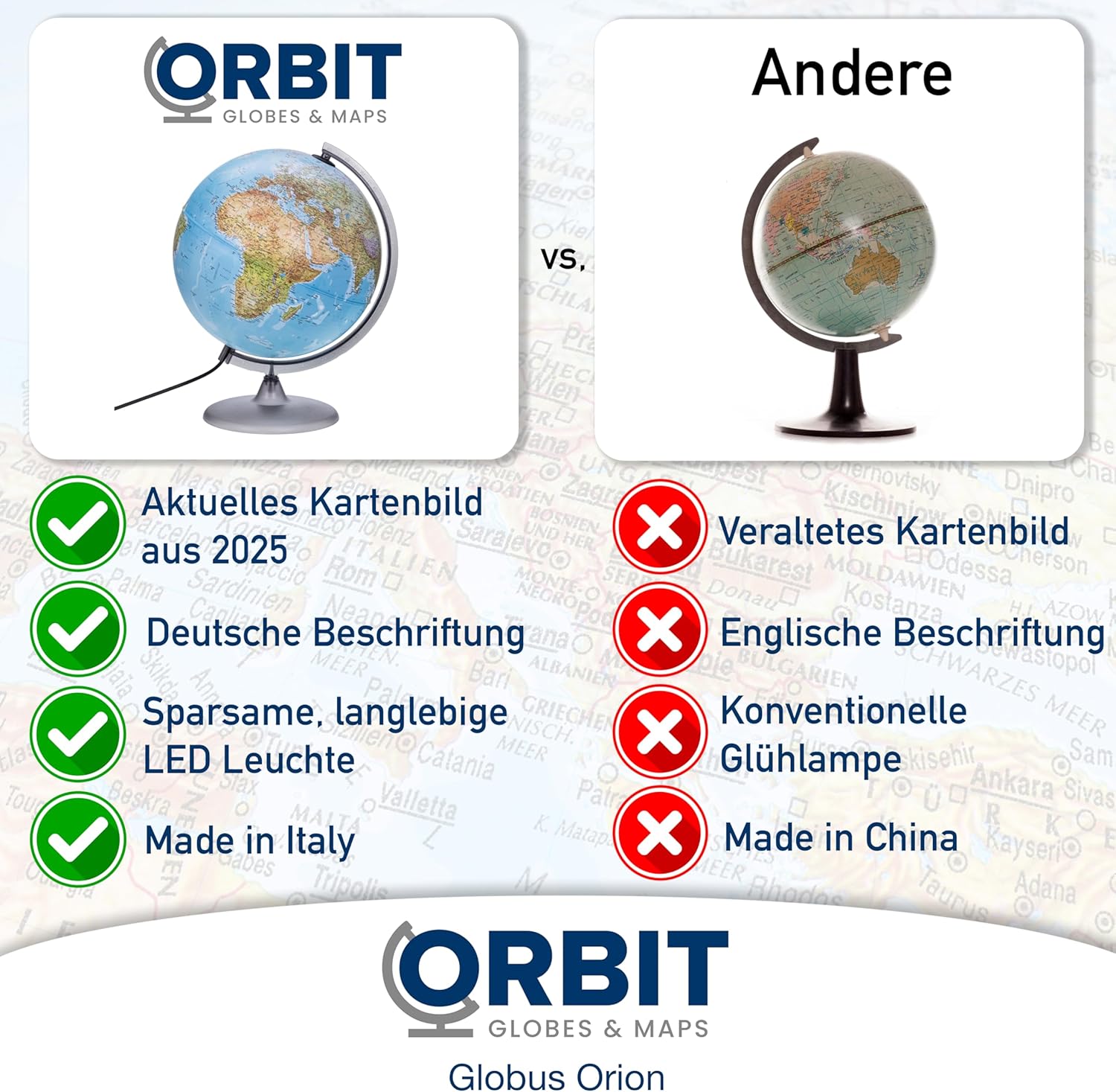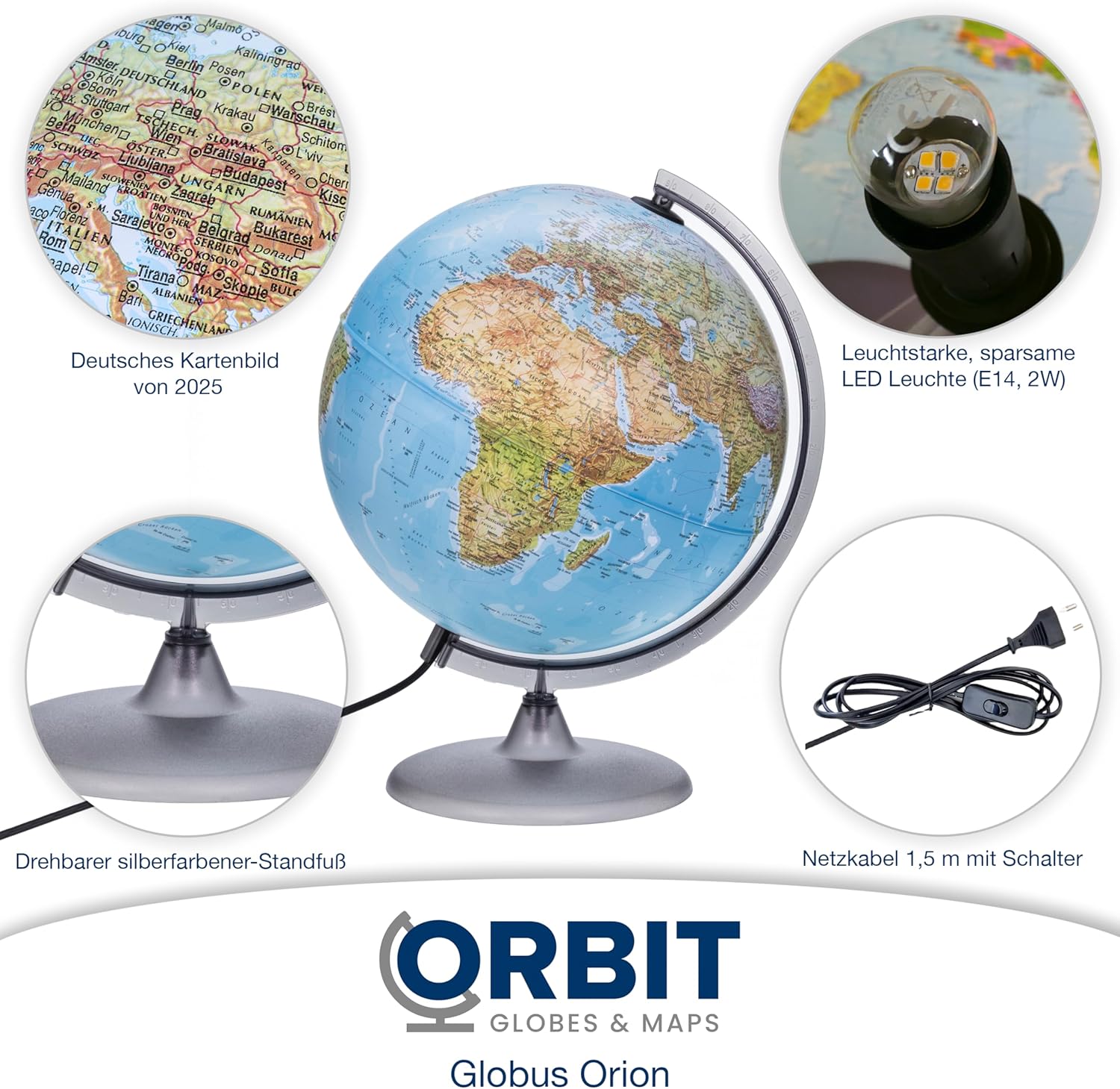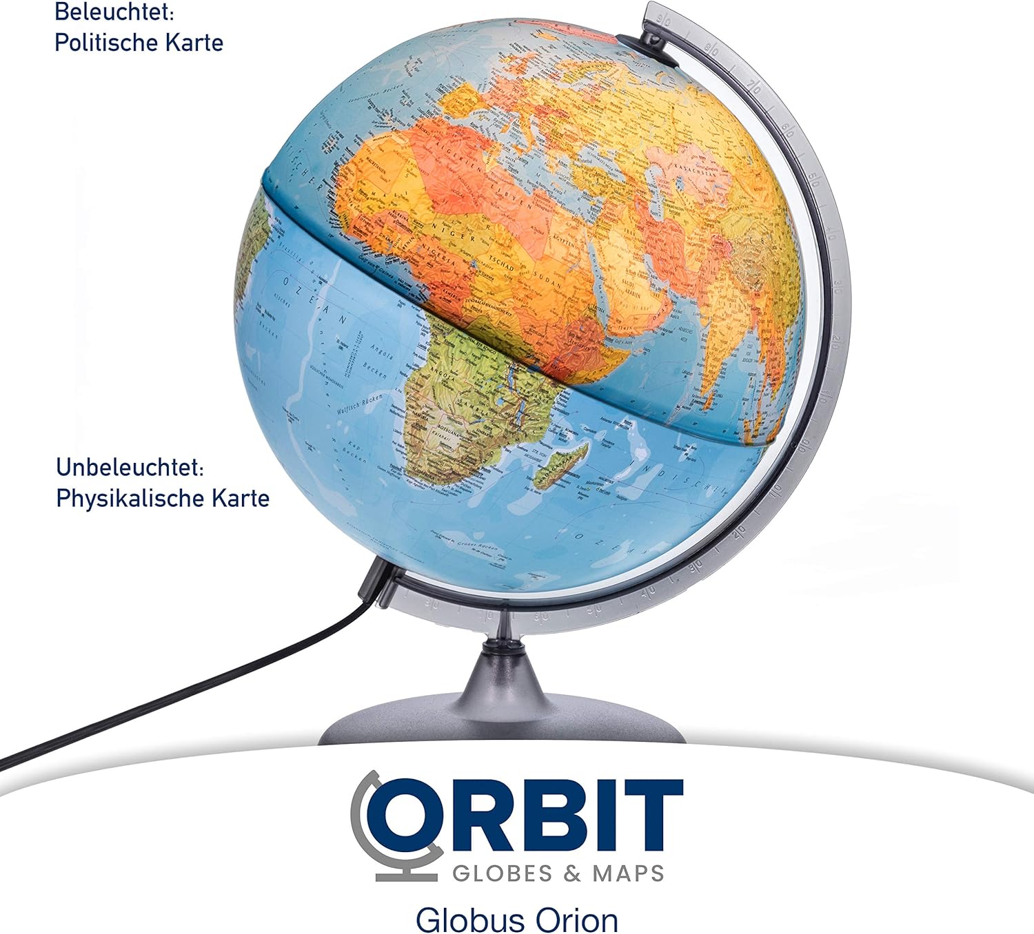 🌍 DIMENSIONE OTTIMALE - La sfera del globo ha un diametro di 30 cm e, compresa la base, un'altezza totale di ca. 40 cm. Ha le dimensioni tipiche di un mappamondo, da sempre collaudate. 🌎 ETICHETTATURA TEDESCA - Questo globo illuminato ha le mappe tedesche attuali del 2025. Tutte le etichette hanno nomi di paesi e città tedeschi - adatto anche come mappamondo studentesco. 🌏 LED LUMINOSO A RISPARMIO ENERGETICO - Il globo è illuminato con una lampada a LED (E14, 2W) ed è quindi molto facile da leggere anche al buio. 🌎 DECORATIVO E CHIARO - Questo mappamondo è decorativo e, con la sua immagine di mappa fisica/politica, offre molte informazioni per vari scopi. 🌎 STABILE E DI ALTA QUALITÀ - Il mappamondo poggia su una base stabile e rotante. Nel complesso un regalo carino e decorativo.