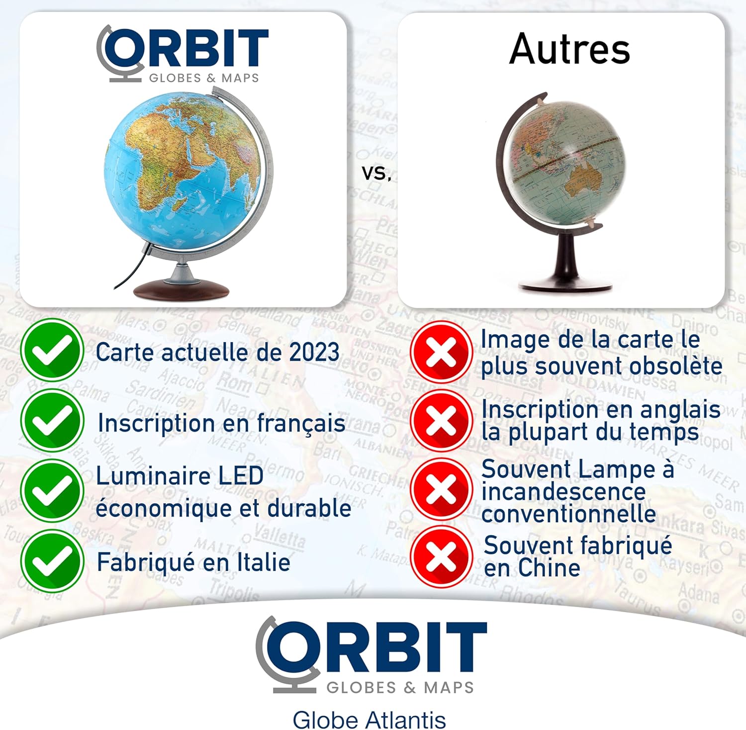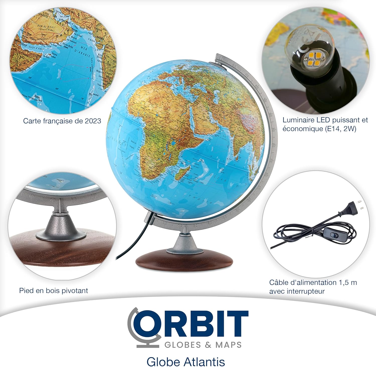 🌍 DIMENSIONE OTTIMALE - Il globo ha un diametro di 30 cm e un'altezza totale di circa 40 cm compreso il supporto. Ha quindi la dimensione tipica di un globo, che si è sempre affermata. 🌎 ETICHETTE FRANCESI - Questo globo illuminato presenta le attuali mappe francesi risalenti al 2023. Tutte le iscrizioni sono accompagnate dai nomi di paesi e città francesi. 🌏 LED LUMINOSO A RISPARMIO ENERGETICO - Il globo è illuminato da una lampada a LED (E14, 2W) ed è quindi molto leggibile, anche al buio. 🌎 DECORAZIONE E AUTOMATICO - Questo mappamondo è decorativo e offre, con la sua immagine di mappa fisica/politica, tantissime informazioni per gli usi più diversi. 🌎 STABILE E DI ALTA QUALITÀ - Il mappamondo poggia su una base di legno stabile e girevole. Nel complesso, un bel regalo decorativo.