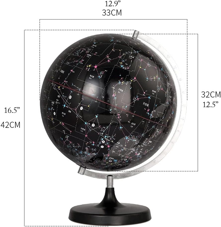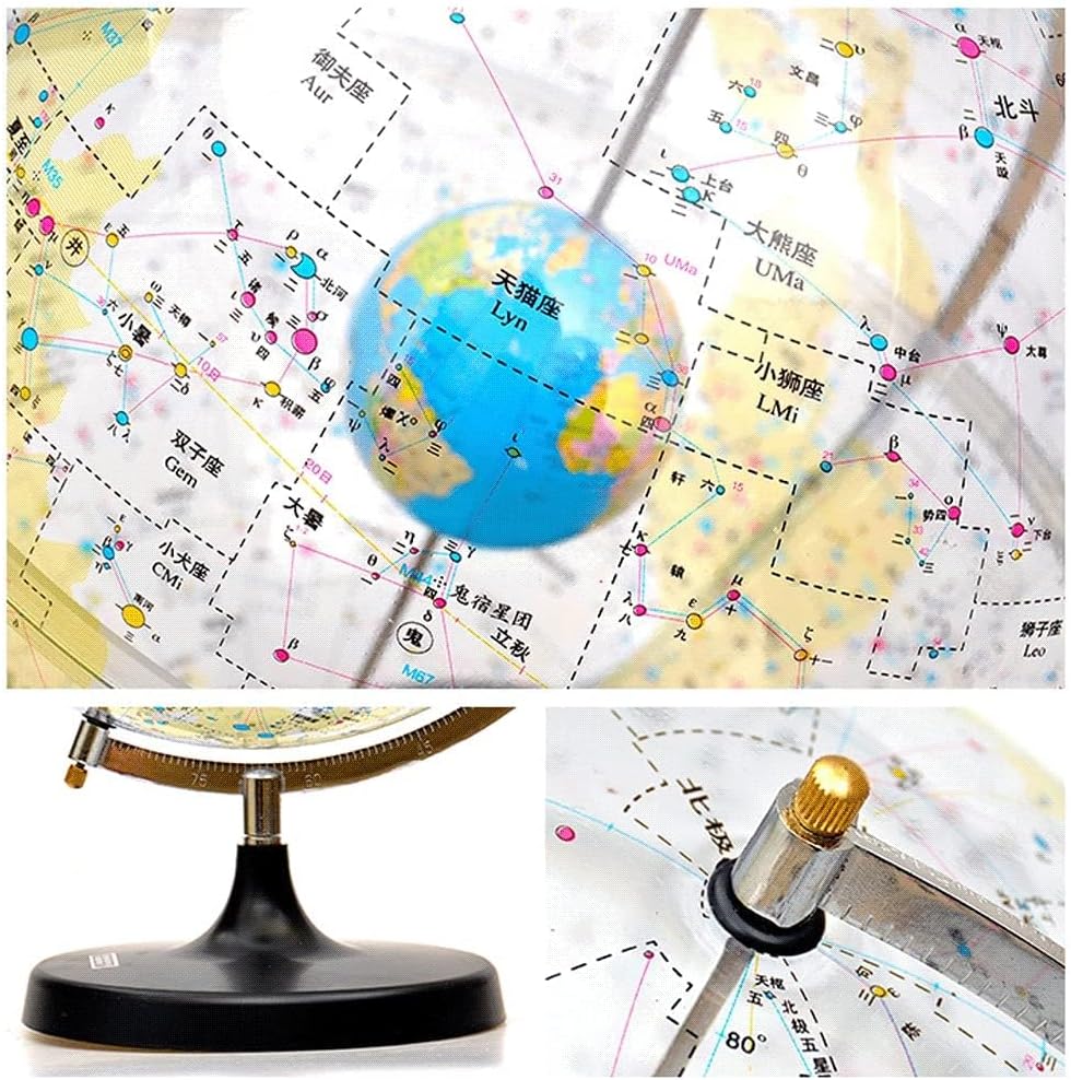 Mappamondo educativo: questo globo è progettato per migliorare la conoscenza geografica, perfetto per l'apprendimento a casa, in classe o in ufficio. La sua rappresentazione dettagliata della geografia terrestre lo rende uno strumento educativo inestimabile. Scientific Celestial Globe: presenta un design trasparente per l'insegnamento dell'astronomia e la navigazione. Visualizza le coordinate celesti, il moto apparente dei corpi celesti e aiuta a risolvere problemi astronomici pratici. 88 Costellazioni Display: La superficie nera mostra 88 costellazioni, termini solari zodiacali e sistemi di coordinate celesti. L'effetto illuminato evidenzia chiaramente le costellazioni per un'esperienza di apprendimento coinvolgente. Asse celeste girevole: dotato di un albero metallico che rappresenta l'asse celeste, consentendo al globo di ruotare. Le estremità segnano i poli celesti, facilitando una comprensione pratica dei movimenti celesti. Design robusto e funzionale: montato su un cerchio di meridiano in metallo all'interno di una cornice che include un cerchio orizzontale. Questa configurazione garantisce stabilità e migliora la funzionalità del globo come pezzo educativo e decorativo.