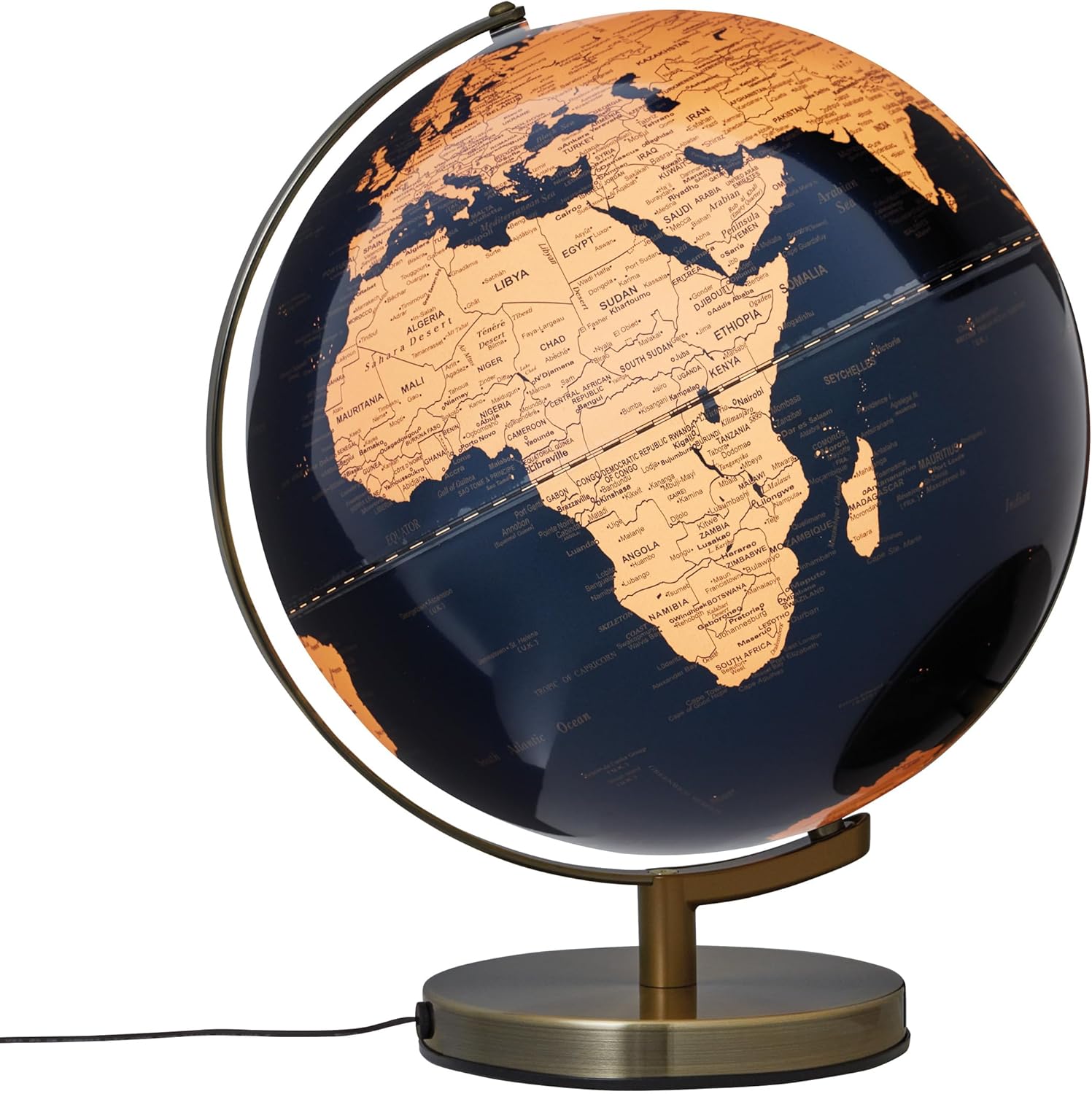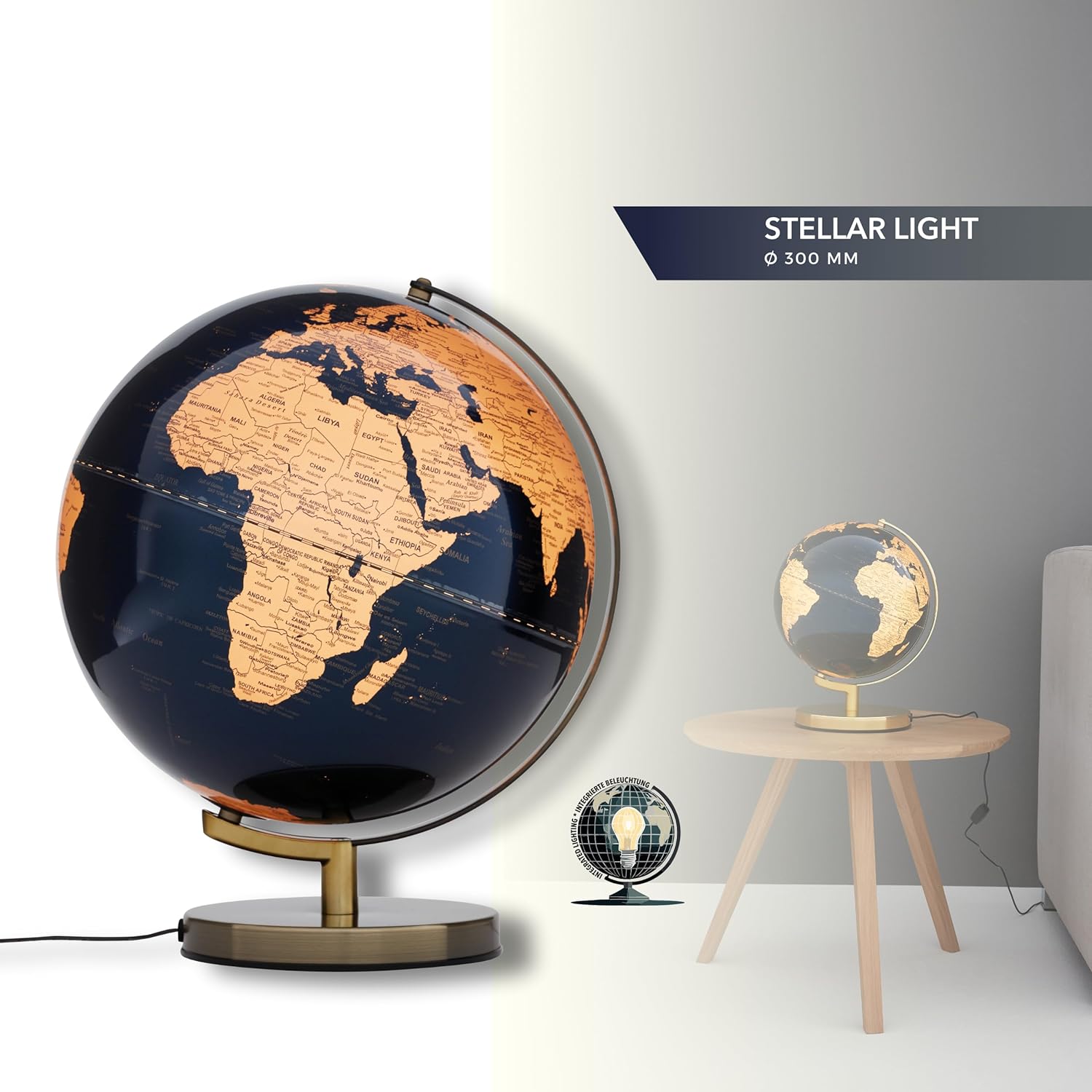 Mappamondo TROIKA ORIGINALE con diametro di 30 cm. Globo illuminato con un'altezza totale di 38 cm, girevole su una stabile base in metallo dorato antico. Altro equipaggiamento: cavo nero con spina Euro e interruttore. Globo LED lucido LUCE STELLARE (diametro 30 cm) con immagine della mappa illuminata. Le aree terrestri sono dorate e i mari sono blu scuro. Il globo è etichettato in inglese e mostra continenti, paesi, oceani, zone geografiche, città importanti e montagne. Funzionale e decorativa: l'illuminazione a LED integrata con luce calda unisce la geografia con un'atmosfera familiare. Crea un ambiente piacevole per la scoperta e l'apprendimento.. Valore aggiunto: con i suoi dettagli realistici e la lavorazione di alta qualità, il mappamondo non è solo un elemento decorativo, ma anche uno strumento educativo per menti curiose di tutte le età.. Dimensioni complessive: 300x300x380 mm, 1500 g - confezionato in confezione regalo di alta qualità. COLLEZIONE GLOBO DI DESIGN DI TROIKA. DARE UNA CASA AL MONDO. La collezione Globus offre un'affascinante selezione di oggetti di design che aggiungeranno un tocco unico ed elegante alla tua casa o alla tua scrivania. VIAGGIO INTELLIGENTE Fedeli al nostro motto "organizzato in movimento", offriamo accessori da viaggio più grandi e più piccoli. Dagli adattatori alle scatole per cavi, dagli zaini alle custodie per passaporti, dalle custodie per bagaglio a mano alle custodie per documenti 🎁 GIVING JOY - TROIKA è sinonimo di trasformare le tendenze attuali in prodotti ben pensati, sempre con un occhio al design armonioso e alla creatività. Tutti conoscono la questione del regalo giusto, ma non è mai facile trovare quello giusto.