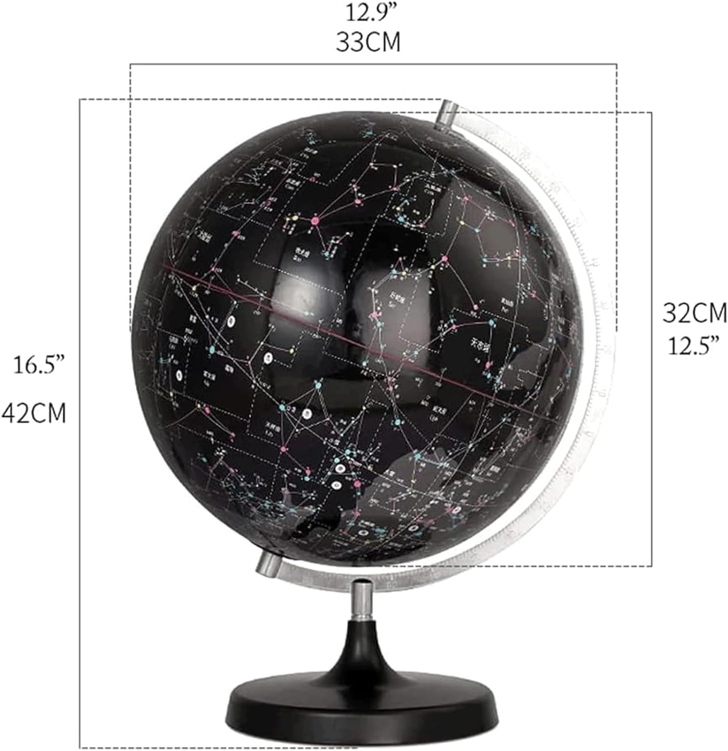 La superficie opaca delicata e trasparente non solo ti offre una sensazione confortevole, ma protegge anche i tuoi occhi dall'affaticamento. Dettagli migliori: c'è un asse metallico che attraversa il centro della terra celeste che rappresenta l'asse diviso. Le estremità dell'asse sono l'Artico e l'Antartico dei corpi celesti. Le sfere celesti possono ruotare attorno all'asse celeste. Telaio robusto: l'asse diviso è montato sul cerchio metallico. Il cerchio metallico dell'asta di sostegno rappresenta il giro del mezzogiorno (vedi sistema di coordinate celesti). Posiziona il cielo terra sulla cornice e il cerchio orizzontale indica l'orizzonte nella cornice. Facile da leggere: Sulla superficie dell'astro nero si trovano 88 costellazioni e abbreviazioni, i ventiquattro termini solari dei segni zodiacali, nonché il simbolo e il grado di diversi sistemi di coordinate celesti. La massa nera della terra celeste ha un effetto più evidente, ovvero l'accensione della luce. Conoscenza ricca: strumento ausiliario per la navigazione, l'insegnamento dell'astronomia e la conoscenza dell'astronomia. Le persone lo usano per esprimere varie coordinate di corpi celesti, esprimere ovviamente i corpi celesti e risolvere alcuni problemi astronomici pratici.