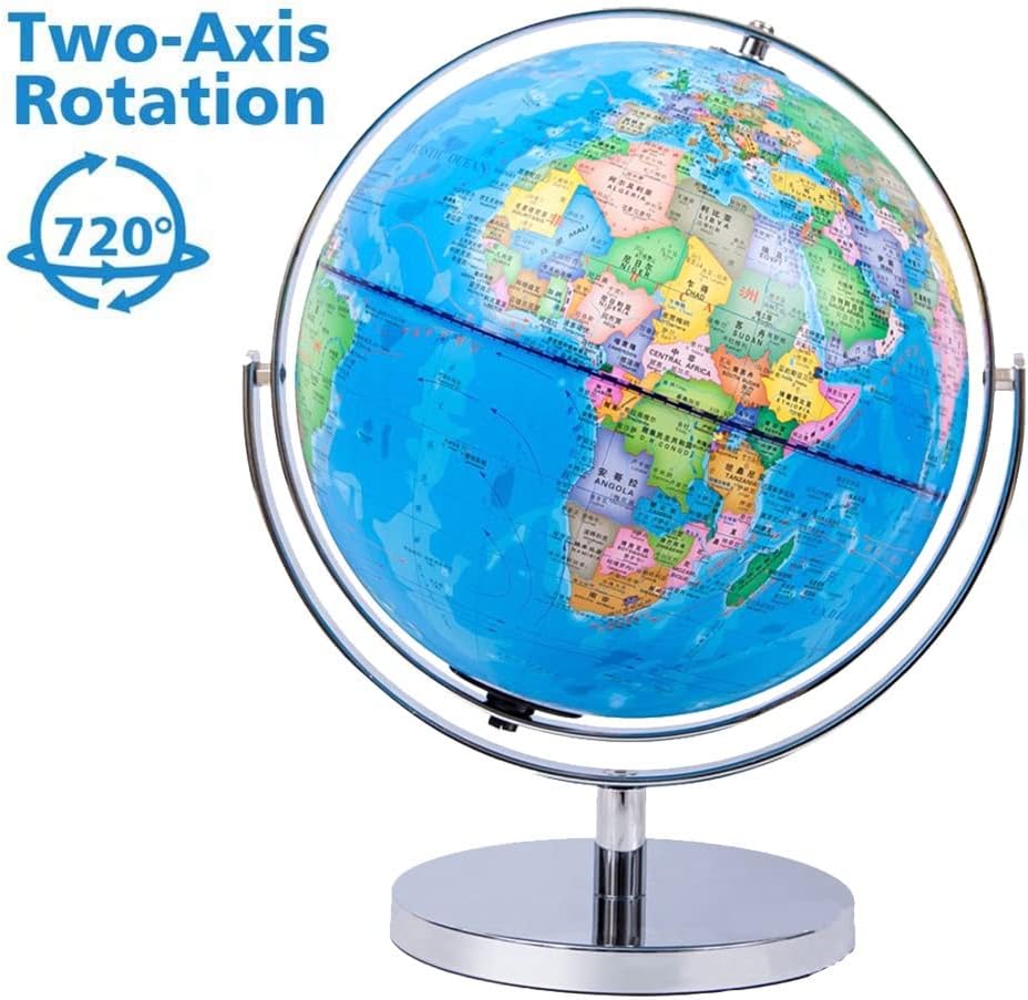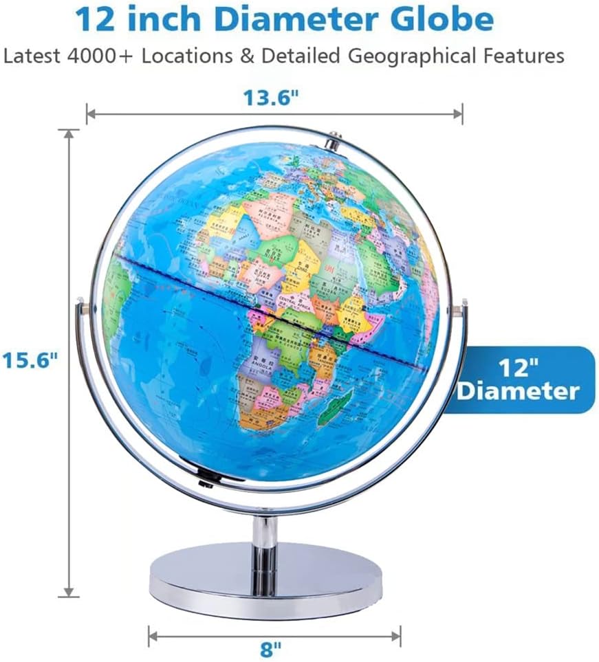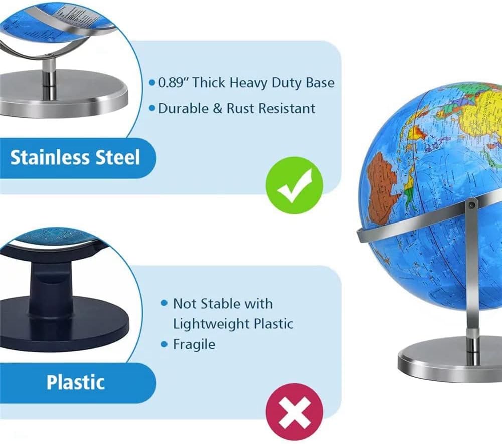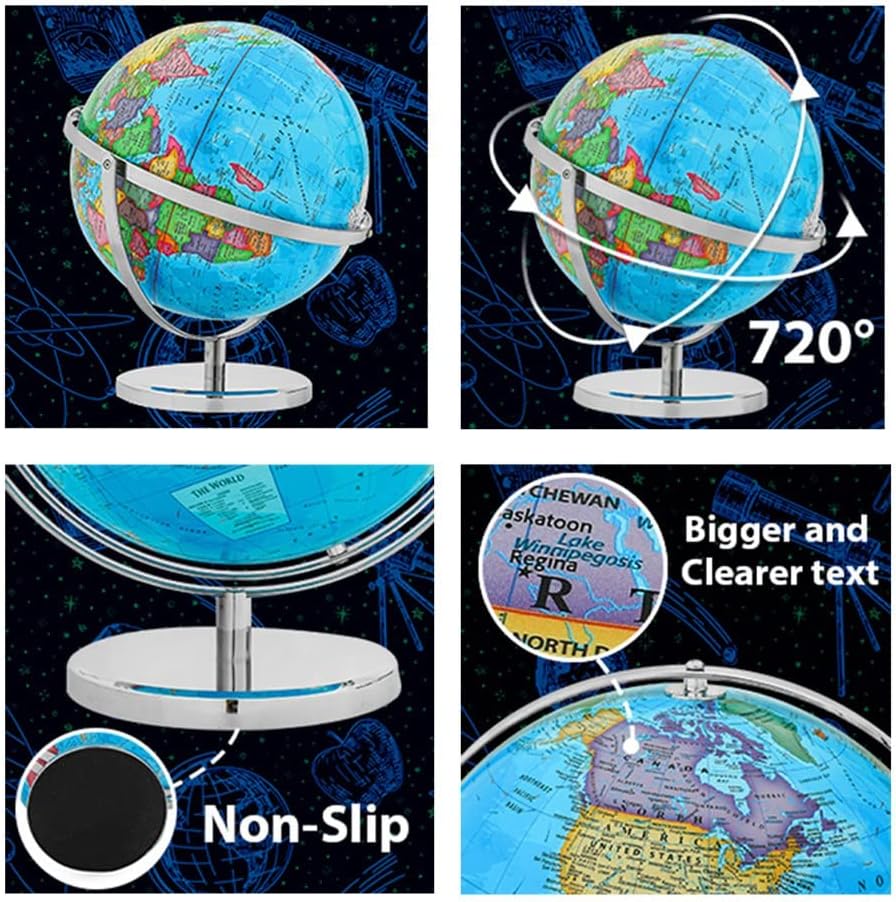 [Ottimo strumento didattico]: questo lo rende un ottimo strumento for l'insegnamento della geografia. [ Materiali]: Il globo è costruito con materiali e presenta una mappa colorata e dettagliata del mondo con testo chiaro. Caratteristiche del prodotto: [Globo da 13 pollici con supporto]: è l'aggiunta perfetta a qualsiasi casa, scuola o ufficio. È dotato di girevoli a 720° in tutte le direzioni, consentendoti di esplorare facilmente il mondo da qualsiasi angolazione. [Supporto in acciaio inossidabile]: il supporto in acciaio inossidabile è robusto e stabile ed è progettato for mantenere il globo saldamente in posizione. LA TUA SODDISFAZIONE GARANTITA - Il nostro marchio è impegnato a offrire ai nostri clienti la più pura esperienza d'uso possibile. La soddisfazione del cliente è sempre stata la nostra massima priorità, tutti i nostri prodotti sono dotati di una garanzia di soddisfazione al 100%.