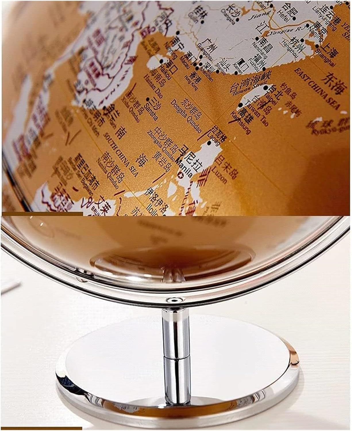 I globi sono eccellenti strumenti didattici e il modo perfetto per incoraggiare l'apprendimento e l'esplorazione della geografia mondiale. I globi offrono un modo divertente per insegnare la geografia. Sono ideali come materiale di riferimento in classe. Ruota il globo a sinistra e a destra su e giù, rotazione universale di 720°, senza vicoli ciechi, guarda ogni angolo della terra. Fuso orario semplice per la squadra scolastica, design molto interessante, tutti i nomi dei paesi sono in cinese e inglese. La base e il supporto a sfera sono realizzati in rame rivestito in metallo, con lavorazione squisita e alta qualità. Globi dettagliati raffiguranti montagne, correnti oceaniche, deserti, laghi, capitali di stati e grandi città
