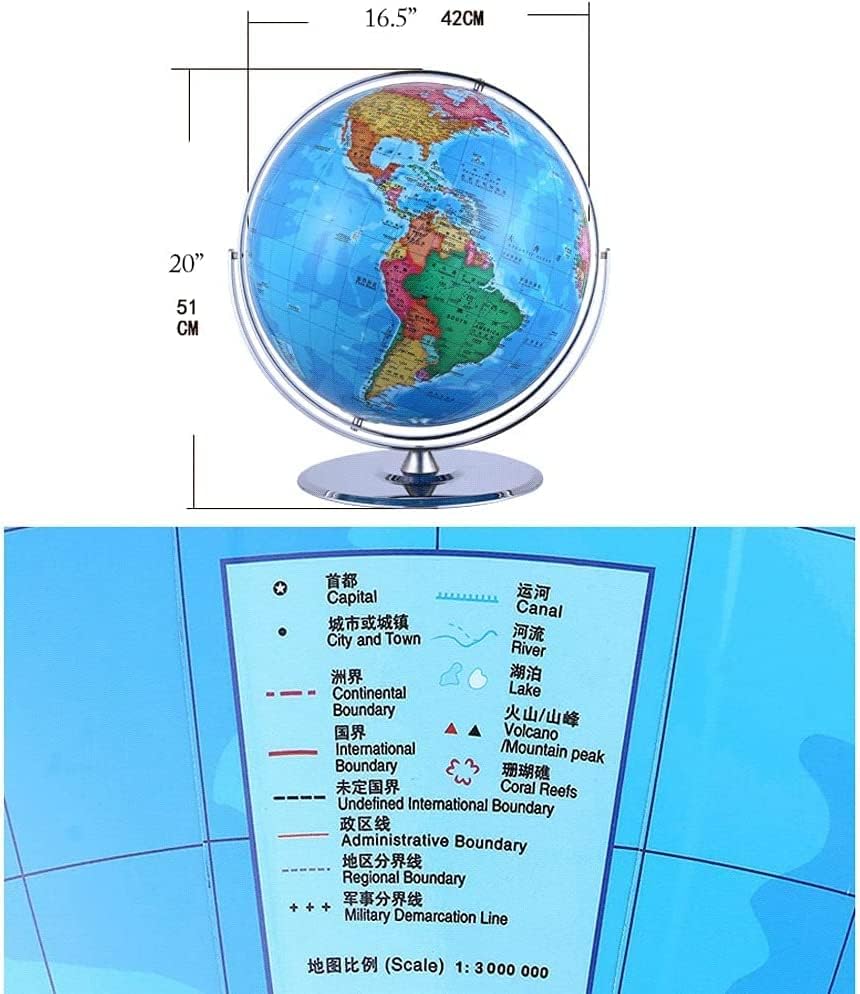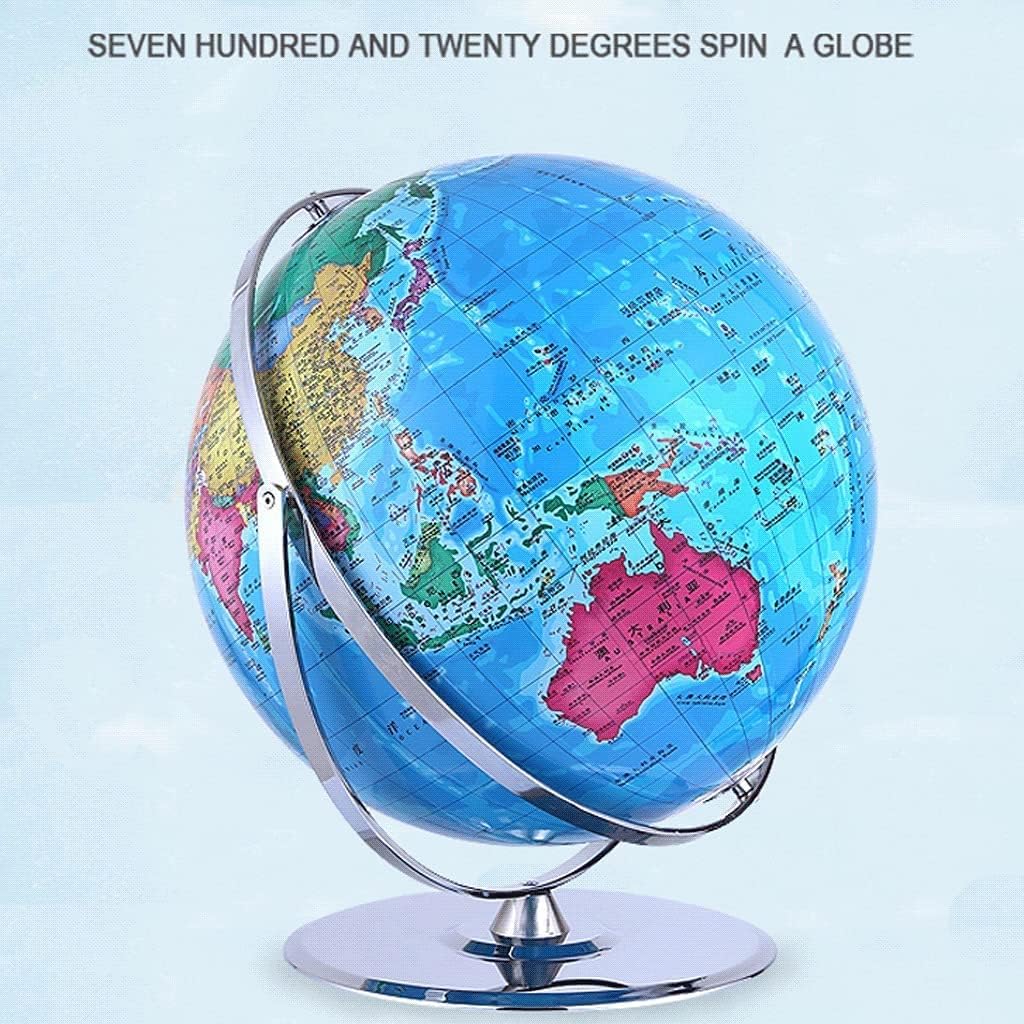 STABILE E DUREVOLE: La superficie del nostro mappamondo è trattata appositamente per scrivere, marcare, ecc., è impermeabile e può essere conservata a lungo con una maggiore durata. Realizzato a mano: l'airbag è realizzato con cura in acciaio inossidabile importato e stampato con informazioni geografiche tedesche a nove colori. Base in acciaio inossidabile lucidato, rotazione di 720°, fissaggio a vite non facile da staccare, indicatori di marcatura accurati, ricco contenuto didattico, base in metallo, bella atmosfera, supporto stabile. ELEGANZA CLASSICA: un mappamondo bello e accattivante, perfetto per le decorazioni della casa e dell'ufficio con un look elegante e moderno o per abbinarsi ai colori della posizione prescelta. Globo geografico educativo: questo mappamondo perfetto è stampato con mappe accurate che segnano chiaramente continenti, oceani, confini nazionali e politici e capitali. Materiale di alta qualità: la staffa metallica è realizzata in lega di alta qualità, resistente, resistente agli urti, durevole e resistente allo sbiadimento.