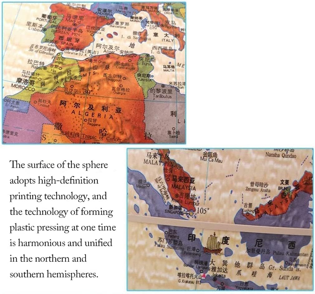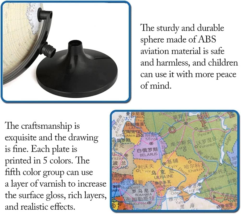 Preciso e dettagliato: globo rotante a 360 gradi, ben realizzato, delicato e chiaro, ecologico e sicuro. Il globo è inclinato di un angolo per simulare l'effettiva inclinazione della Terra sul suo asse. Stampa a cinque colori ad alta risoluzione: lavorazione squisita, grafica raffinata, stampa a cinque colori per ciascun pannello e uno strato di vernice per il quinto gruppo di colori per aumentare la lucentezza della superficie, strati ricchi ed effetti realistici. Materiale ecologico e durevole: la palla robusta e durevole è realizzata in materiale aerospaziale ABS e il supporto in plastica nera è sicuro, quindi i bambini possono usarlo più comodamente. Crea divertimento interattivo: il globo didattico aiuta tuo figlio a esplorare i confini politici del mondo, i continenti oceanici e le città. Questo rende divertente l'apprendimento della geografia! Design dettagliato: vengono aggiunte le caratteristiche popolari dei ventiquattro termini solari nel calendario lunare. La superficie della sfera adotta una tecnologia di stampa ad alta definizione, una tecnologia unica di stampaggio e pressatura della plastica e gli emisferi settentrionale e meridionale sono armoniosamente combinati.