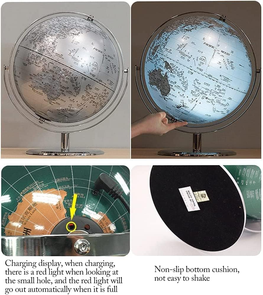 Divertimento: usa questo globo terrestre per espandere i tuoi orizzonti e migliorare la tua conoscenza della geografia terrestre! Offre un modo divertente e conveniente per imparare l'educazione geografica a casa, in classe o in ufficio. Usalo come un espositore accattivante su una libreria o una scrivania. Design della luce touch ricaricabile: tocca la piccola perlina gialla per accendere e spegnere la luce, premi a lungo per regolare la luminosità; può essere utilizzata come luce notturna Serigrafia trasparente: la superficie della sfera non è riflettente, i caratteri sono chiaramente visibili, la superficie della sfera è ricoperta da una pellicola perlata e il cuscinetto inferiore antiscivolo non è facile da scuotere. Finemente lavorati: scala semicircolare, scala di ferro, il valore della scala presenta evidenti protuberanze e il carattere è chiaramente visibile PALLA DECORATIVA PERFETTA: Usala come luce notturna unica per bambini o adulti, o aggiungi un tocco di raffinatezza all'arredamento della tua casa o del tuo ufficio. Distinguiti nel tuo arredamento con questo globo da 10" di diametro con una forma classica e una mappa oceanica colorata