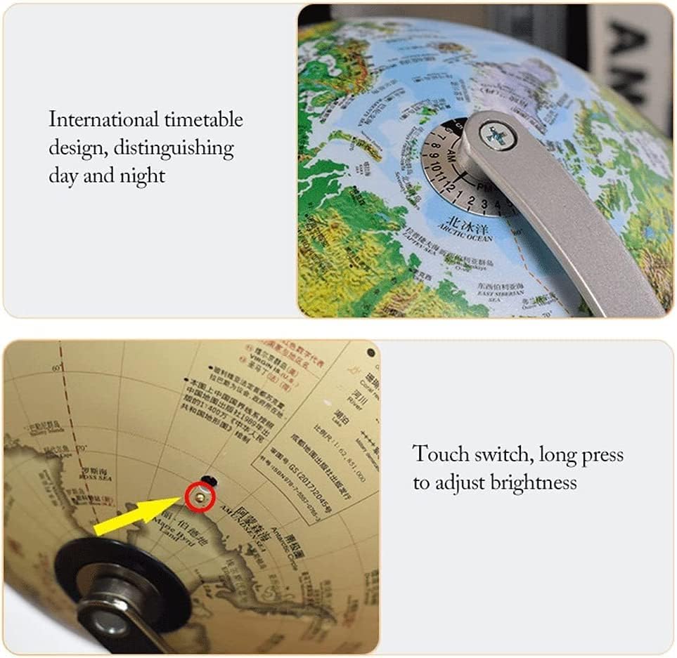 Globo standard avanzato: globo attuale, dettagliato e accurato. Stampa ad alta definizione, il testo è chiaro e di facile lettura. Considera sia l'aspetto che la funzione. Usa il nostro mappamondo per segnare dove sei stato o dove vuoi andare. Interruttore tattile leggero: premere a lungo per regolare la luminosità; progettazione degli orari internazionali, distinguendo giorno e notte; Base in legno: design tridimensionale della montagna in rilievo, più alta è la montagna, più evidente è il rigonfiamento, il colore è semplice, bello e generoso. DIMENSIONE PRATICA: Montato su una resistente base in legno nero, questo mappamondo premium da 30 cm di diametro è a portata di mano per esplorare il mondo con facilità. Crea divertimento interattivo: il globo educativo aiuta tuo figlio a esplorare i confini politici del mondo, i continenti oceanici e le città. Rendi divertente l'apprendimento della geografia!