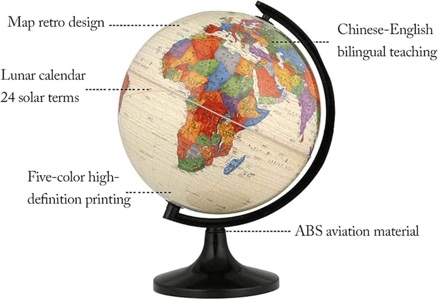 Globo standard avanzato: globo attuale, dettagliato e accurato. Stampa ad alta definizione, il testo è chiaro e di facile lettura. Considera sia l'aspetto che la funzione. Usa il nostro mappamondo per segnare dove sei stato o dove vuoi andare. Materiale ecologico e durevole: la sfera robusta e durevole è realizzata in materiale aerospaziale ABS e il supporto in plastica nera è sicuro, quindi i bambini possono usarlo più facilmente. Crea divertimento interattivo: il mappamondo educativo aiuta tuo figlio a esplorare i confini politici, i continenti oceanici e le città di tutto il mondo. Rendi divertente l'apprendimento della geografia! Progettazione dettagliata: vengono aggiunte le caratteristiche popolari dei ventiquattro termini solari del calendario lunare. La superficie della sfera adotta una tecnologia di stampa ad alta definizione, una tecnologia unica di stampaggio e pressatura della plastica e gli emisferi settentrionale e meridionale sono armoniosamente unificati. Mappamondo decorativo unico: il nostro mappamondo decorativo da scrivania è un pezzo unico e accattivante che aggiungerà stile a qualsiasi scrivania o spazio di lavoro.