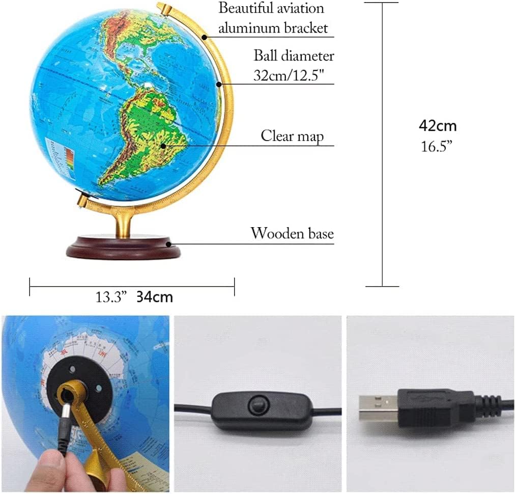 HD e facile da pulire: la pellicola in PVC ecologico di alta qualità ricopre la superficie del globo, migliorando la lucentezza e la nitidezza del testo e dei colori sulla superficie del globo, proteggendo al contempo la superficie del globo, che può essere pulita con una sola passata. Robusto e stabile: il peso del nostro emisfero è di 0,33 kg; utilizzando materiali di alta qualità, la consistenza è fine e uniforme e il posizionamento è stabile Alta qualità visibile: staffa in alluminio aeronautico, sfera ecologica, base in legno. Diametro 32 cm / 12,5 pollici e sicuro: utilizzando una tecnologia avanzata per usare in modo intelligente il colore, sembra molto confortevole. La base è realizzata in legno, che è sicuro e inodore. REGALO PERFETTO: questo mappamondo geografico di ispirazione antica è il regalo perfetto per i viaggiatori appassionati e costituisce il fulcro dell'arredamento della tua casa o come strumento didattico.