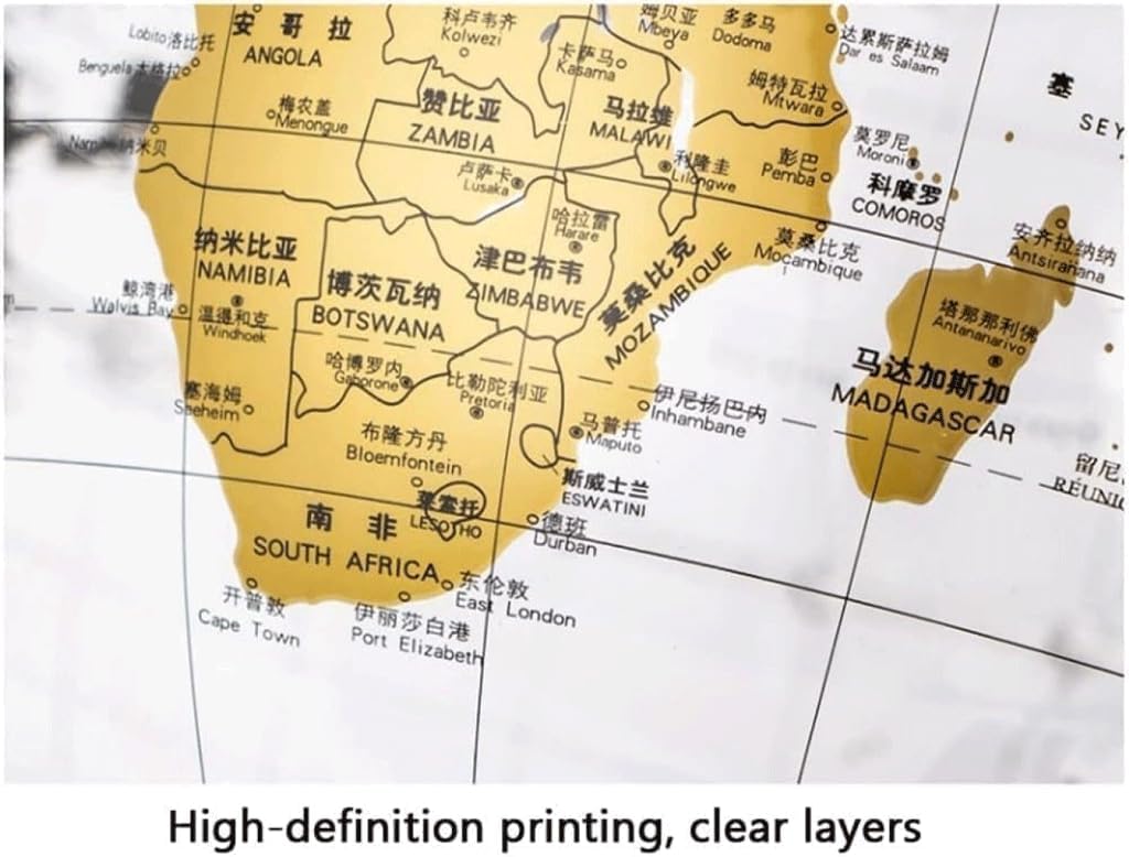 1: Il globo educativo aiuta i tuoi bambini a esplorare i confini politici del mondo, i continenti oceanici e le città, Rende divertente l'apprendimento delle scienze geografiche. 2: La sfera del globo è realizzata in materiale plexiglass (acrilico), che ha una buona permeabilità alla luce e stabilità chimica. La sfera di cristallo è resistente all'usura e impermeabile. 3:Ruota di 360°, la superficie sferica è liscia e morbida, la stampa sulla sfera è chiara, il contenuto è completo ed è facile da ricordare, permettendoti di esplorare ogni angolo del mondo in ogni momento. 4: Un mappamondo dorato/argento, la tecnologia di stampa serigrafica con inchiostro argentato viene utilizzata nell'area politica mondiale e la parte oceanica adotta un design trasparente e la distribuzione dell'area politica è improvvisamente sferica. 5: Rimarrai scioccato da questo bellissimo mondo nuovo di zecca.