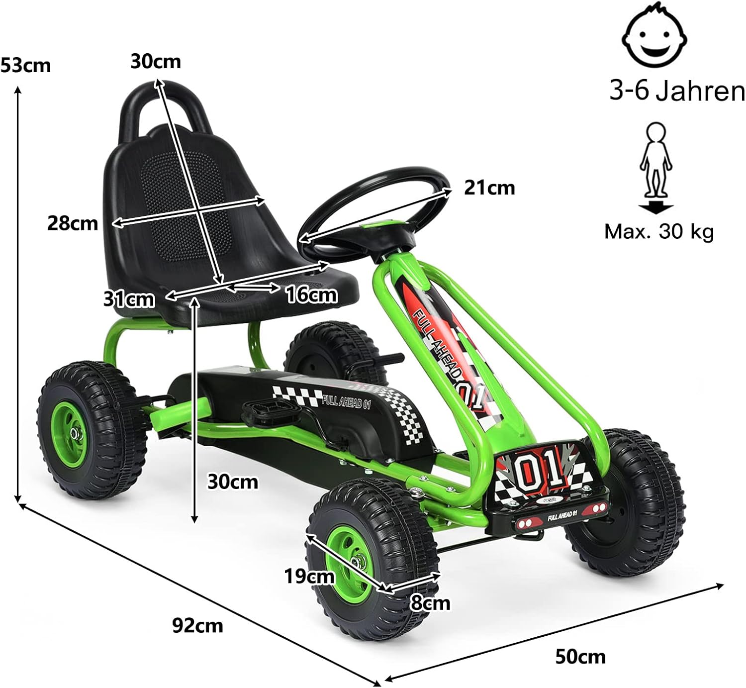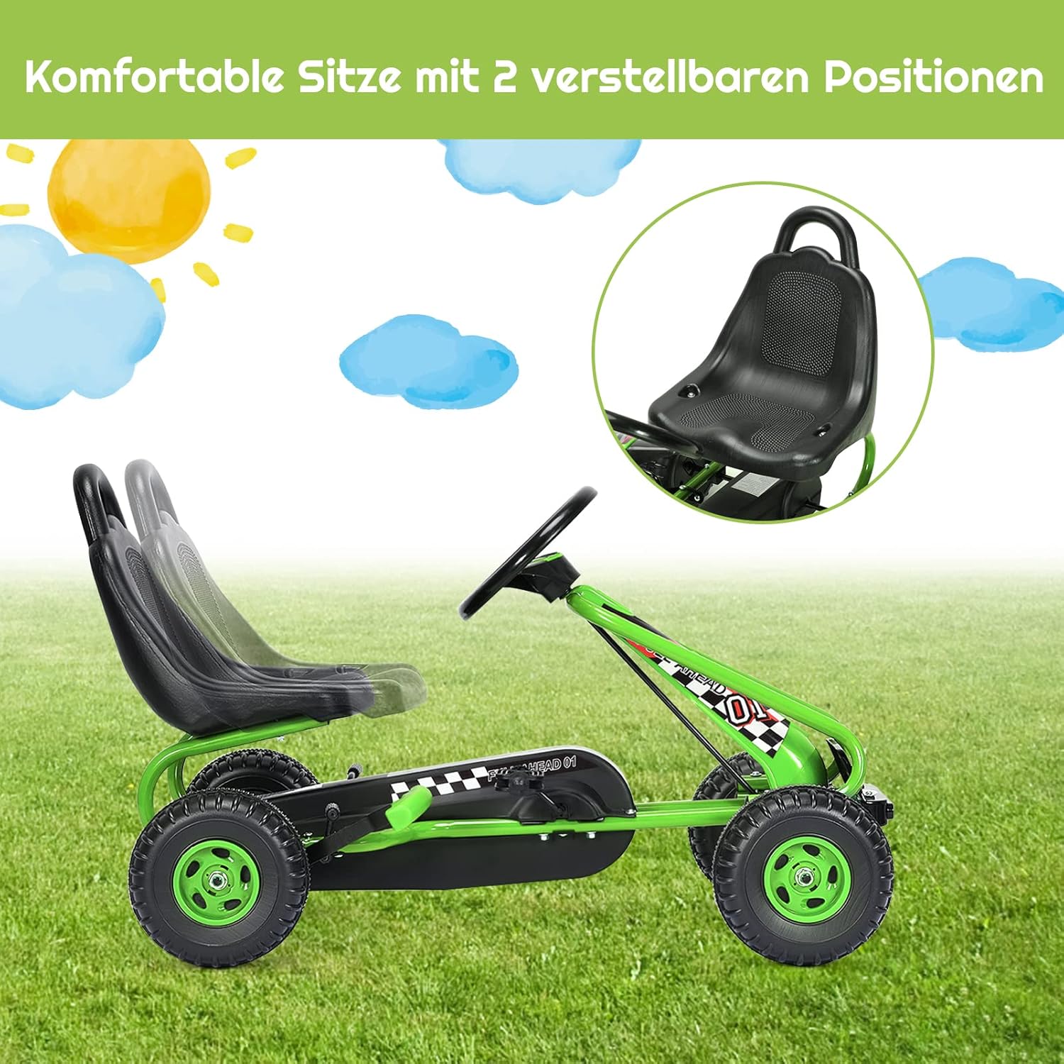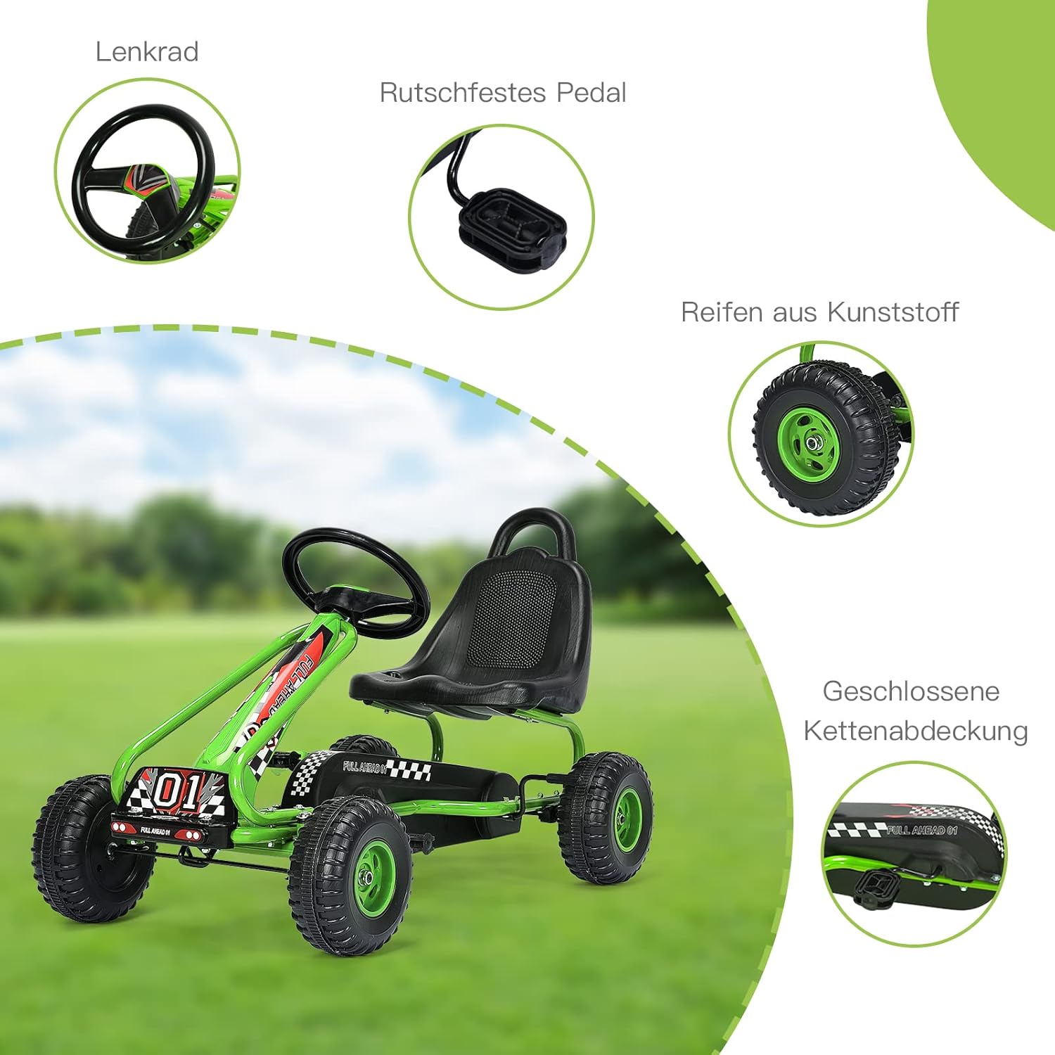🏁 Divertimento di guida senza fine: basta pedalare e girare il volante per spostare il go-kart in avanti, indietro, a sinistra o a destra. Con il nostro go kart tuo figlio potrà divertirsi moltissimo e rimanere attivo allo stesso tempo. 🏁 Sedile regolabile - Il sedile del nostro go-kart può essere regolato in 2 posizioni per adattarsi a bambini di diverse dimensioni. Il go-kart è adatto a bambini dai 3 ai 6 anni. 【Adatto a bambini di altezza 85-110 cm】 🏁 Gioca in sicurezza - Le ruote della macchina a pedali hanno un profilo antiscivolo per una resistenza allo scivolamento ottimale. L'auto a pedali è inoltre dotata di freno a mano che agisce su entrambe le ruote posteriori e di carter catena chiuso. 🏁 Stabile e durevole - Realizzato in ferro robusto e materiale PP di alta qualità, il nostro go-kart è molto stabile e ha una lunga durata. Grazie al robusto telaio in metallo, il nostro go-kart a pedali può sostenere fino a 30 kg. 🏁 Ottimo regalo: con l'aspetto accattivante, il veicolo a pedali può attirare immediatamente l'attenzione dei bambini. È un regalo ideale per tuo figlio in occasione del suo compleanno o di altre festività per regalargli un'infanzia ancora più meravigliosa.