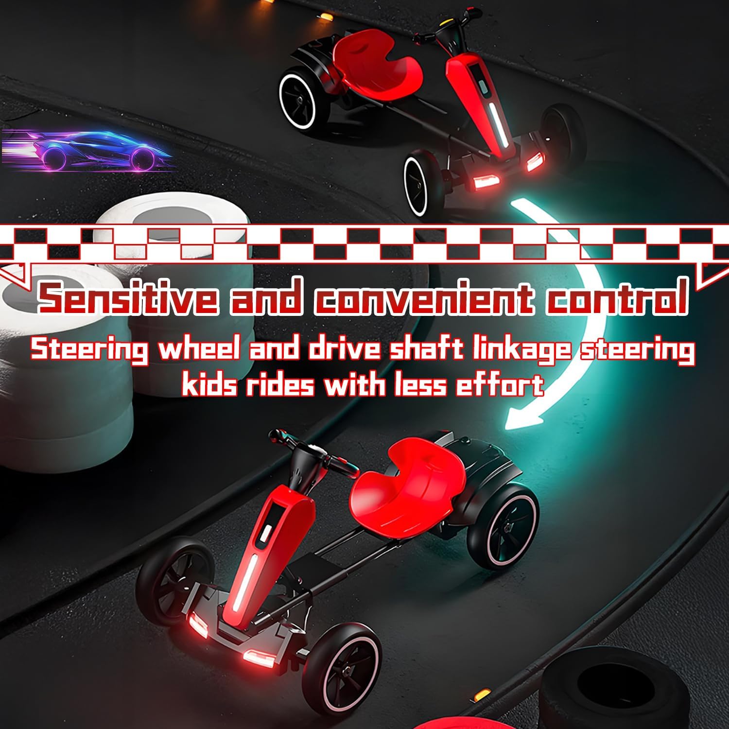 PRESTAZIONI LISCE E AFFIDABILI: dotato di un robusto motore da 390W e di una batteria da 6V7A, questo go-kart elettrico offre prestazioni fluide e affidabili. Il potente motore assicura una corsa entusiasmante, mentre la batteria a lunga durata garantisce ore di divertimento. Con una capacità di peso di 88 libbre, è adatto a un'ampia gamma di giovani piloti. VOLANTE INTERATTIVO: il volante è dotato di comandi per la musica, le luci e la regolazione del volume, per rendere ogni corsa un'esperienza divertente e coinvolgente. I pulsanti di avanzamento e retromarcia consentono ai bambini di navigare facilmente, mentre le funzioni interattive aumentano il divertimento e la sicurezza. Questo go-kart per bambini è il modo perfetto per farli divertire e divertire. COSTRUITO PER DURARE: progettato con un telaio robusto e quattro ruote resistenti all'usura, questo go kart a pedali è costruito per resistere a giochi violenti e a diversi terreni. La struttura resistente assicura prestazioni di lunga durata, rendendolo una scelta affidabile per i genitori e una delle preferite dai bambini. Il sedile regolabile ne accresce la versatilità, per accogliere comodamente i bambini in crescita. DIVERTIMENTO E SICUREZZA NELLE CORSE NOTTURNE: Dotato di luci LED abbaglianti, questo mini kart per bambini assicura un'esperienza di guida divertente e sicura, anche di notte. Le luci vivaci aggiungono emozione a ogni corsa, rendendolo un successo per i bambini che amano distinguersi. Le luci sono facilmente controllabili tramite il volante, aggiungendo un ulteriore livello di interattività. DESIGN PIEGHEVOLE PER UN FACILE STOCCAGGIO E TRASPORTO: questo go-kart elettrico per bambini può essere piegato e dispiegato senza sforzo in un solo gesto, rendendolo facile da riporre e trasportare. Con una dimensione compatta di 33x12x10 pollici, il suo design salvaspazio è una scelta conveniente per i genitori e garantisce ai bambini un divertimento senza fine.