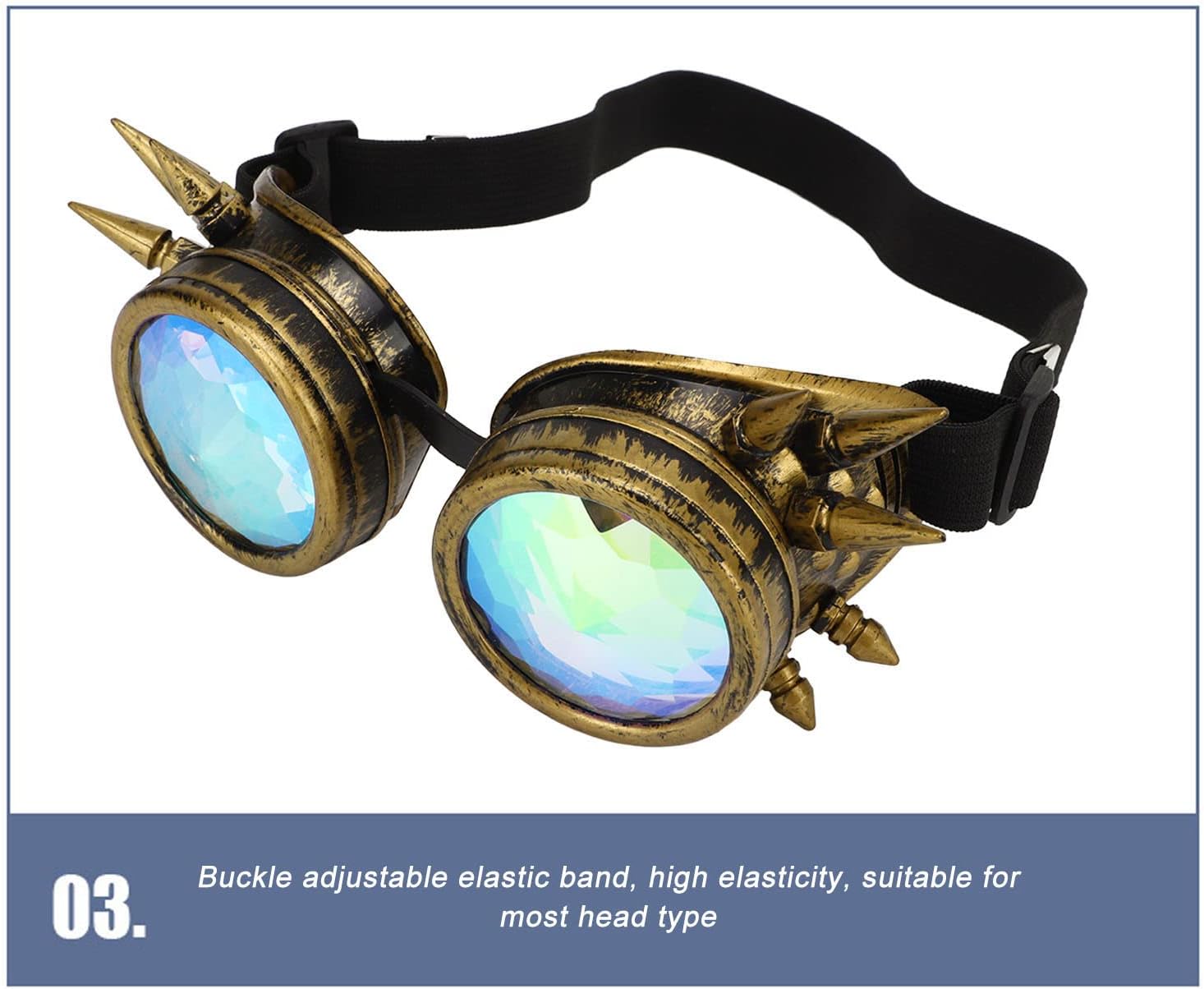 Elegante design Steampunk: distinguersi con il design delle lenti in cristallo arcobaleno di questi occhiali, aggiungendo un tocco fresco e bello al tuo outfit, ideale per Halloween. Adattamento regolabile per tutti: con nasi regolabili, questi occhiali a steampunk psichedelici trippy possono adattarsi comodamente a facce grandi e piccole. Uso versatile: che si tratti di eventi vintage, decorazioni, feste o celebrazioni di Halloween, questi occhiali di caleidoscopio sono un ottimo accessorio vasta gamma di occasioni. Squisiti lenti del caleidoscopio: gli occhiali di caleidoscopio Glofx Wormhole sono dotati di intricati artigianato e un design retrò, adatto alla creazione di effetti visivi accattivanti. Abbigliamento comodo: gli occhiali a vapore arcobaleno sono dotati di una fascia elastica regolabile alla fibbia che offre elevata elasticità, garantendo una vestibilità aderente per la maggior parte delle forme di testa.