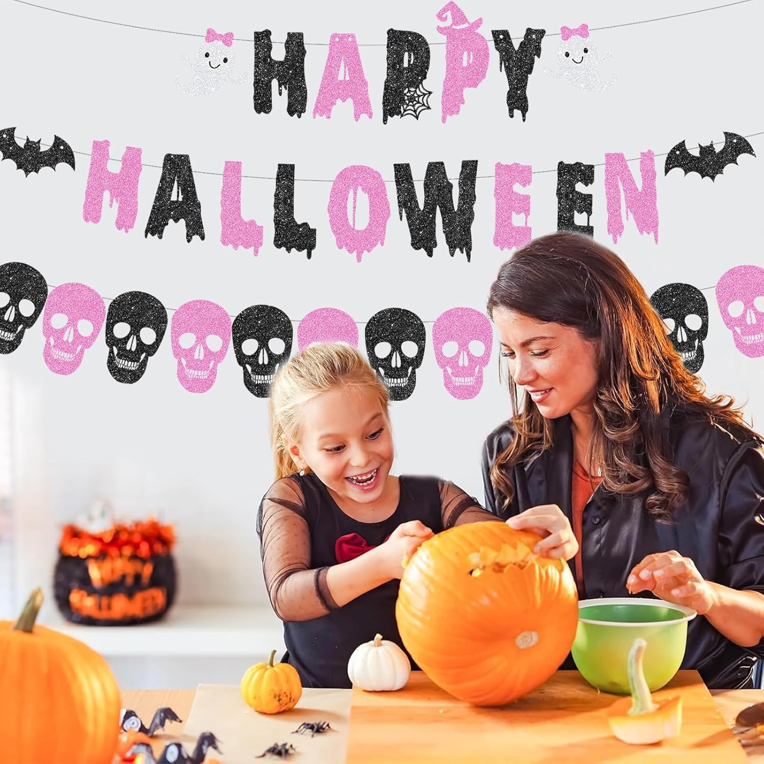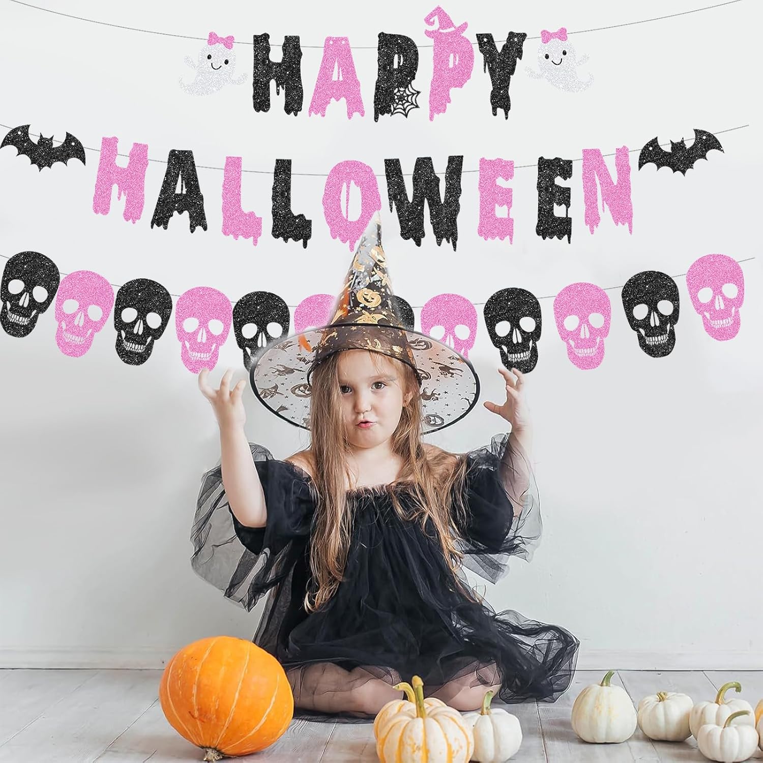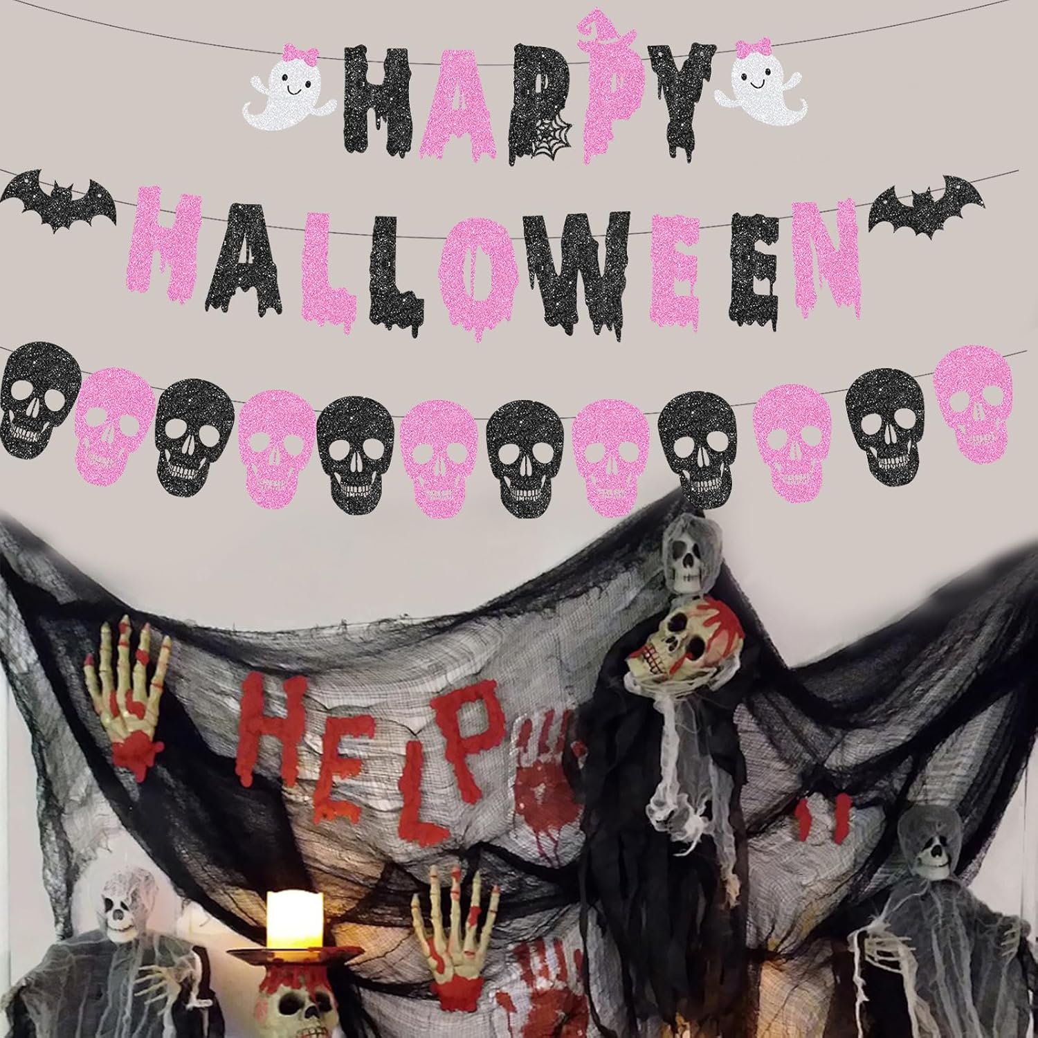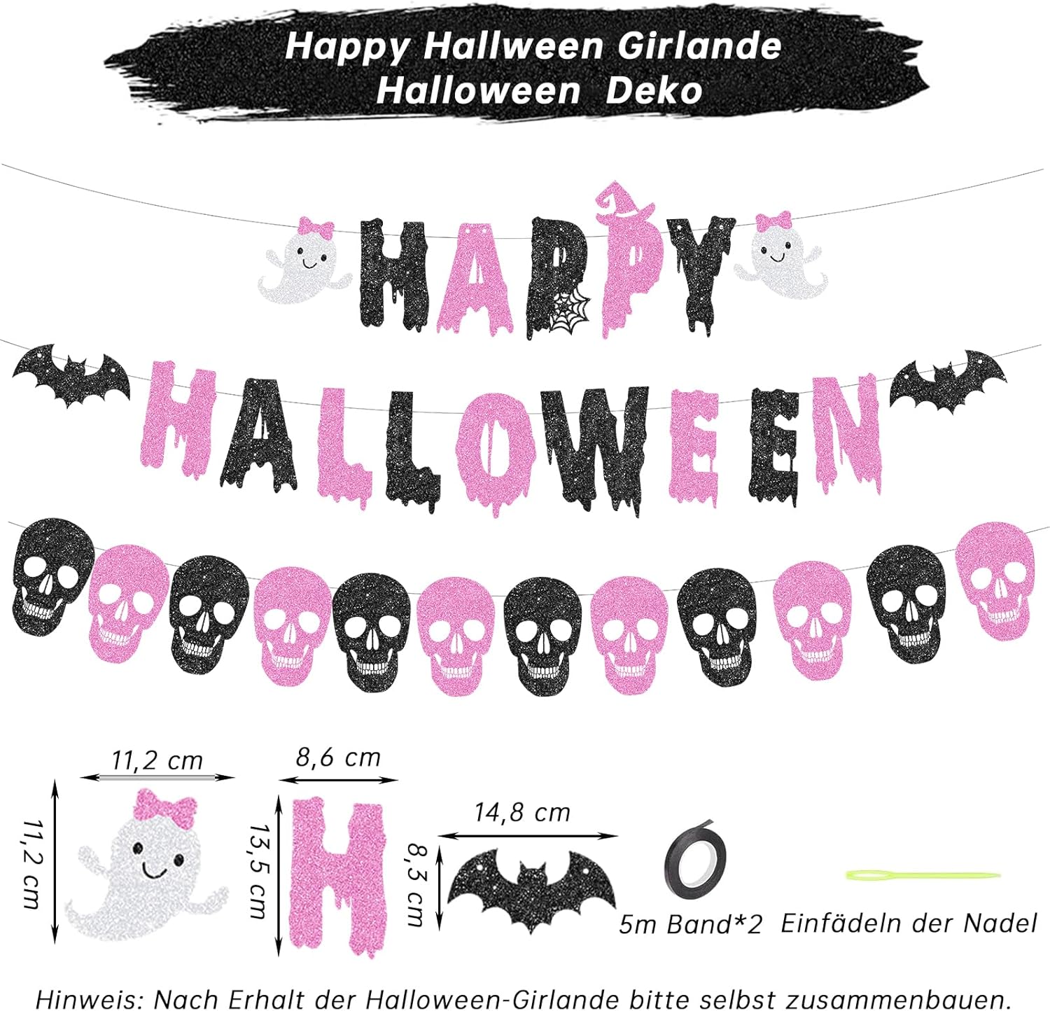 Decorazione festiva: set di 3 ghirlande di Halloween in rosa e nero con fantasmi, scritta "Happy Halloween" e motivo teschio Materiale e dimensioni: ghirlande di iuta di alta qualità con una lunghezza totale di 300 cm, leggera e robusta per diverse possibilità di decorazione Montaggio semplice: pronto all'uso senza attrezzi, ideale da appendere a pareti, porte o come decorazione per finestre Versatile: perfetto per feste di Halloween, eventi a tema o come suggestiva decorazione autunnale DESIGN DUREVOLE: costruzione non fragile, riutilizzabile per diverse stagioni di Halloween