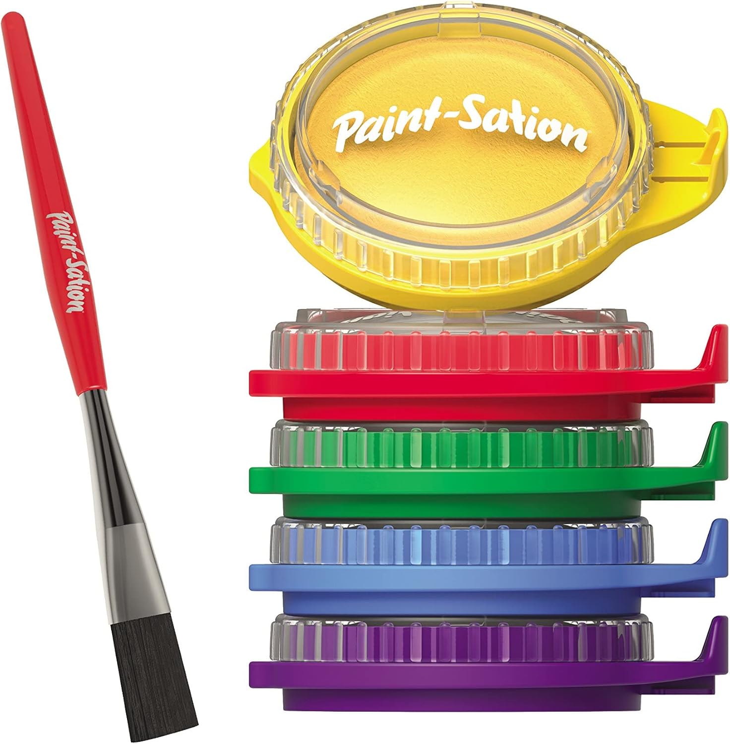 Questo gioco creativo Paint-statio è una nuova esperienza di pittura! Dipingere in modo pulito è ora possibile con questo kit di pittura. La vernice non scorre anche se il barattolo cade e non richiede l'aggiunta di acqua. ! 5 colori: viola, blu, verde, giallo e rosso Pulito Colori vivaci Vernice lavabile Vasi impilabili