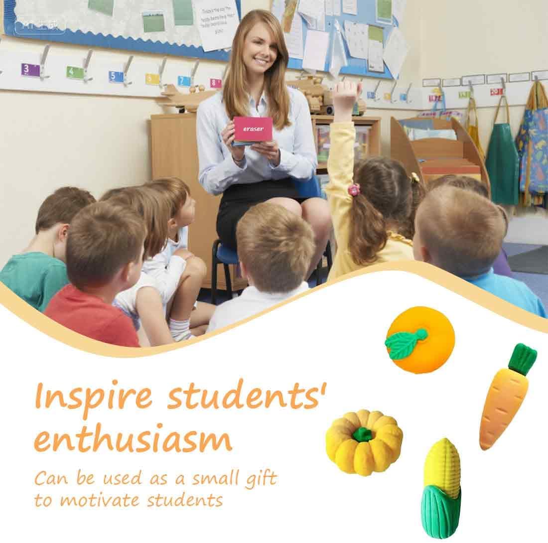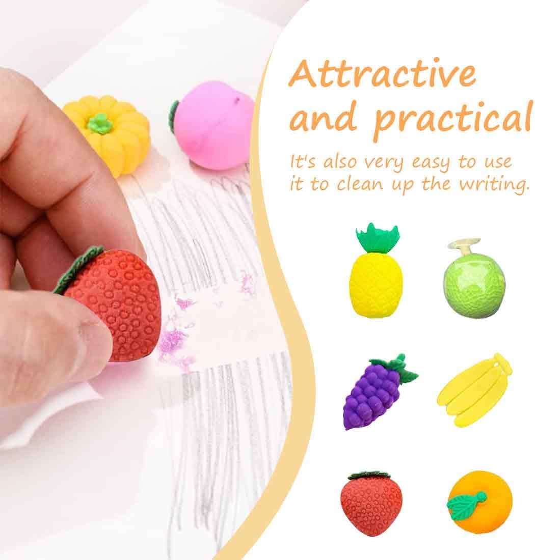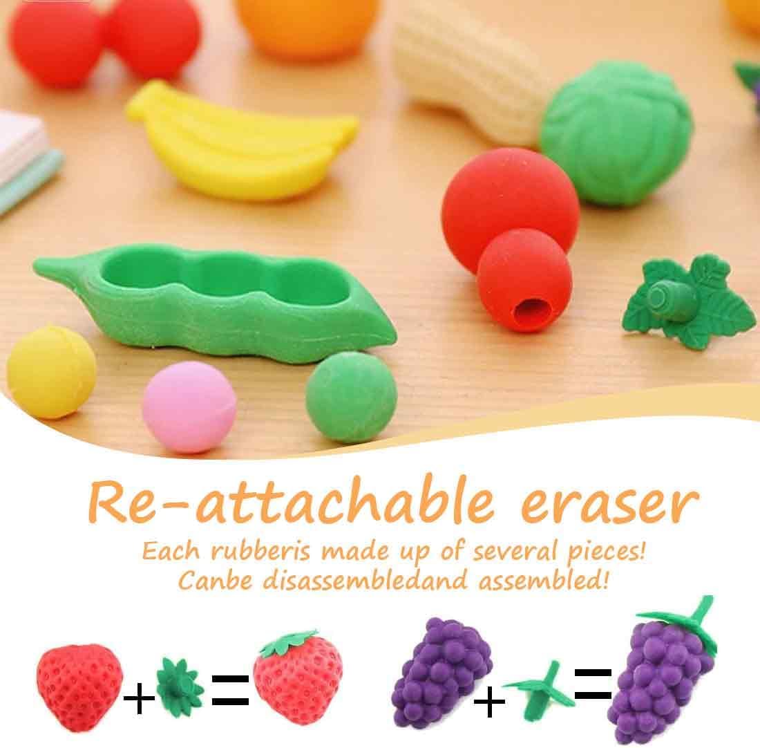 Ricco di design: caratterizzate da forme vivaci e realistiche ispirate a fragole, ananas, carote e altri frutti e ortaggi, queste gomme catturano immediatamente l'attenzione, rendendo più divertente l'apprendimento e la scrittura, particolarmente apprezzate dai bambini. Design modulare: ogni gomma è composta da più componenti staccabili che possono essere assemblati e smontati liberamente. Utilizzabili sia come pratici articoli di cancelleria che come giocattoli in miniatura, offrono il divertimento della costruzione durante le pause, migliorando l'esperienza dell'utente. Pratiche ed efficienti: vantano eccellenti capacità di cancellazione, rimuovono senza sforzo i segni di matita senza lasciare residui, mantenendo le superfici pulite e soddisfacendo le esigenze quotidiane di correzione. Supporto didattico: il design innovativo e accattivante le rende ideali come ricompense in classe, motivando gli alunni e aiutando gli insegnanti a promuovere l'entusiasmo per l'apprendimento e a rendere più vivaci le lezioni. Facilita l'apprendimento senza sforzo: il suo aspetto affascinante allevia la tensione e la monotonia durante la scrittura, in particolare per i bambini. Questo riduce l'ansia per gli errori, consentendo loro di impegnarsi più facilmente nello studio.