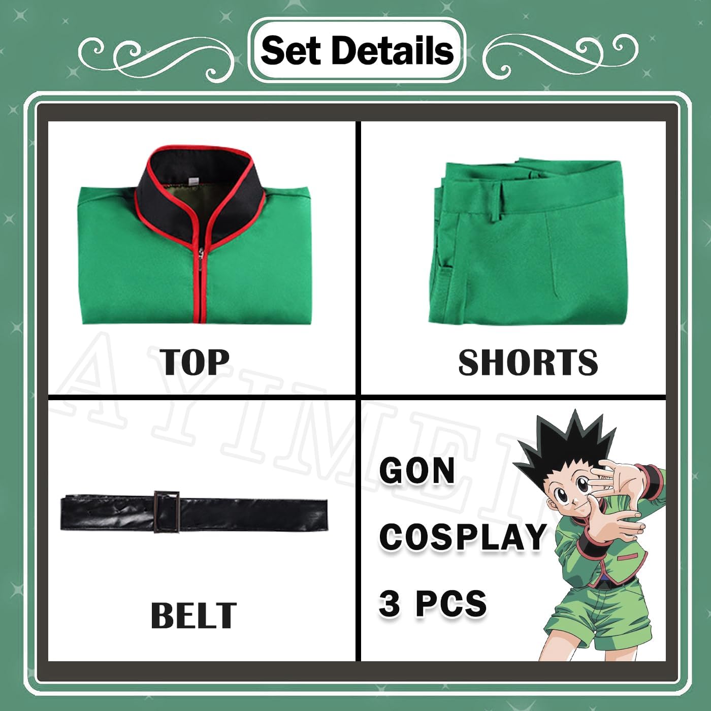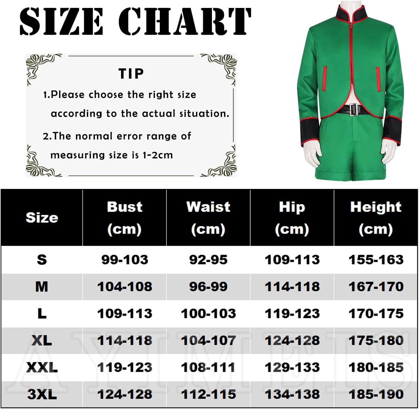 【Il pacchetto include】 - Top *1, Pantaloncini *1, Cintura *1 (come mostra l'immagine). 【Materiale principale】 - Poliestere. Realizzato in materiale di alta qualità, morbido, comodo da indossare e abbastanza resistente. 【Caratteristiche dell'abbigliamento】 - Costume Cosplay di Hunter X Hunter Gon Freecss, Ripristinando i dettagli dell'abbigliamento di un personaggio animato, con un set completo di accessori, consente di completare facilmente il gioco di ruolo. 【Ampia applicazione】 - Perfetto per feste in costume a tema, festival, Natale, Halloween, carnevali, feste, performance sul palco, fotografia, Comic Con, Cosplay ecc. 【Riferimento taglia】 - Per assicurarti di ottenere una taglia adatta a te, fare riferimento alla nostra tabella delle taglie prima dell'acquisto (ultima foto).