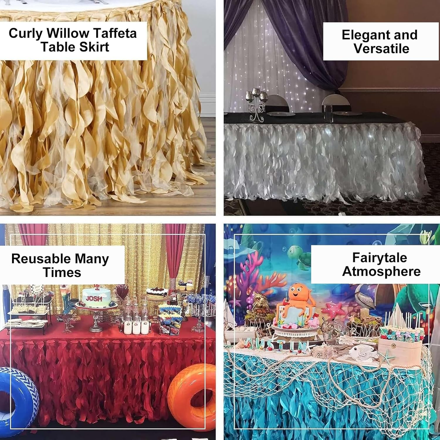 Squisita fattura: realizzata in raso accuratamente cucito e rifinita con materiale lucido, la gonna da tavolo offre un aspetto liscio e di alta qualità con dettagli raffinati Design a strati con arricciature: l'esclusivo stile a arricciature in salice della gonna da tavolo, combinato con un taffetà lucido, crea un dinamico effetto a strati, aggiungendo un tocco elegante e lussuoso a qualsiasi apparecchiatura Punto focale visivo: le pieghe scintillanti della gonna da tavolo riflettono la luce in modo splendido, diventando immediatamente il fulcro di matrimoni, feste o eventi speciali Decorazione rapida: dotata di attrezzo per incollare per una facile installazione e rimozione, risparmiando tempo nei preparativi dell'evento e mantenendo un aspetto raffinato Versatile: perfetta per tavoli da ricevimento di nozze, tavoli per torte o regali, postazioni per la firma e decorazioni per feste, valorizzando perfettamente vari stili di celebrazione