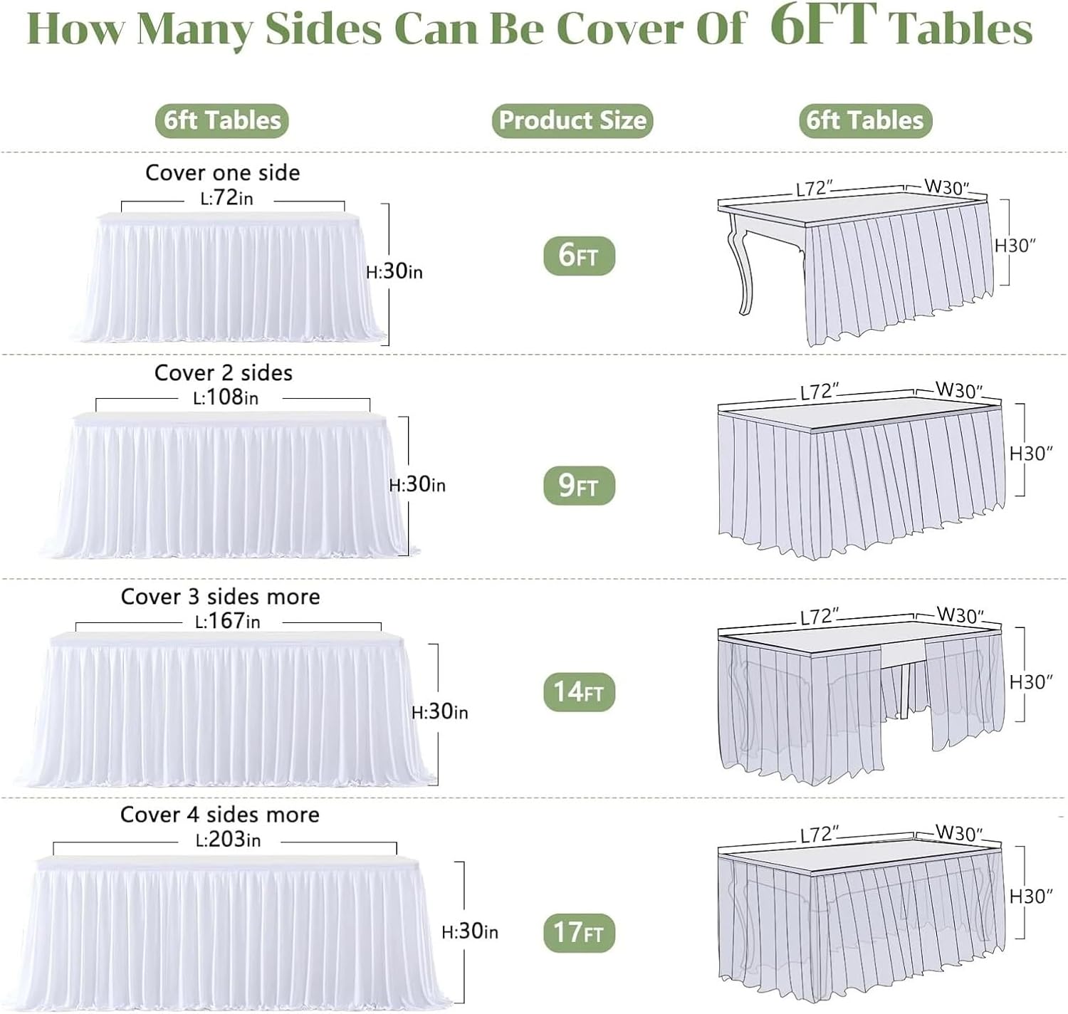 Perfetto per ogni evento: La gonna da tavolo aggiunge un tocco di eleganza alle tue celebrazioni, trasformando ogni tavolo in un elemento centrale accattivante Soluzione decorativa versatile: I tavoli con gonne sono la scelta ideale per matrimoni, feste di compleanno e eventi aziendali, adattandosi facilmente a diverse occasioni Facile da gestire: Queste gonne da tavolo sono progettate per un montaggio e smontaggio rapidi, rendendole perfette per gli ospiti impegnati che desiderano un allestimento semplice Migliora la tua presentazione: Aggiungendo una gonna da tavolo, crei un'atmosfera curata che facilita la messa in risalto di cibo, decorazioni e altri elementi importanti Decorazione elegante per tavoli: Le gonne da tavolo non solo offrono funzionalità ma arricchiscono anche l'aspetto del tuo allestimento, assicurando un ambiente invitante e raffinato