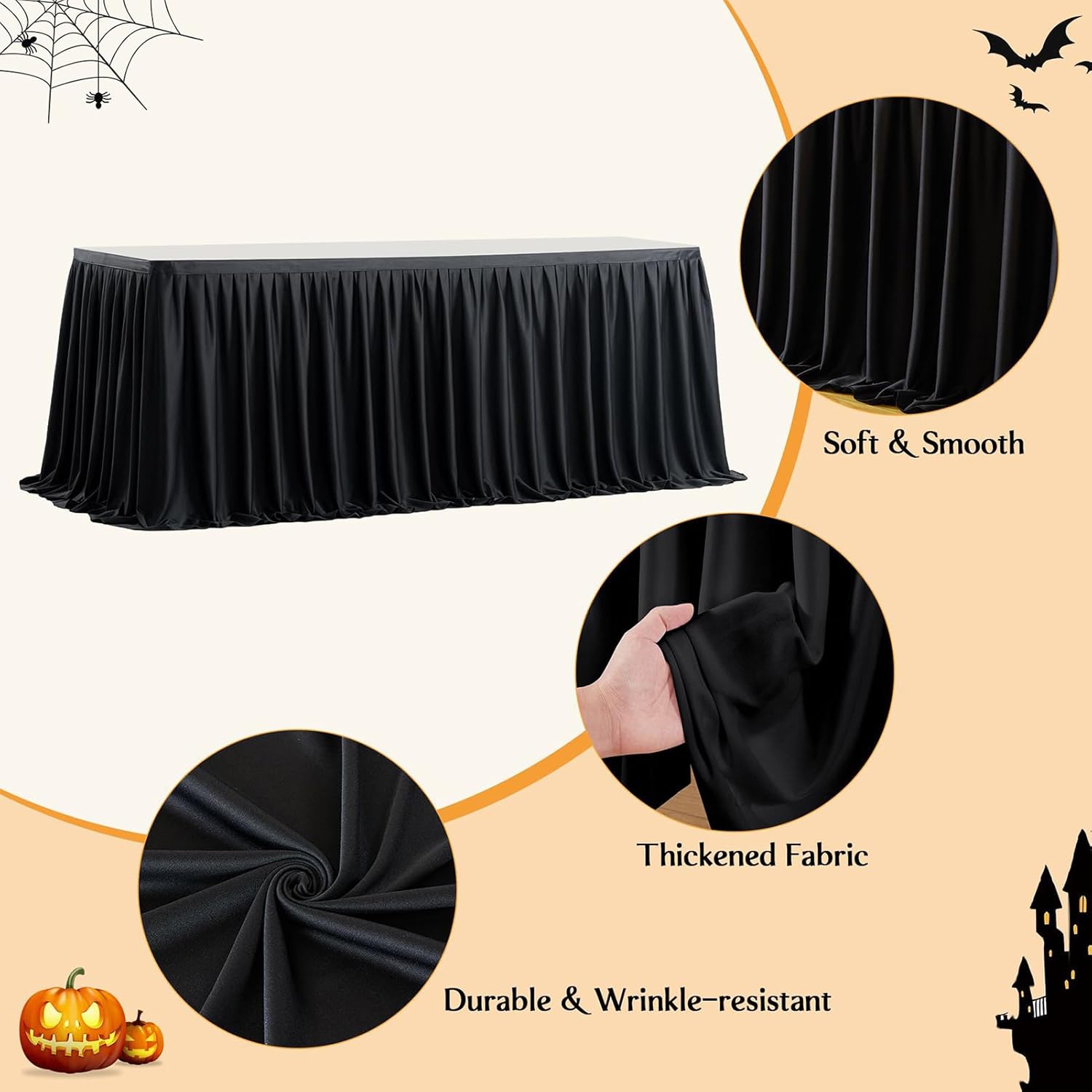 Durabilità assicurata: realizzata in poliestere di qualità, questa tenda da tavolo è morbida e confortevole, fornisce resistenza affidabile e riutilizzo multiplo per un uso regolare creando allo stesso tempo un aspetto elegante per i tuoi eventi. Eleganza dell'evento: migliora la tua decorazione con questa esclusiva gonna da tavolo a pieghe. Il suo design increspato incorpora un tocco di eleganza senza tempo, trasformando semplicemente con grazia gli spazi di nozze o ricevimenti formali. Soluzione compatta: ripiega senza sforzo la gonna da tavolo inutilizzata per riporla facilmente, ottimizzando in modo efficiente lo spazio di archiviazione. Versatilità d'uso: adatta per Halloween, Natale, matrimoni, compleanni, battesimi, carnevali, banchetti e lauree. Questo modello si adatta a tutte le occasioni speciali impreziosendo l'atmosfera dei tuoi eventi grazie al suo design universale ed elegante. Installazione semplice: il meccanismo di fissaggio tramite striscia adesiva e clip consente un rapido posizionamento attorno ai tavoli, elimina sforzi inutili per un risultato pulito