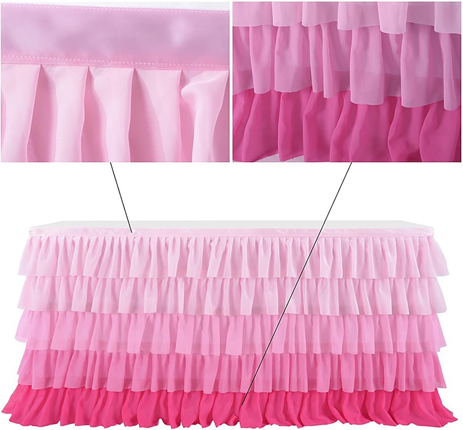 Elegante design a strati: morbidi strati di chiffon creano una lussuosa gonna da tavolo, dall'aspetto fluido, che trasforma all'istante qualsiasi tavolo in un affascinante punto focale per feste e celebrazioni speciali Ampie opzioni di dimensioni: disponibile nelle lunghezze 185 cm e 275 cm, adatta sia per tavoli rettangolari che rotondi, offrendo una copertura versatile per tavoli da dessert, espositori per torte o buffet Leggera e ariosa: realizzata in tessuti leggeri di alta qualità, la gonna aggiunge volume e dimensione senza sopraffare il tavolo, offrendo un'estetica delicata ed elegante Scelta di colori vivaci: rosa pastello, sfumature arcobaleno e tonalità ispirate alle sirene conferiscono un tocco giocoso e stravagante, perfetto per compleanni a tema, baby shower ed eventi festivi Stile creativo per le feste: i volant e le morbide texture della gonna da tavolo a strati consentono un facile abbinamento con decorazioni, allestimenti per torte e centrotavola, rendendo il tuo evento visivamente sbalorditivo
