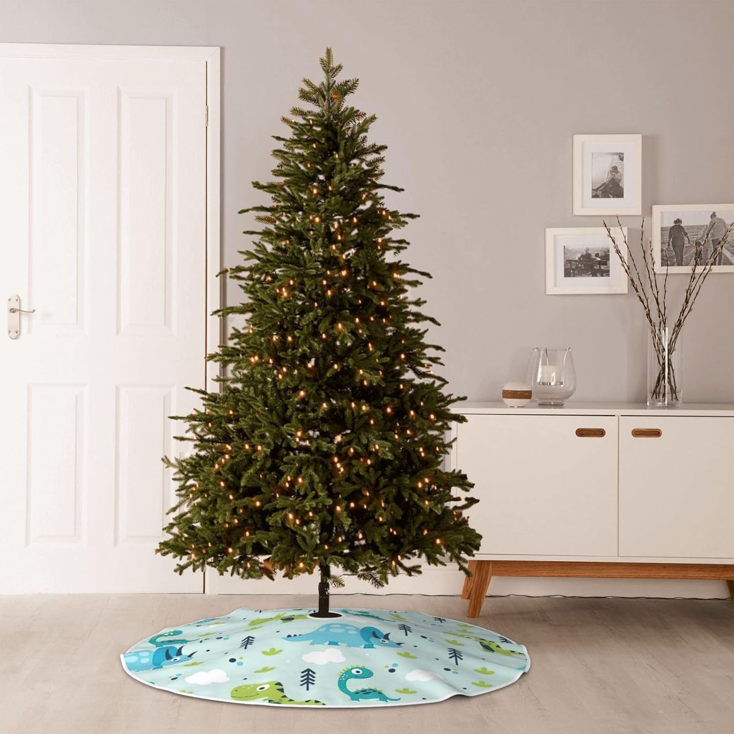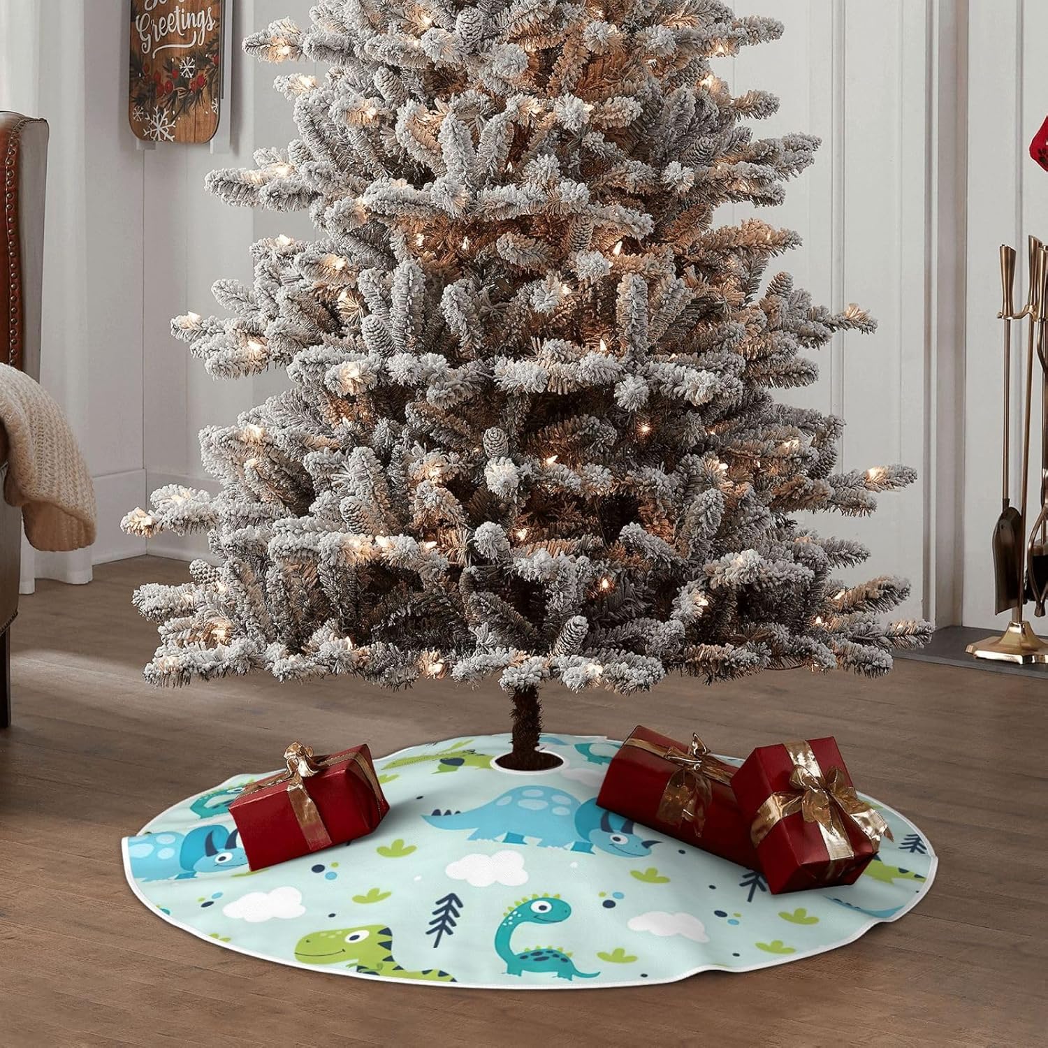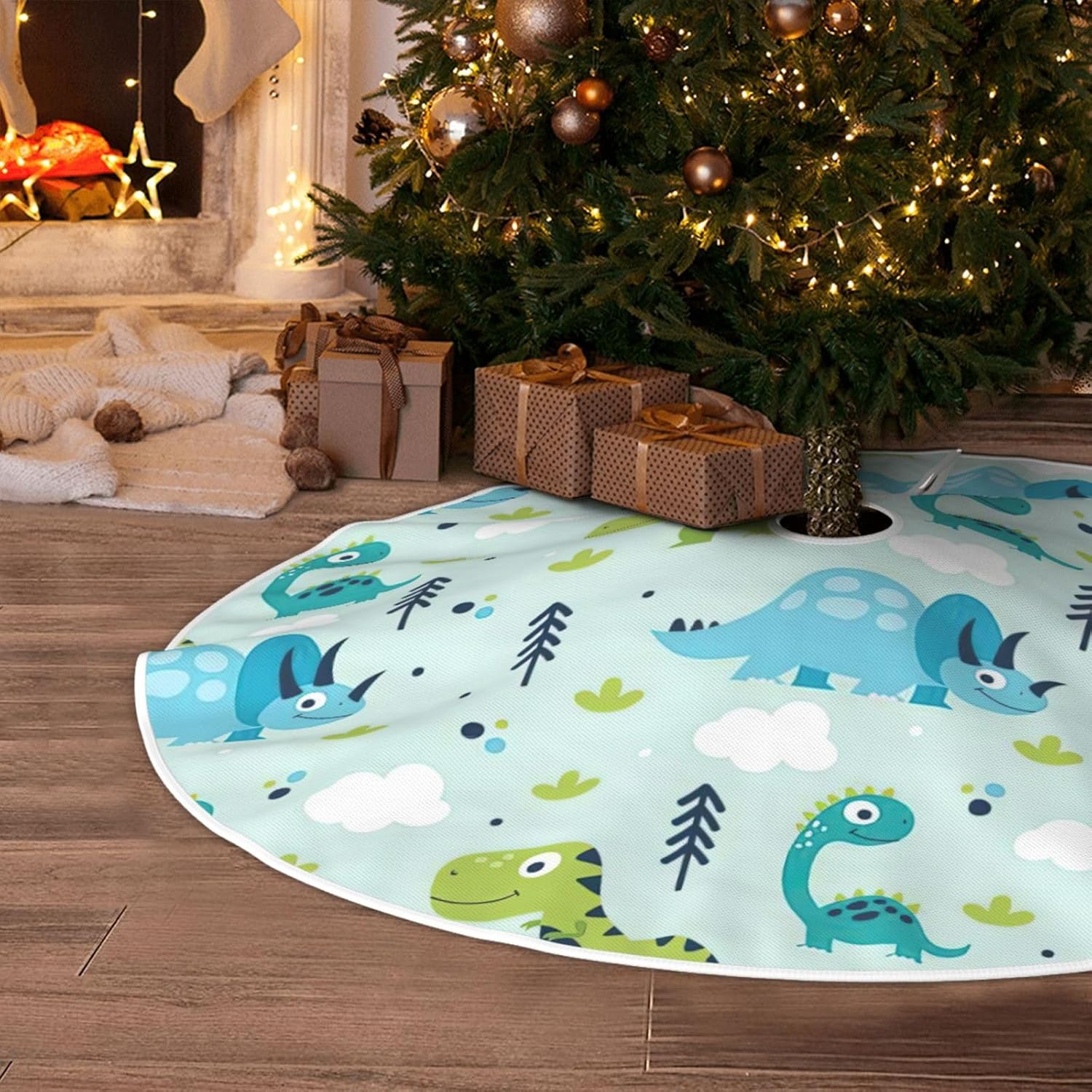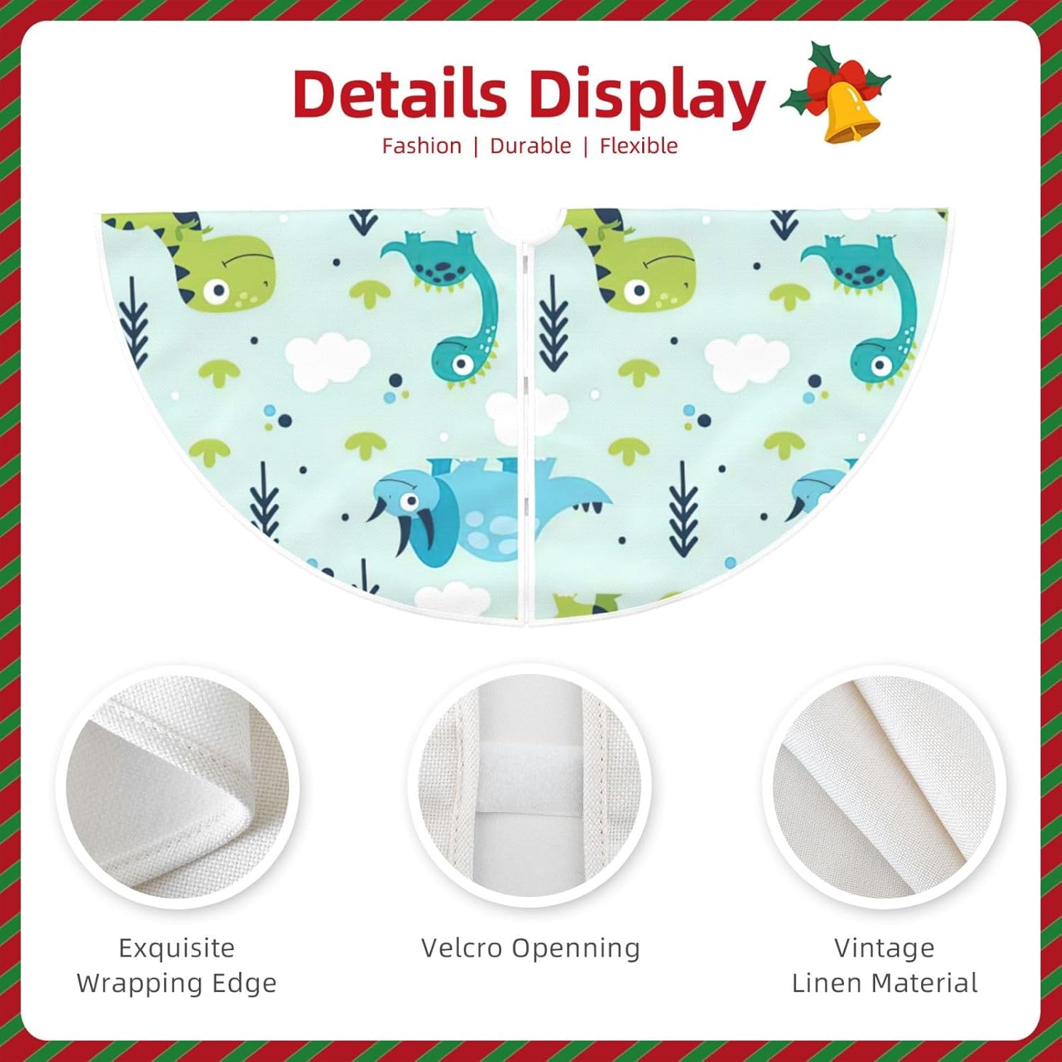 DESIGN CON STAMPA COMPLETA DA 48" PER UN'ATMOSFERA FESTIVA: la gonna per albero di Natale con vivace stampa all-over di motivi di dinosauri esalta le tue decorazioni natalizie, perfetta per le celebrazioni di Natale, Halloween e Capodanno, aggiungendo un fascino allegro a qualsiasi spazio interno o esterno. TESSUTO SIMILE AL LINO DI ALTA QUALITÀ (100% POLIESTERE): Realizzata in tessuto composito di lino di alta qualità, questa resistente gonna per albero resiste allo sbiadimento e all'usura, mantiene colori brillanti e una trama elegante con un uso stagionale ripetuto. Molteplici opzioni di rifinitura personalizzazione Stile: scegli tra 3 finiture eleganti per abbinarle al tuo tema festivo, migliora l'attrattiva visiva per Natale, eventi comunitari, spettacoli teatrali o decorazioni per feste. Apertura facile da installare con benda o velcro: avvolge saldamente la base dell'albero con 3 bende regolabili (45 cm) o robuste chiusure in velcro, consente una rapida installazione e rimozione mantenendo la gonna saldamente in posizione. cerimonie annuali, promozioni al dettaglio e protezione del pavimento festivo a casa o in ufficio.