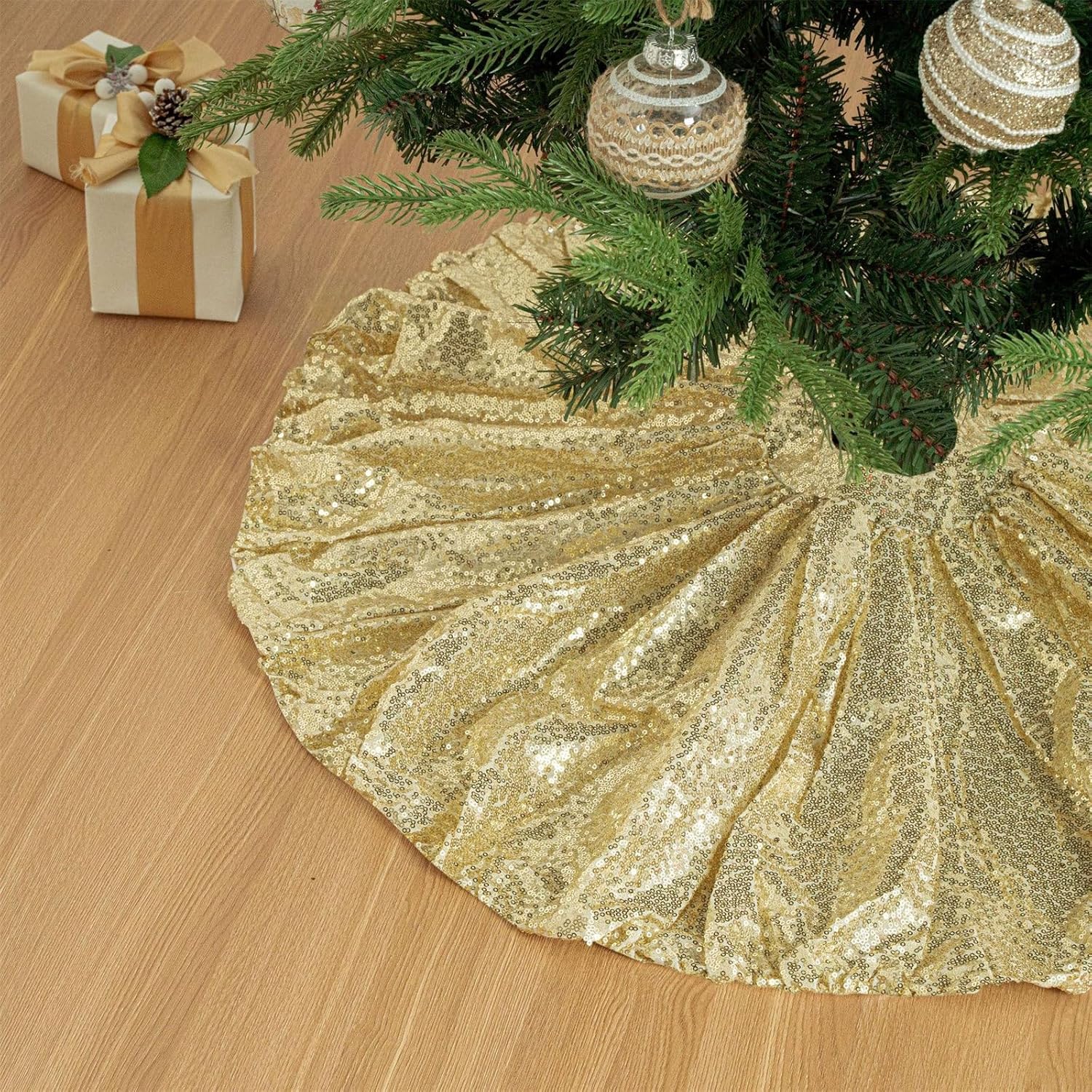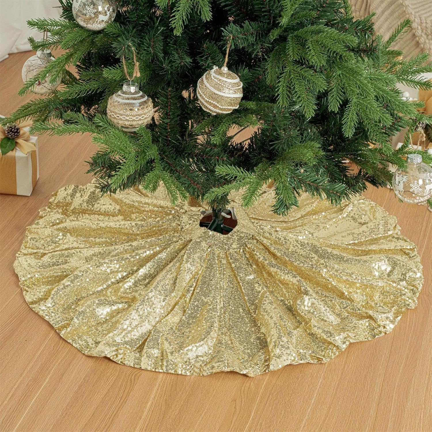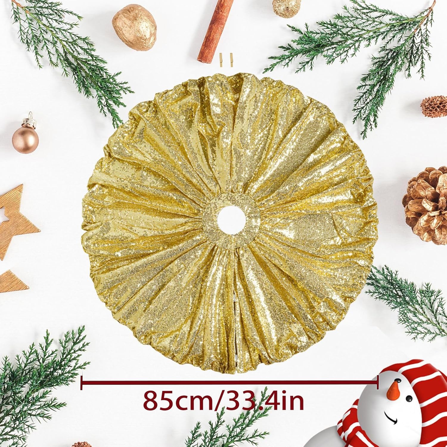 Perfetta per casalinghe impegnate, consumatori e chiunque abbia bisogno di un immediato fascino festivo senza complicati assemblaggi Presenta un innovativo e facile sistema di installazione con orlo elastico Realizzata in poliestere con cuciture rinforzate, questa scintillante gonna per albero mantiene colori e forma brillanti durante diverse stagioni festive Per un'atmosfera magica in uffici, esposizioni di negozi ed eventi festivi Illumina le tue decorazioni natalizie con questa gonna per albero di Natale con paillettes. La gonna dell'albero di Natale si illumina sotto le luci
