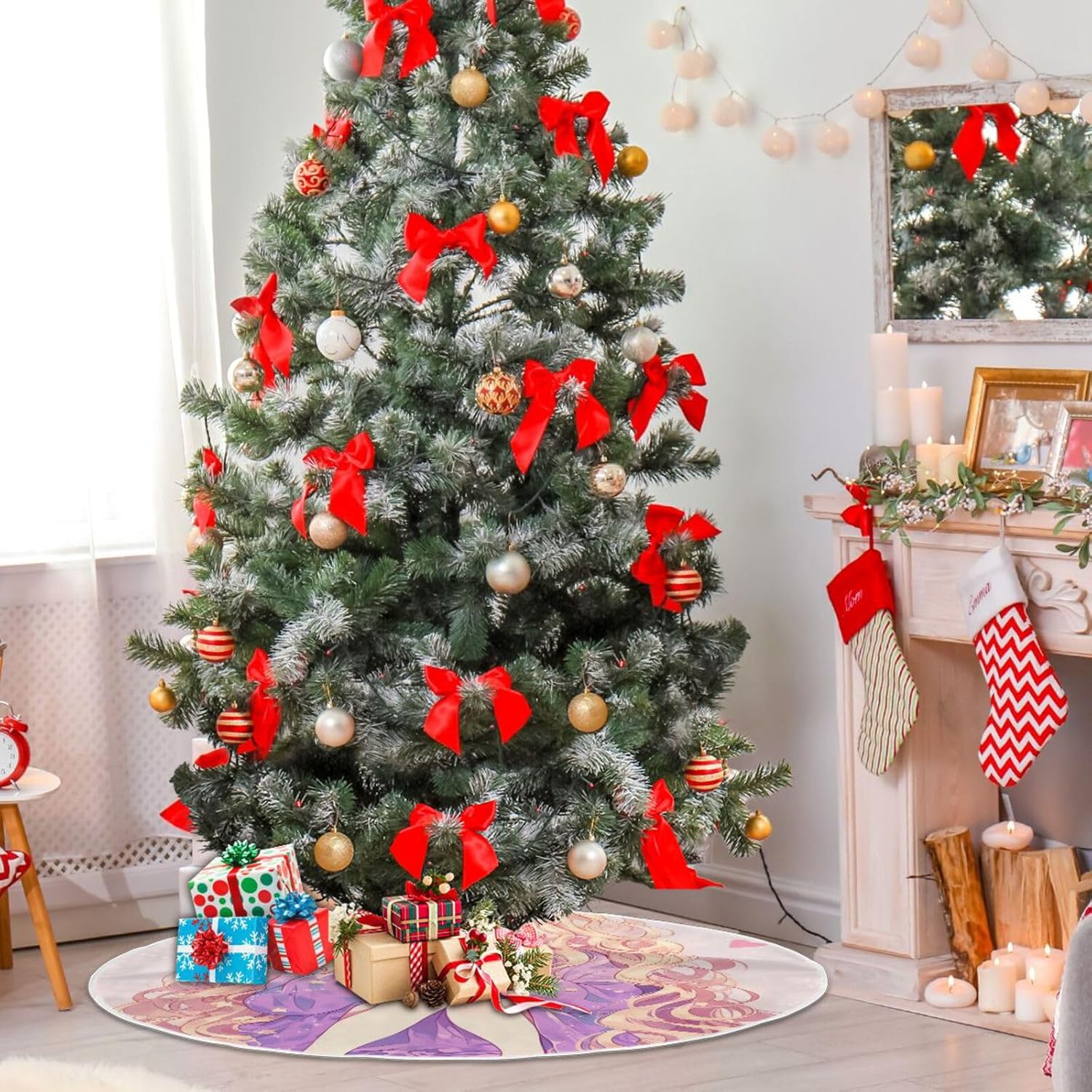 Due misure tra cui scegliere: la gonna grande per albero di Natale è di 120 cm, la gonna piccola per albero di Natale è di 90 cm. Materiale ultra morbido: la decorazione dell'albero di Natale è realizzata in poliestere. Le nostre gonne per albero di Natale sono spesse, comode e morbide. MANTIENI IL PAVIMENTO PULITO E ORDINATO - Questa gonna per albero funge da raccoglitore per aghi di pino o ornamenti caduti, protegge anche il tappeto dagli aghi degli alberi. Facile da usare: il design di apertura è facile da installare, le decorazioni dell'albero di Natale possono essere aperte o chiuse grazie a tre fasce magiche invisibili, che ne facilitano l'uso. La coperta si fissa facilmente senza doversi piegare per legare più cavi. Facile da usare, facile da attaccare, facile da pulire, lavabile in lavatrice. Facile da pulire: lavabile in lavatrice e lavabile a mano. Si prega di asciugare la gonna dell'albero in un luogo fresco, evitando di esporla alla luce solare per lungo tempo.