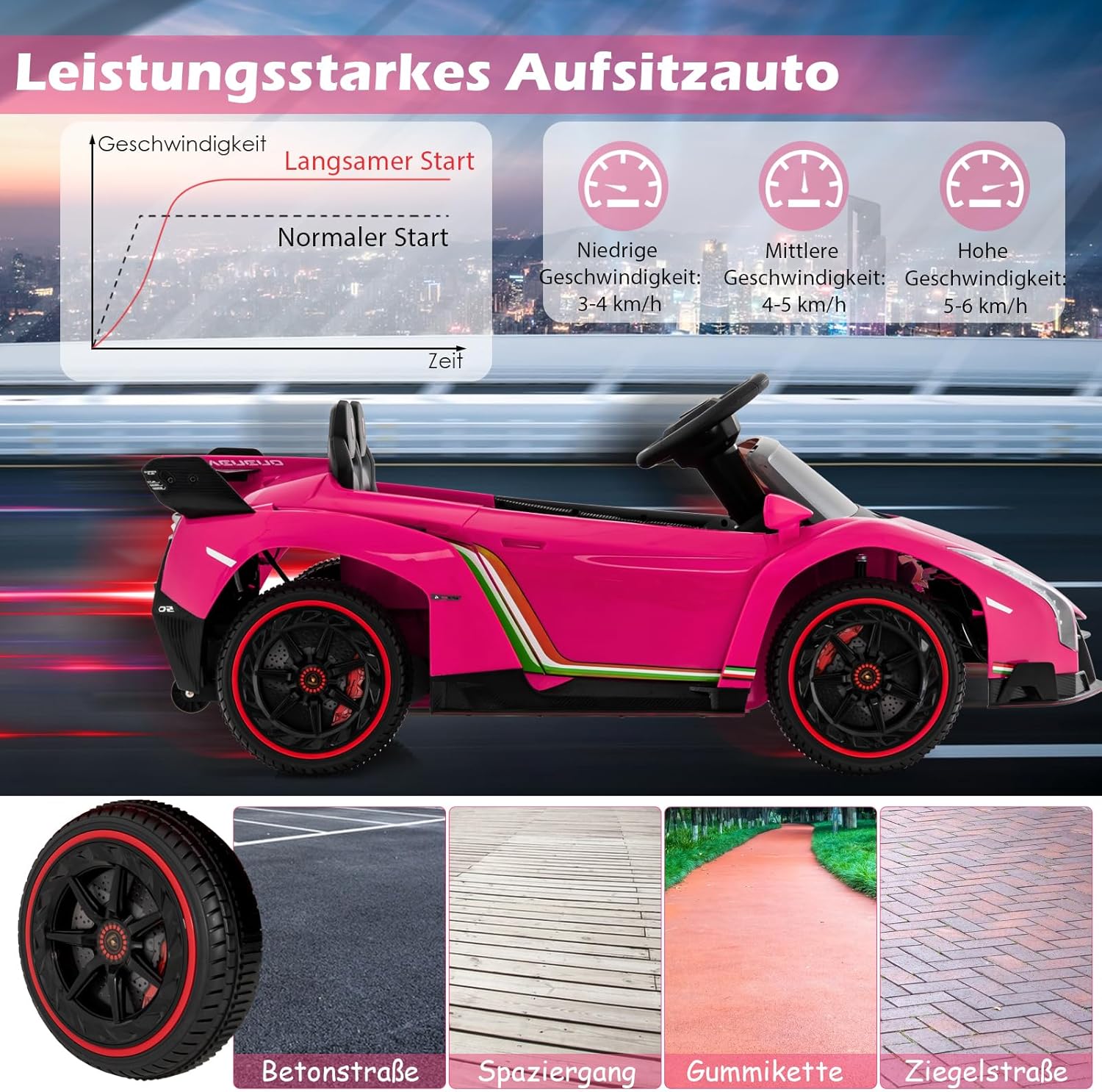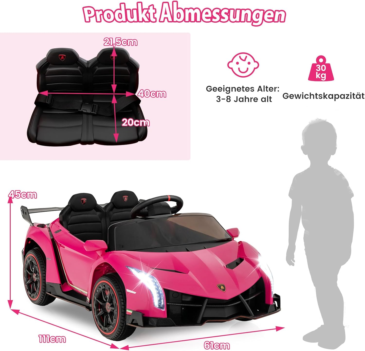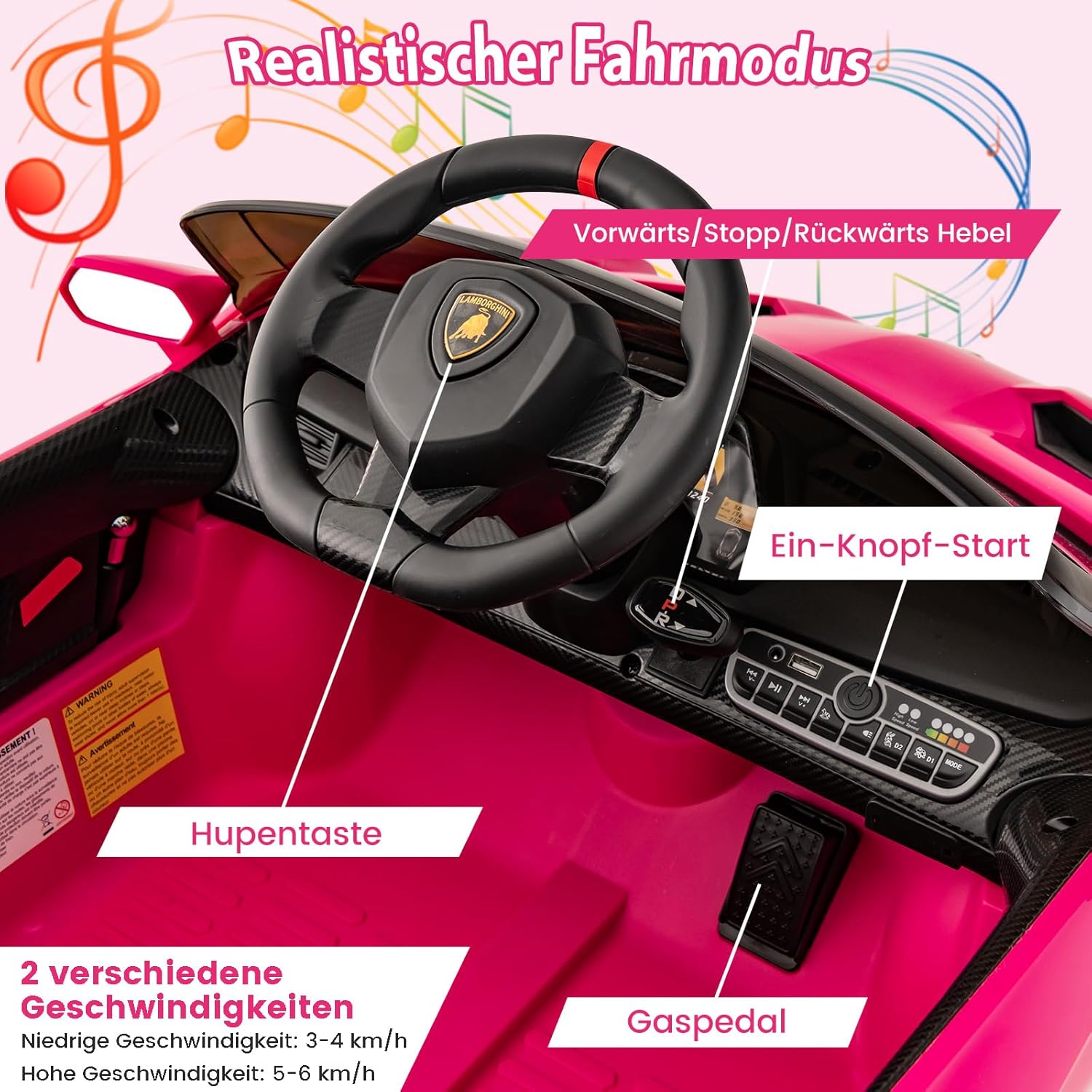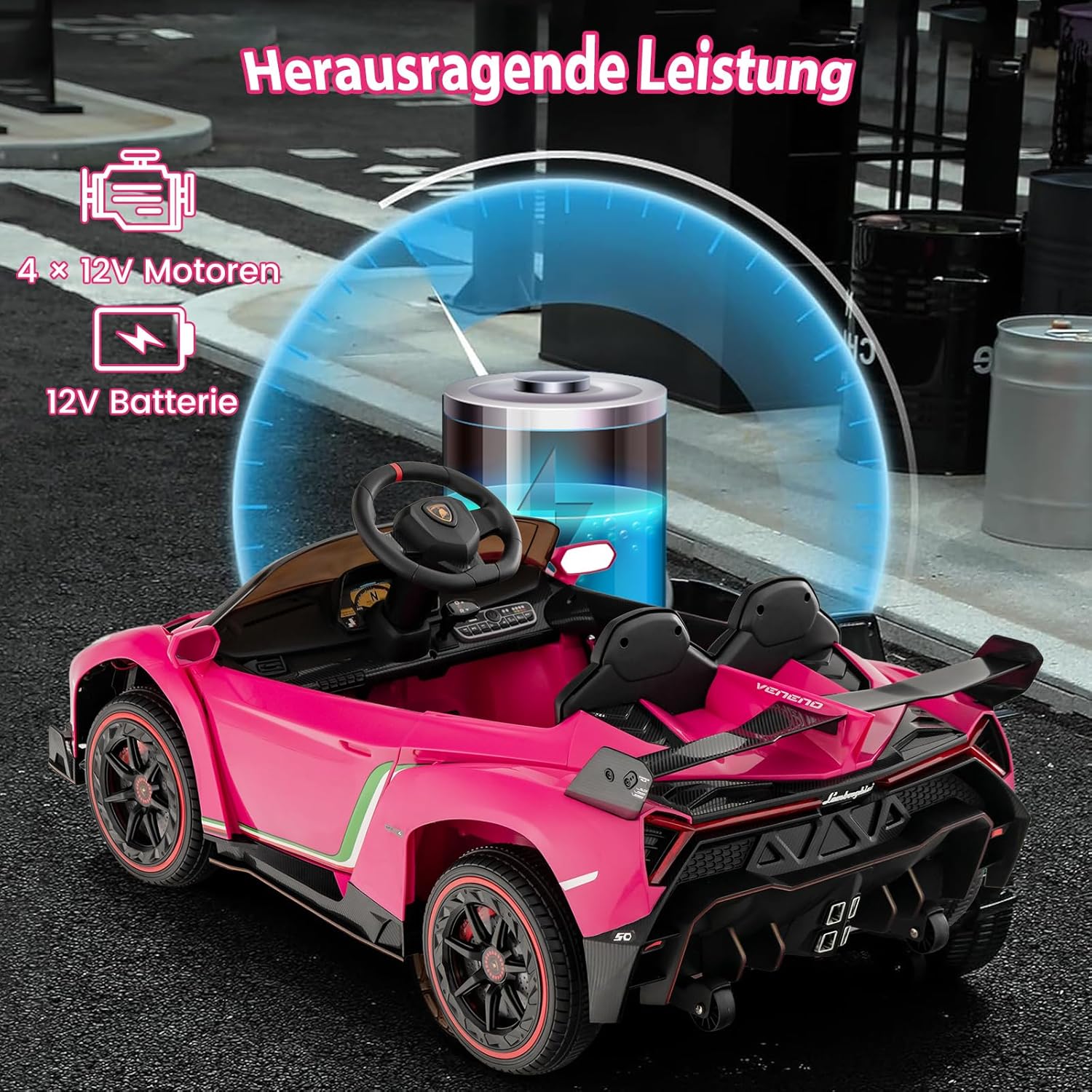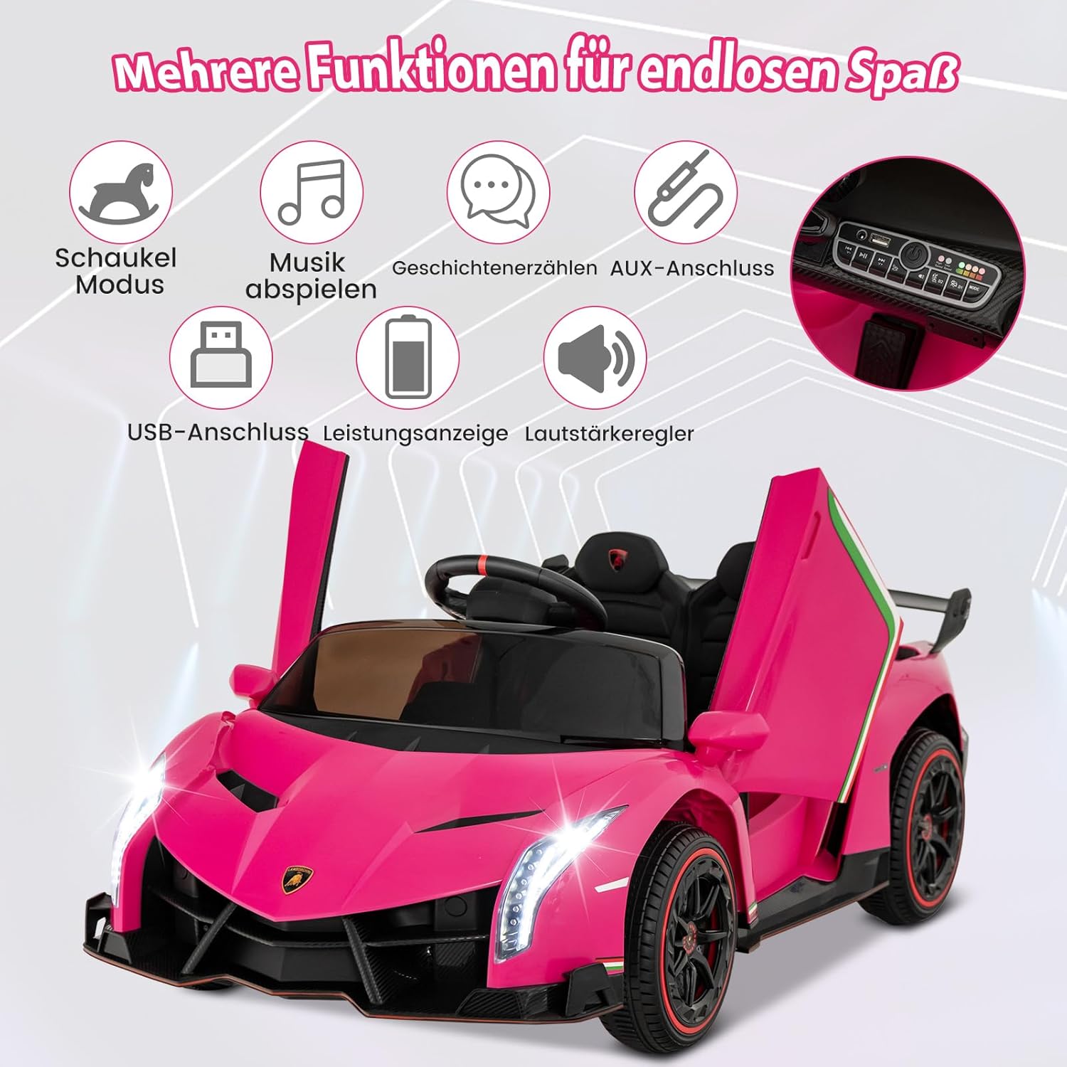 🎁Due modalità operative: i bambini più grandi possono controllare da soli l'auto sportiva utilizzando i pedali e il volante e guidare ad alta o bassa velocità. Se il bambino è troppo piccolo per guidare da solo, i genitori possono controllare il passeggino tramite il telecomando 2.4G e giocare con i propri figli. 🎁 Bellissimo look Lamborghini: il nostro giocattolo cavalcabile è modellato su una vera macchina da cavalcare Lamborghini e ha un look fantastico che i bambini adoreranno a prima vista. È dotato di leva di comando, fari luminosi, fantastico spoiler posteriore, luci posteriori e porte ad azionamento idraulico per offrire un'esperienza di guida realistica al tuo bambino. 🎁Prestazioni eccellenti: il nostro passeggino ha una batteria integrata da 12 V e quattro motori da 12 V. Il tempo di ricarica è di 8-12 ore e, dopo una ricarica completa, può guidare a una velocità costante di 3-7 km/h per 1-2 ore. I pneumatici antiurto e resistenti all'usura sono perfetti per uso interno ed esterno. 🎁La sicurezza prima di tutto: grazie alla partenza lenta, i nostri passeggini non possono spaventare il bambino a causa di un'accelerazione improvvisa. Le porte con serratura e le cinture di sicurezza garantiscono ulteriore sicurezza per i bambini. Inoltre, la parte posteriore del passeggino ha piccole ruote nascoste che ne facilitano lo spostamento e il trasporto. 🎁Regalo perfetto: il nostro passeggino è dotato di musica integrata, modalità cavallo a dondolo, porta USB e ingresso AUX, ecc. I bambini possono godersi le loro canzoni e storie preferite tramite la funzione Bluetooth, che li rende più divertenti. È un regalo perfetto per ragazzi e ragazze dai 3 agli 8 anni.
