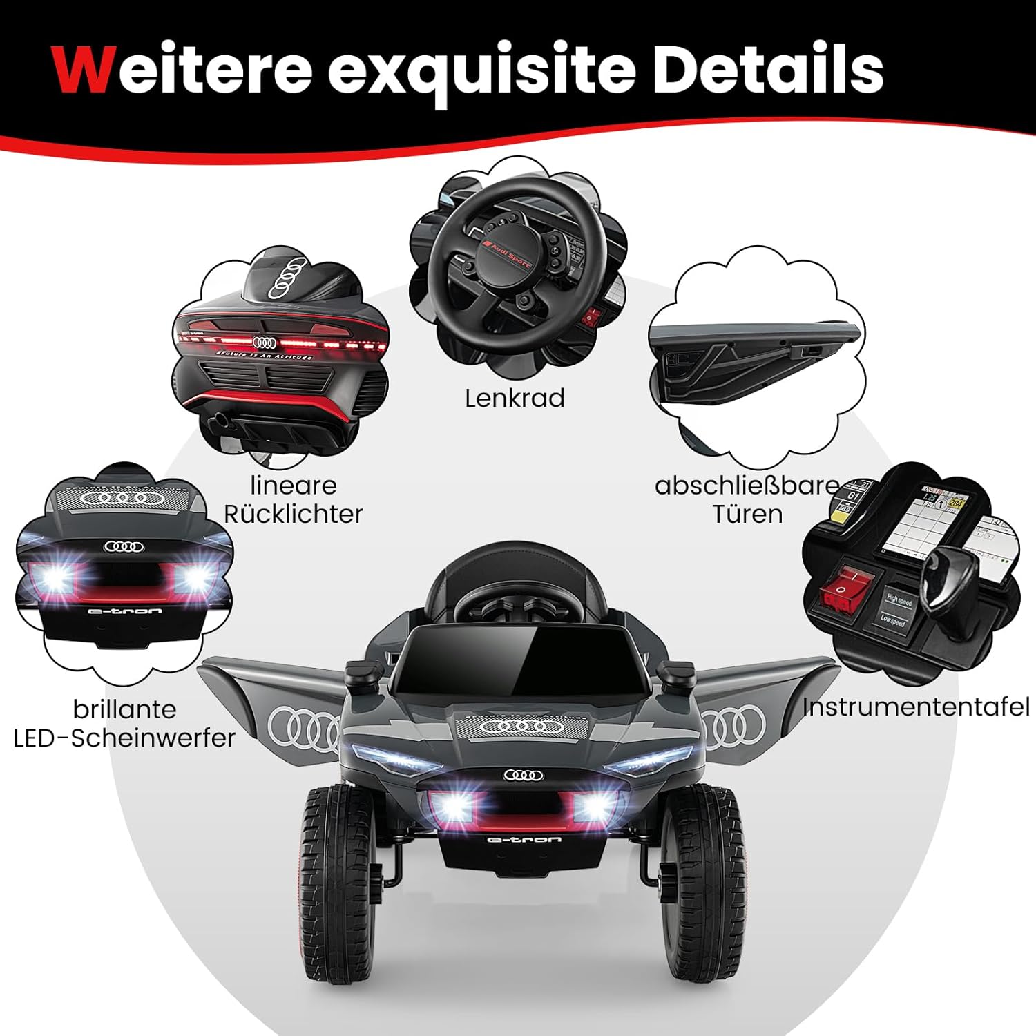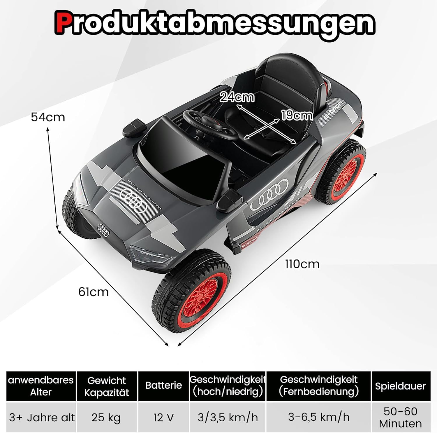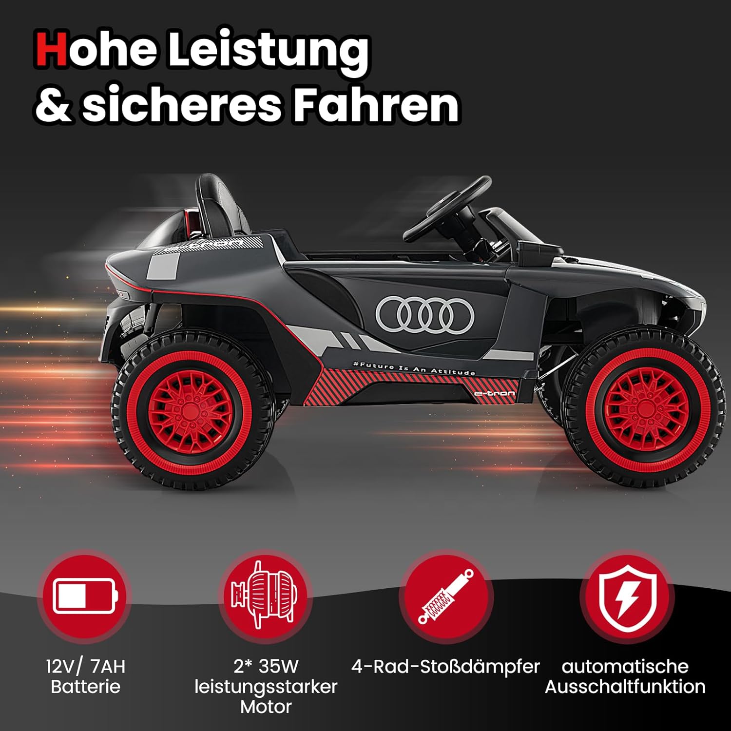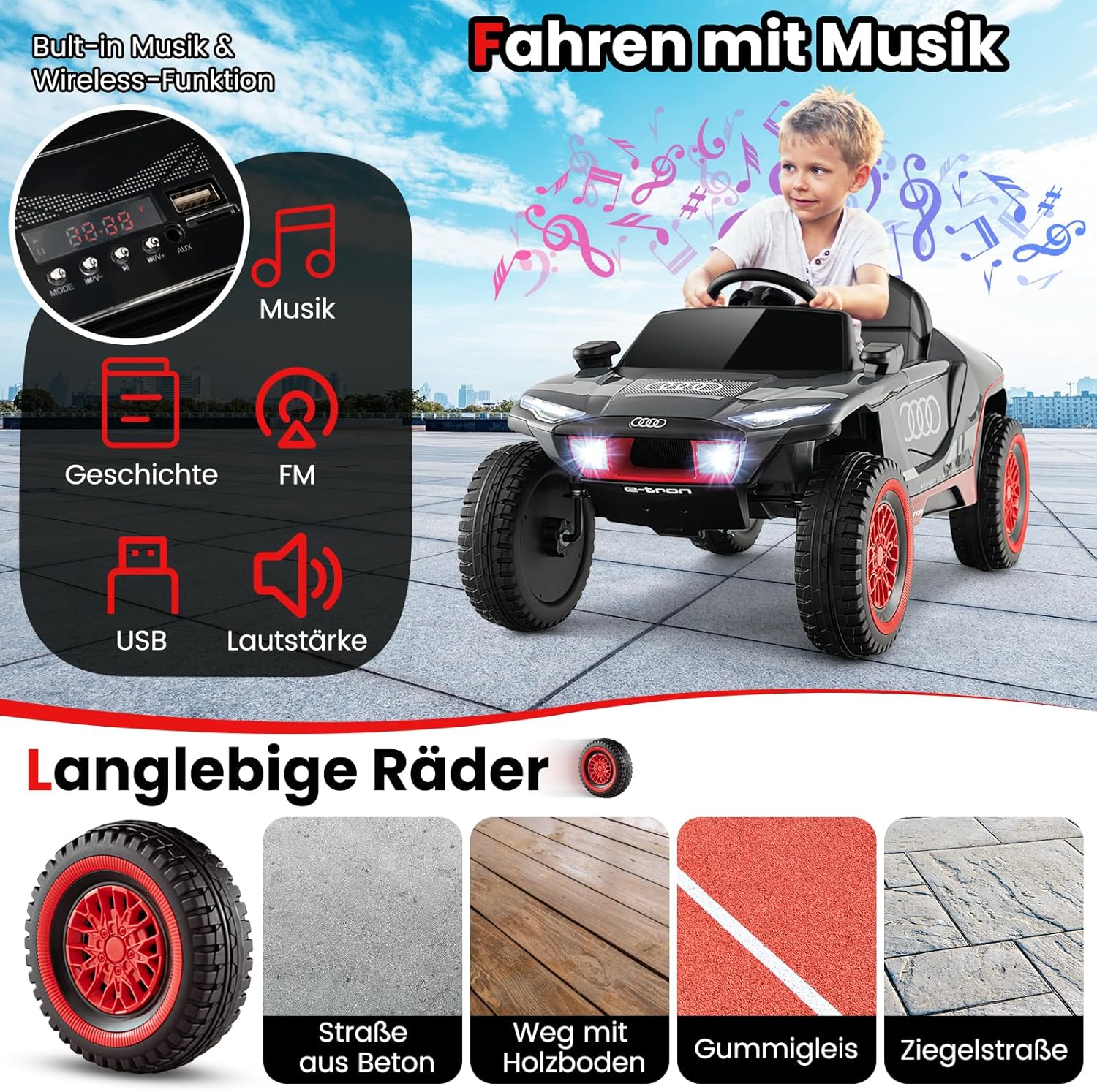 🚗Due modalità di guida: questo veicolo per bambini Audi offre la possibilità di guida manuale o telecomando e consente al tuo bambino di guidare autonomamente o di essere guidato dai genitori. Il telecomando parentale 2.4G a 3 velocità offre un'esperienza di guida emozionante e interattiva. 🚗Prestazioni elevate e guida sicura: con potenti motori da 2x35 W e una batteria da 12 V/7 Ah, questa macchina da corsa consente ai bambini di raggiungere velocità fino a 6,5 km/h. Inoltre, gli ammortizzatori a 4 ruote garantiscono una guida stabile e la funzione di spegnimento automatico garantisce sicurezza. 🚗Guidare con la musica: lascia che tuo figlio si diverta alla guida con le funzionalità di intrattenimento integrate! Il volante con clacson, il lettore multimediale con musica, storie e funzioni FM intratterranno il tuo piccolo per ore. Puoi anche collegare il tuo telefono tramite la porta USB per riprodurre le tue canzoni preferite. 🚗Ruote robuste e design elegante: questo veicolo elettrico con le sue quattro ruote testurizzate è adatto a qualsiasi terreno, comprese strade in cemento, pavimentazioni, cingoli in gomma e strade piastrellate. I luminosi fari a LED, le luci posteriori lineari e le eleganti porte con serratura attireranno l'attenzione di tuo figlio e dei suoi amici. 🚗Regalo perfetto per i bambini: questo veicolo per bambini Audi con licenza ufficiale è il sogno di ogni giovane avventuriero. È pensato per i bambini dai 3 anni in su e offre loro un'ottima esperienza di guida. Pertanto questa macchina da corsa è un regalo di Natale o di compleanno ideale per i bambini.