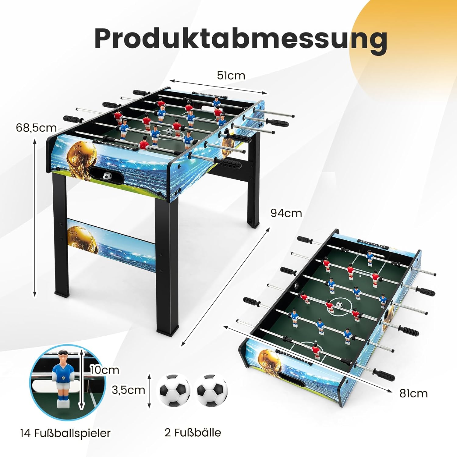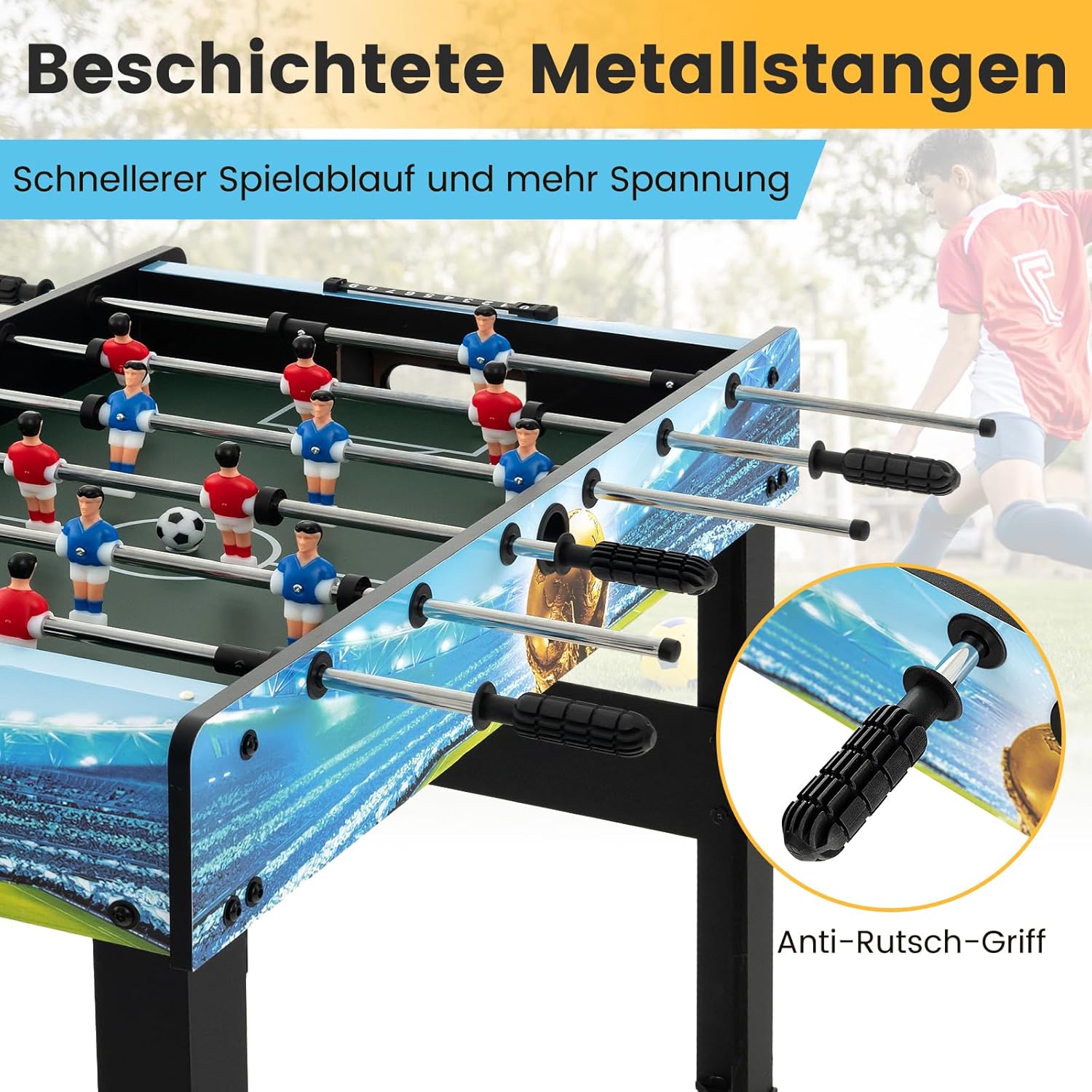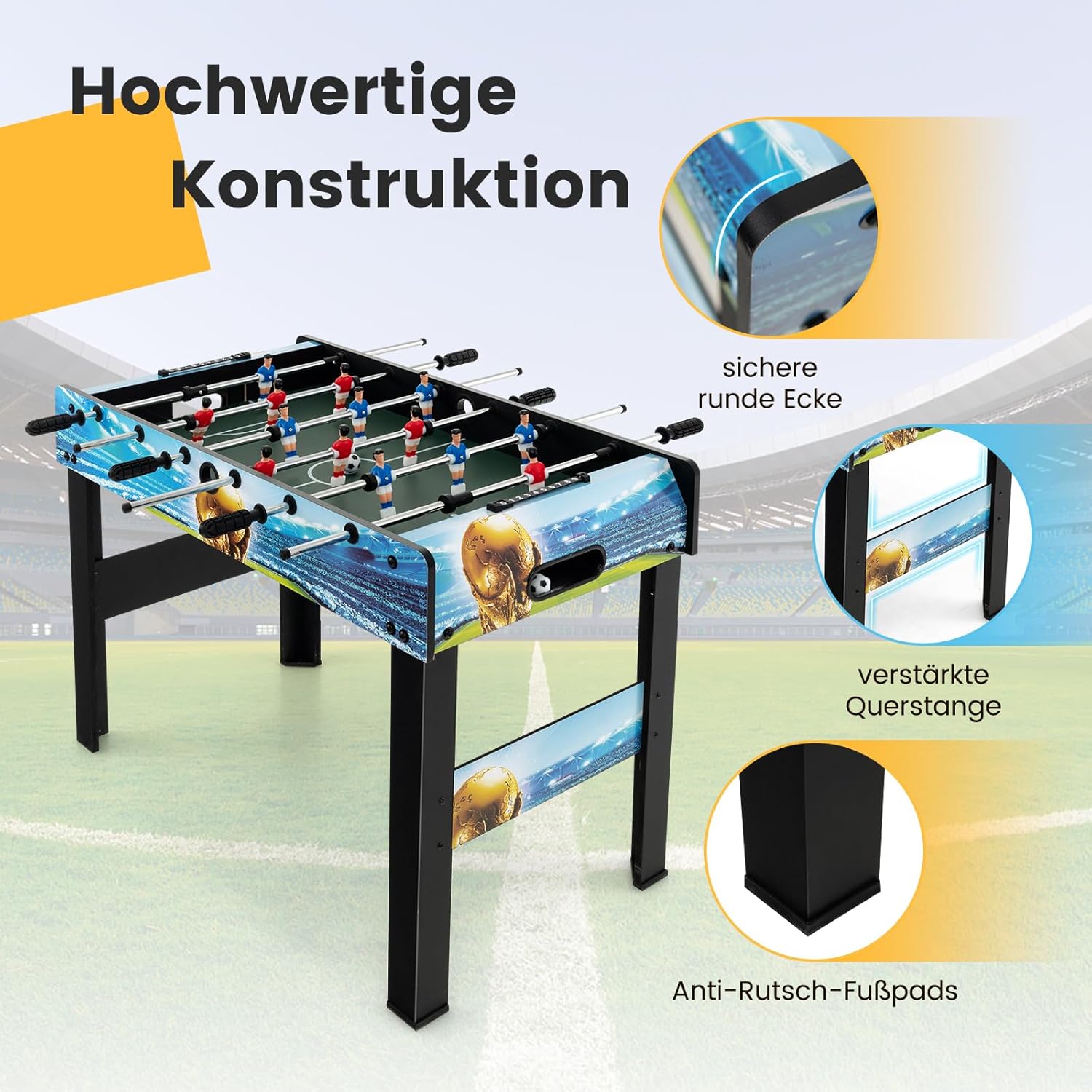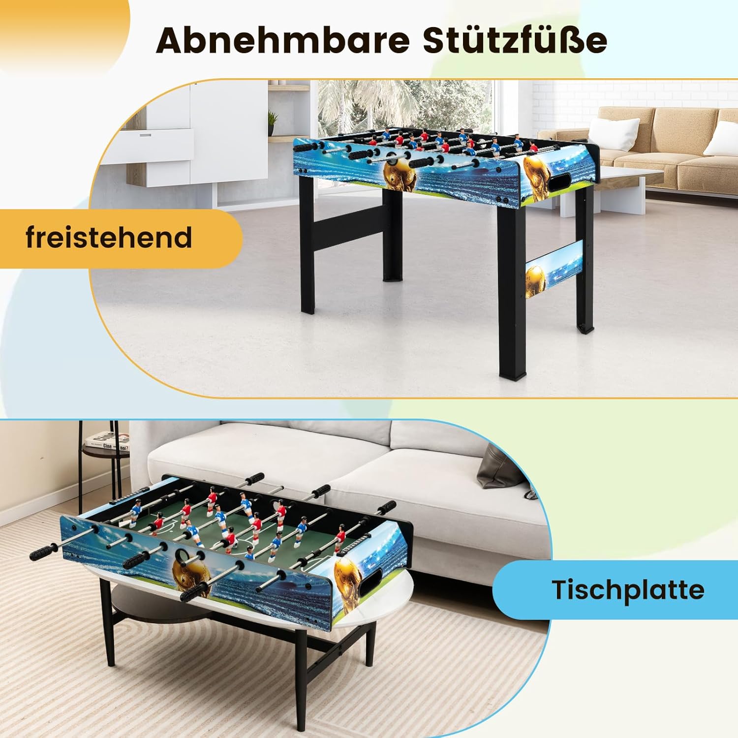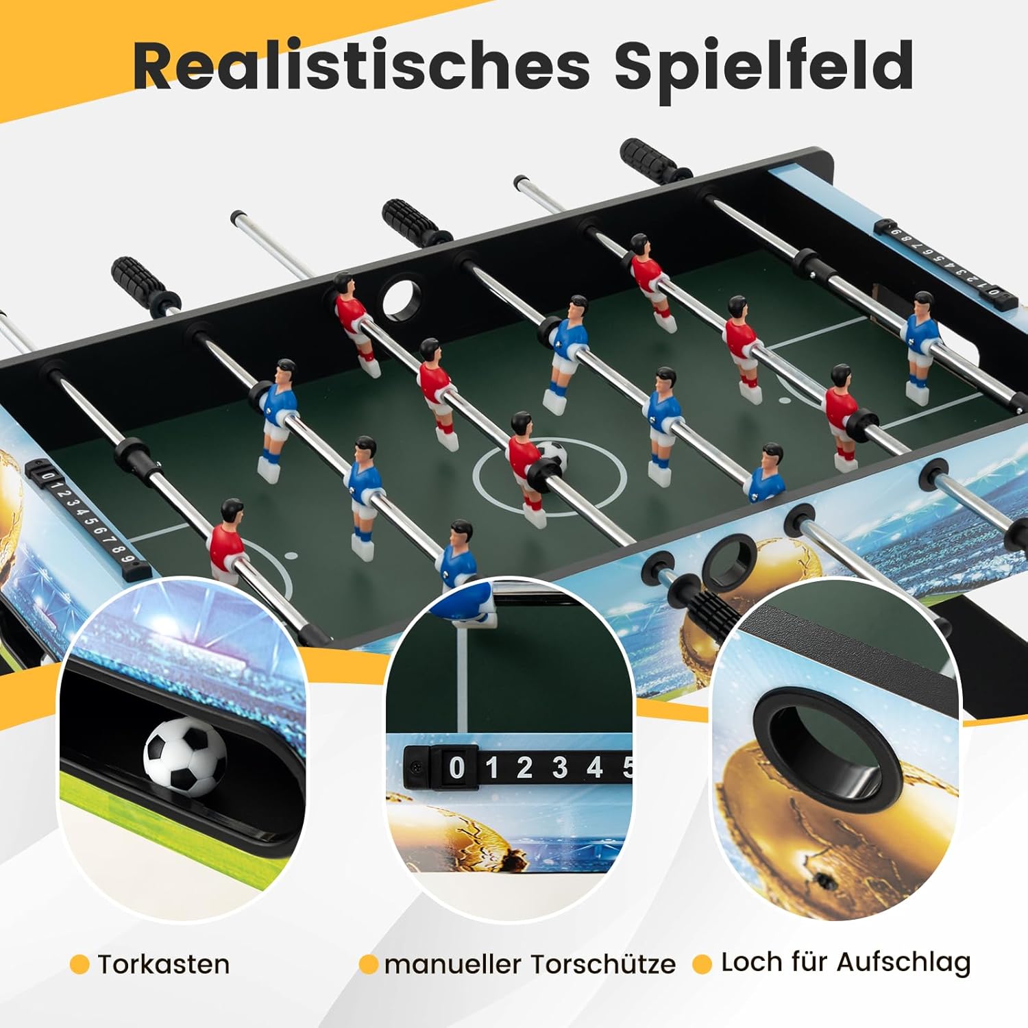Divertimento senza fine ovunque: questo calcio balilla porta un divertimento senza fine direttamente a casa tua, ma anche in altre stanze come la sala giochi e il soggiorno. I bambini possono trascorrere del tempo di qualità con la famiglia e gli amici e creare ricordi d'infanzia indimenticabili attraverso giochi di calcio divertenti e amichevoli. Costruzione di alta qualità: questo tavolo da biliardino è costruito con un telaio robusto con traverse rinforzate per garantire un uso duraturo. Gli angoli arrotondati sicuri proteggono dagli infortuni durante il gioco intenso e anche i piedini antiscivolo non danneggiano il pavimento. Gioco più veloce, sensazione più emozionante: la superficie di gioco liscia e le barre di metallo placcato di questo tavolo da gioco sono progettate per migliorare il gameplay. Le impugnature ergonomiche e antiscivolo consentono un controllo preciso per tiri precisi, passaggi e manovre strategiche, garantendo un'autentica esperienza di calcio balilla. Gambe di supporto rimovibili: grazie alle gambe rimovibili, questo gioco di biliardino può essere utilizzato in due modi: indipendente o come tavolo, offrendo flessibilità e comfort. Che tu stia giocando su un tavolo o desideri goderti un'esperienza di gioco a grandezza naturale, è sufficiente staccare o attaccare le gambe secondo necessità. Facile da montare: il gioco da tavolo ha istruzioni chiare e parti numerate in modo che possa essere facilmente assemblato da due persone. È un ottimo investimento per tutta la famiglia o un regalo ideale per i bambini che amano il calcio. Dimensioni del prodotto: 94 cm x 81 cm x 68,5 cm (L x P x A)