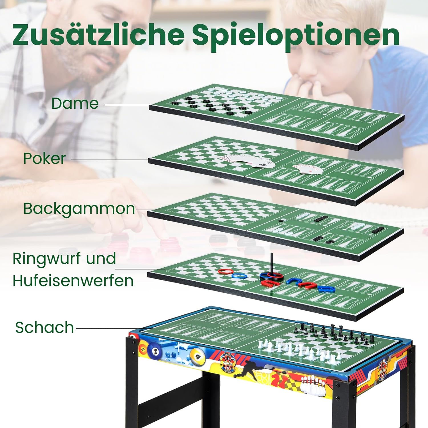 Tavolo da gioco 12 in 1: prova un divertimento senza fine con questo tavolo da gioco 12 in 1 che offre una varietà di emozionanti opzioni di gioco in uno, tra cui biliardino, biliardo, ping pong, hockey, bowling, shuffleboard, poker, backgammon, dama, scacchi, lancio dell'anello e lancio del ferro di cavallo. Design impilabile facile da convertire e salvaspazio: passa facilmente tra 6 giochi con la palla o altre selezioni di gioco aggiuntive con la comoda funzione di conversione; Questo gioco da tavolo può essere trasformato nella modalità di gioco desiderata in pochi minuti. Inoltre, il suo design impilabile massimizza l'utilizzo del tuo spazio senza sacrificare il divertimento e l'eccitazione. Robusta struttura del tavolo: realizzato con materiali di alta qualità per una lunga durata, questo tavolo da gioco multifunzionale è dotato di un telaio robusto per una maggiore stabilità. I poggiapiedi regolabili garantiscono inoltre un'esperienza di gioco stabile senza oscillazioni. Dettagli di alta qualità per un'esperienza di gioco eccezionale: progettato per un'esperienza di gioco confortevole, il nostro tavolo da gioco è dotato di maniglie antiscivolo con fori di avvio per un'esperienza di gioco piacevole e senza interruzioni. Inoltre, il design simulato del giocatore e del campo, nonché il punteggio con la porta, migliorano l'esperienza di gioco e danno ad ogni gioco un tocco autentico. ACCESSORI COMPLETI PER UN'ESPERIENZA DI GIOCO COMPLETA: Tutti gli accessori per i 12 giochi sono inclusi in questo tavolo multifunzionale, incluso set di palle da biliardo, triangolo, 2 stecche, 2 gessetti, 4 shuffleboard, rete e pali, set da ping pong, 2 palloni da calcio, 10 palle da bowling, carte da poker, set da hockey, pezzi degli scacchi, set dama, anelli e ferri di cavallo, set da backgammon.