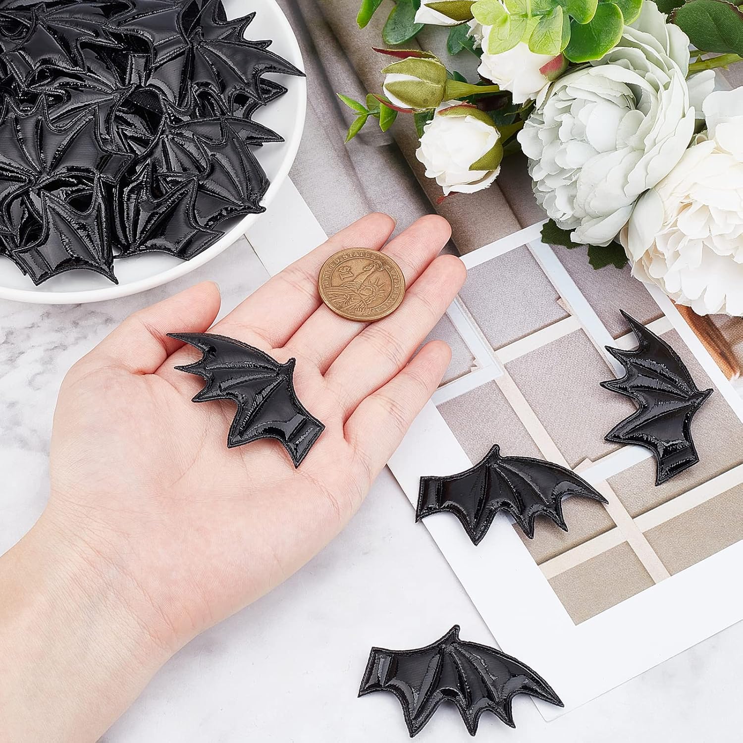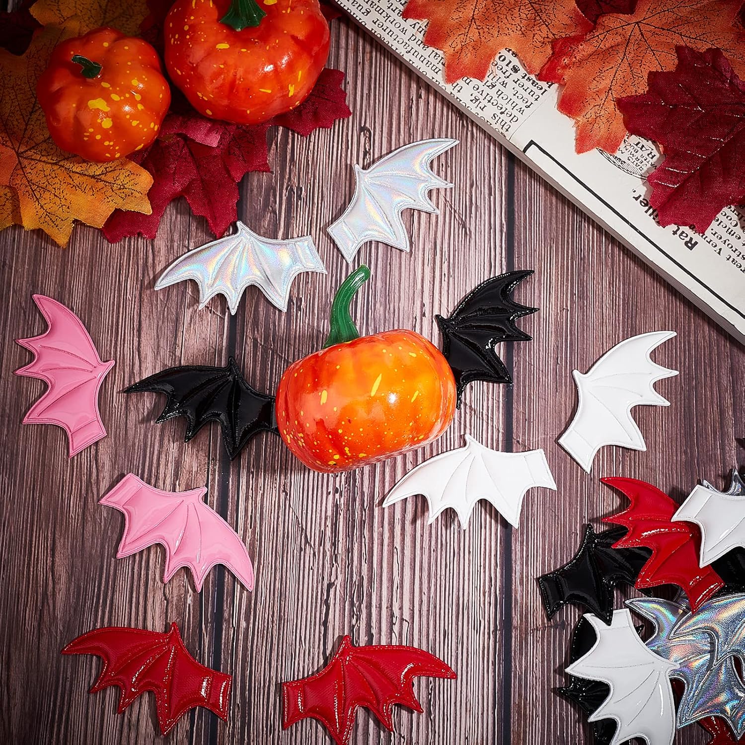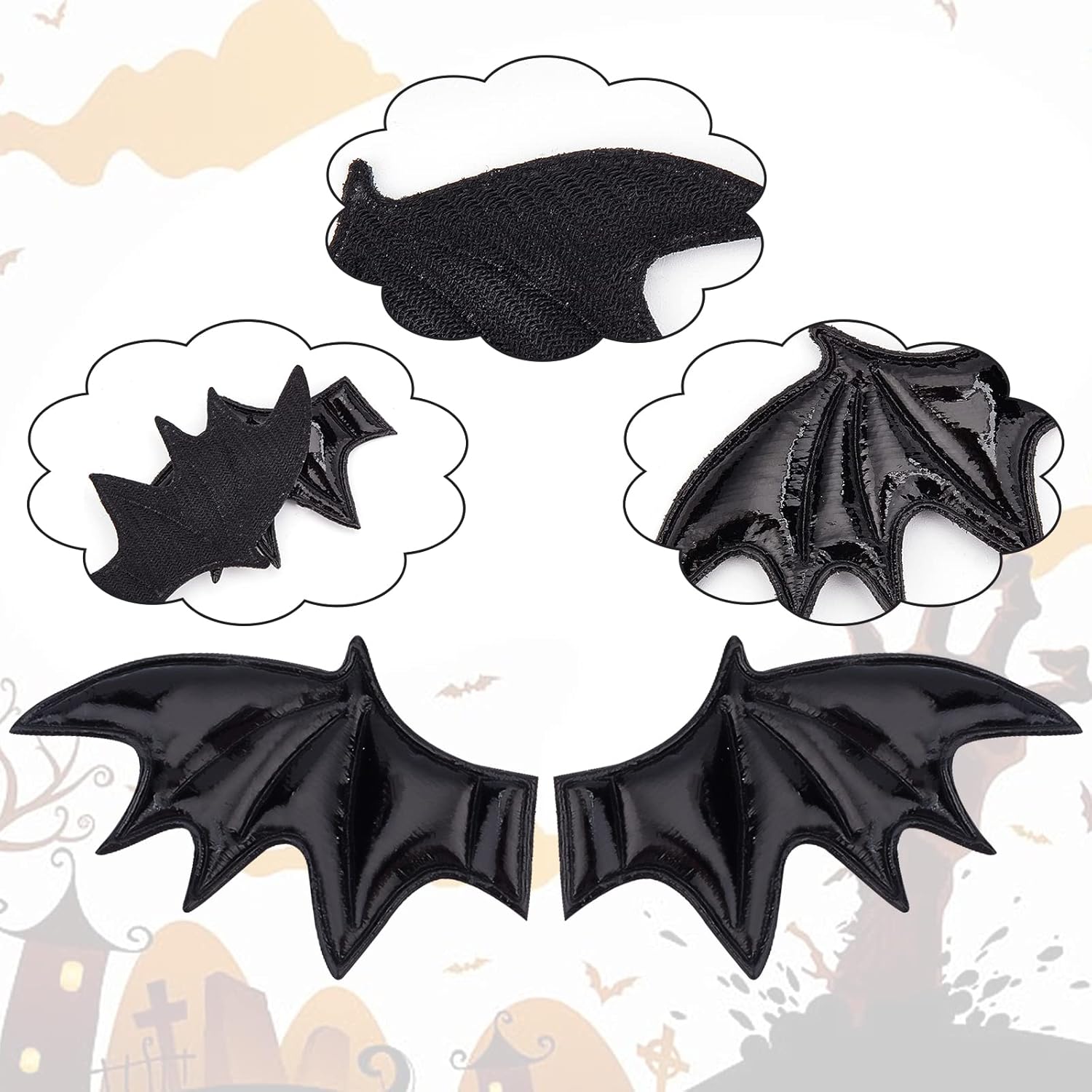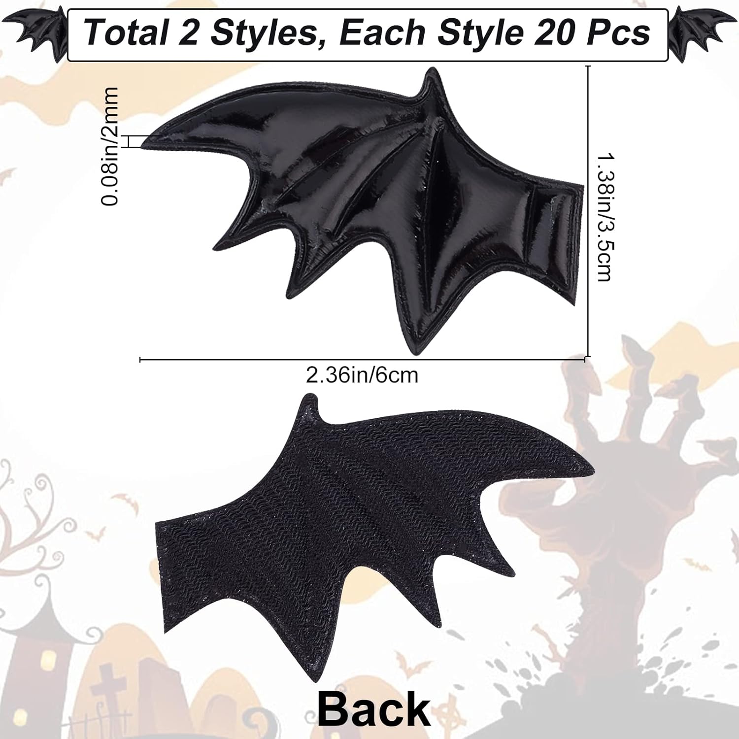 2 stili da 40 pezzi: riceverai 2 diversi stili di accessori per mazze in pelle per le ali sinistra e destra, 20 per ogni stile. Dimensioni: le ali del pipistrello sono larghe circa 1,38 mm, lunghe 2,36 mm, spesse 2 mm (0,08 pollici). ALTA QUALITÀ: le ali di pipistrello di Halloween sono realizzate in pelle di alta qualità, che può essere conservata e riutilizzata a lungo. Design unico: le ali di pipistrello sono realistiche e più accattivanti per il prossimo Halloween. AMPIA APPLICAZIONE: le ali di pipistrello di Halloween possono decorare accessori per capelli fai-da-te, costumi, cappelli, borse, decorazioni per la tavola, decorazioni per feste, scrapbooking e altro ancora.