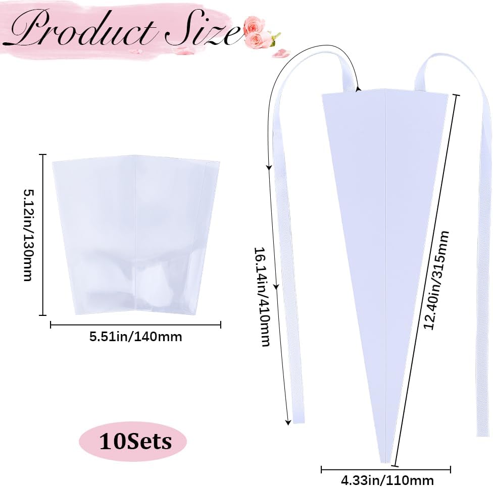 Sacchetti di fiori da 10 pezzi: ci sono 10 set di sacchetti regalo con un singolo fiore, sacchetto: 31,5x11 cm, copertura protettiva: 13x14 cm. Design pratico: design vintage a triangolo, rende i tuoi fiori più attraenti. Copertura in plastica trasparente, puoi vedere il fiore direttamente attraverso la finestra. Materiale di qualità: realizzato in carta e plastica, garantisce che i fiori durino più a lungo, trattenga meglio i fiori, vasi di fiori. Ampiamente usato: perfetto per confezionare fiori freschi, composizioni floreali, shopping, regali, pubblicità, imballaggi, ecc. Ideale per matrimoni, festa della mamma, San Valentino, feste di compleanno, Natale, anniversario, Capodanno, vacanze, confezioni regalo di laurea. Confezione di fiori: questi sacchetti per confezioni di rose possono rendere un fiore semplice più tridimensionale e nobile, esprimere meglio i tuoi sentimenti.