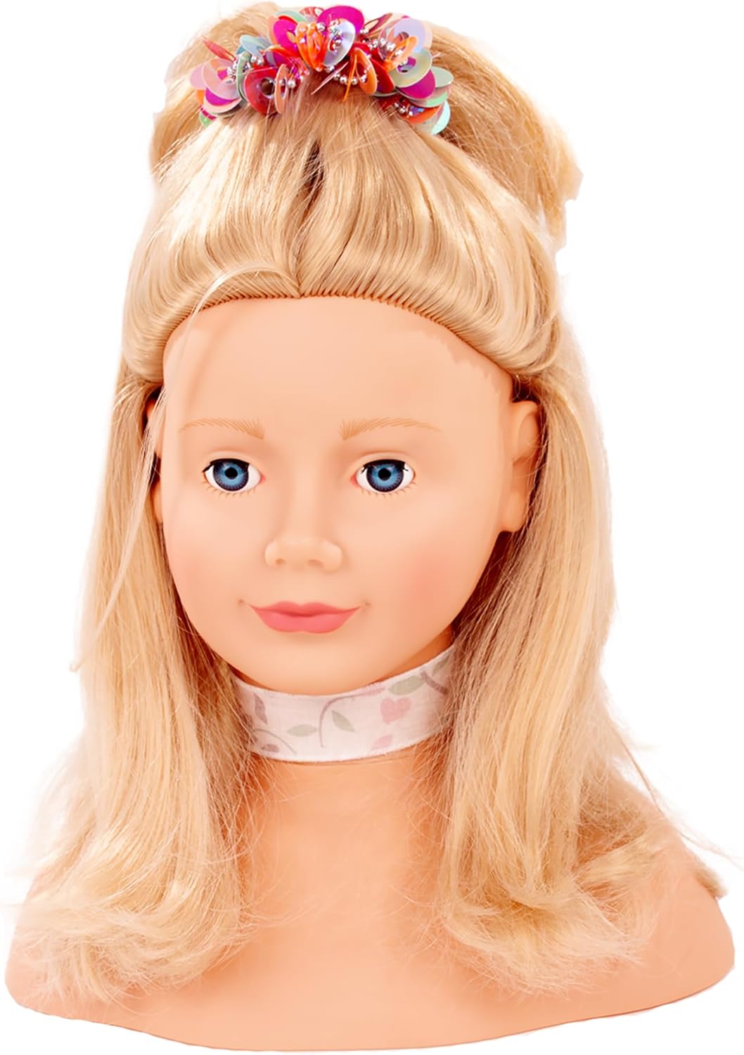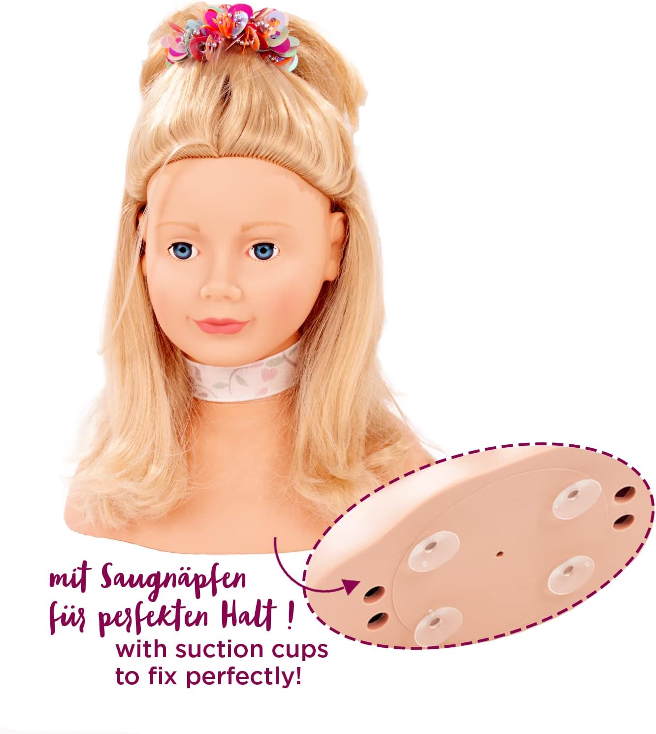 Gioco creativo: con l'ampio set di fermagli per capelli, fermagli, elastici e ciocche di capelli, i capelli biondi e resistenti possono essere pettinati ancora e ancora e il trucco può anche essere lavato via in qualsiasi momento. Qualità e sicurezza: tutti i materiali utilizzati sono testati secondo le linee guida della norma europea sui giocattoli DIN EN71 - Parti 1-3. Adatto a partire dai 3 anni: consigliamo questo giocattolo per bambini dai 3 anni in su. Sempre nuovo: per struccare basta mettere un po' di olio da cucina o una crema grassa su un batuffolo di cotone e usarlo per struccare il viso, quindi lavare nuovamente: così i capelli dureranno a lungo. Fornitura: 1 x opera di capelli biondi (28 x 25 cm), incluso il set da 57 pezzi di Götz.