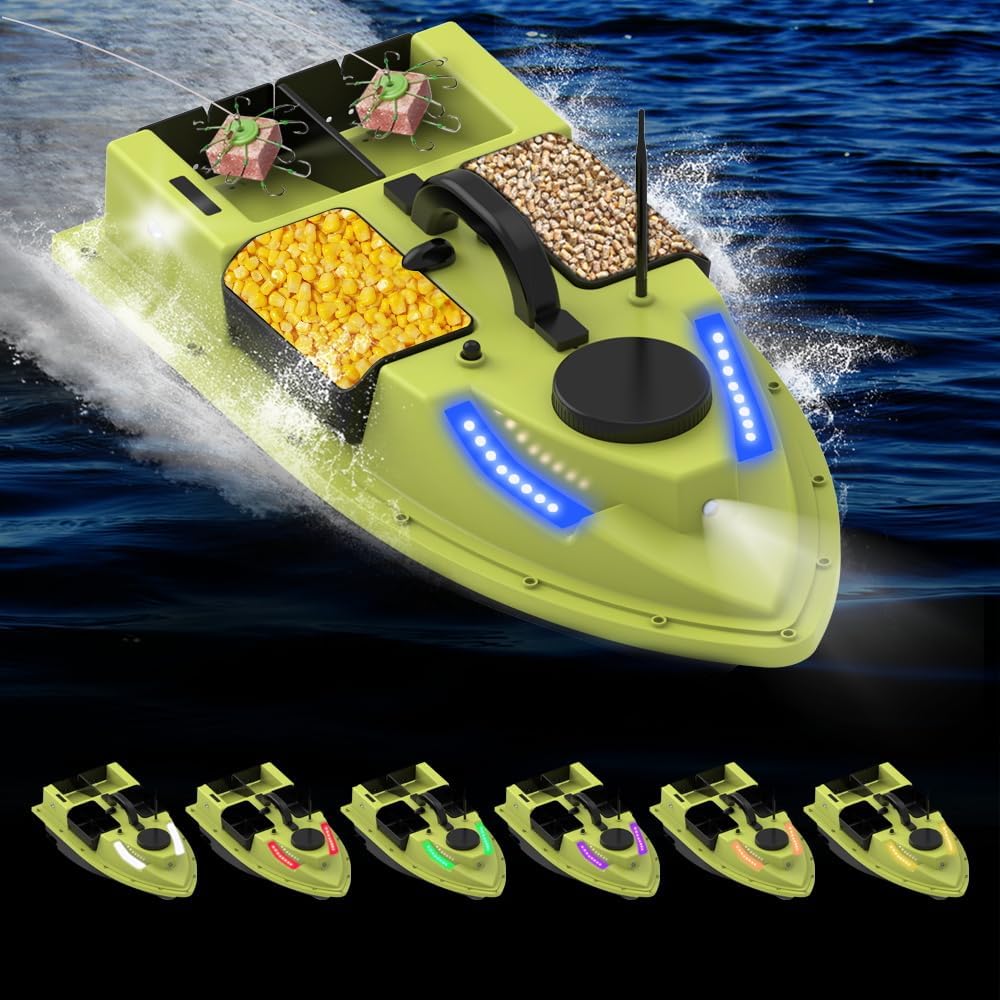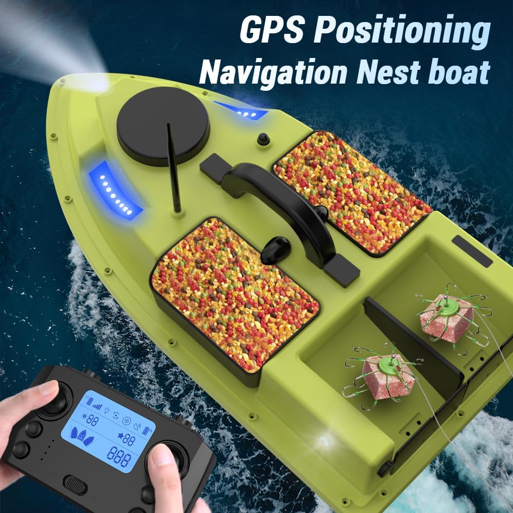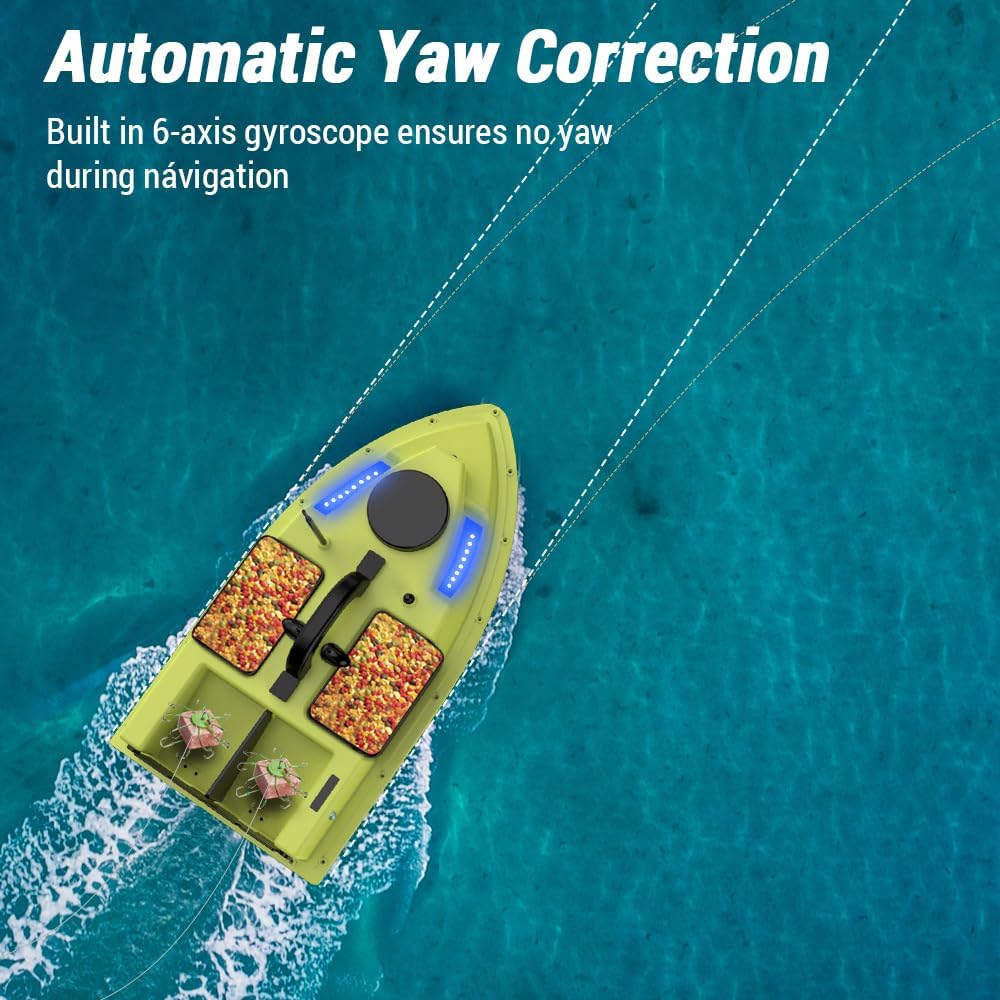 La funzione GPS ti consente di impostare 99 punti di esca, rendendo più facile tornare alle tue posizioni preferite. Con un raggio di controllo remoto fino a 500 metri, è possibile manovrare la barca fino al punto di pesca desiderato senza mai lasciare la riva. Correggere automaticamente il percorso di navigazione e continuare a navigare in linea retta anche tra le onde. Questa barca da pesca può contenere fino a 2 kg di esca, consentendo di coprire un'area più ampia e attirare più pesci. Batteria ricaricabile da 5200 mAh / 12000 mAh per una lunga durata. La barca ritorna automaticamente a batteria scarica.