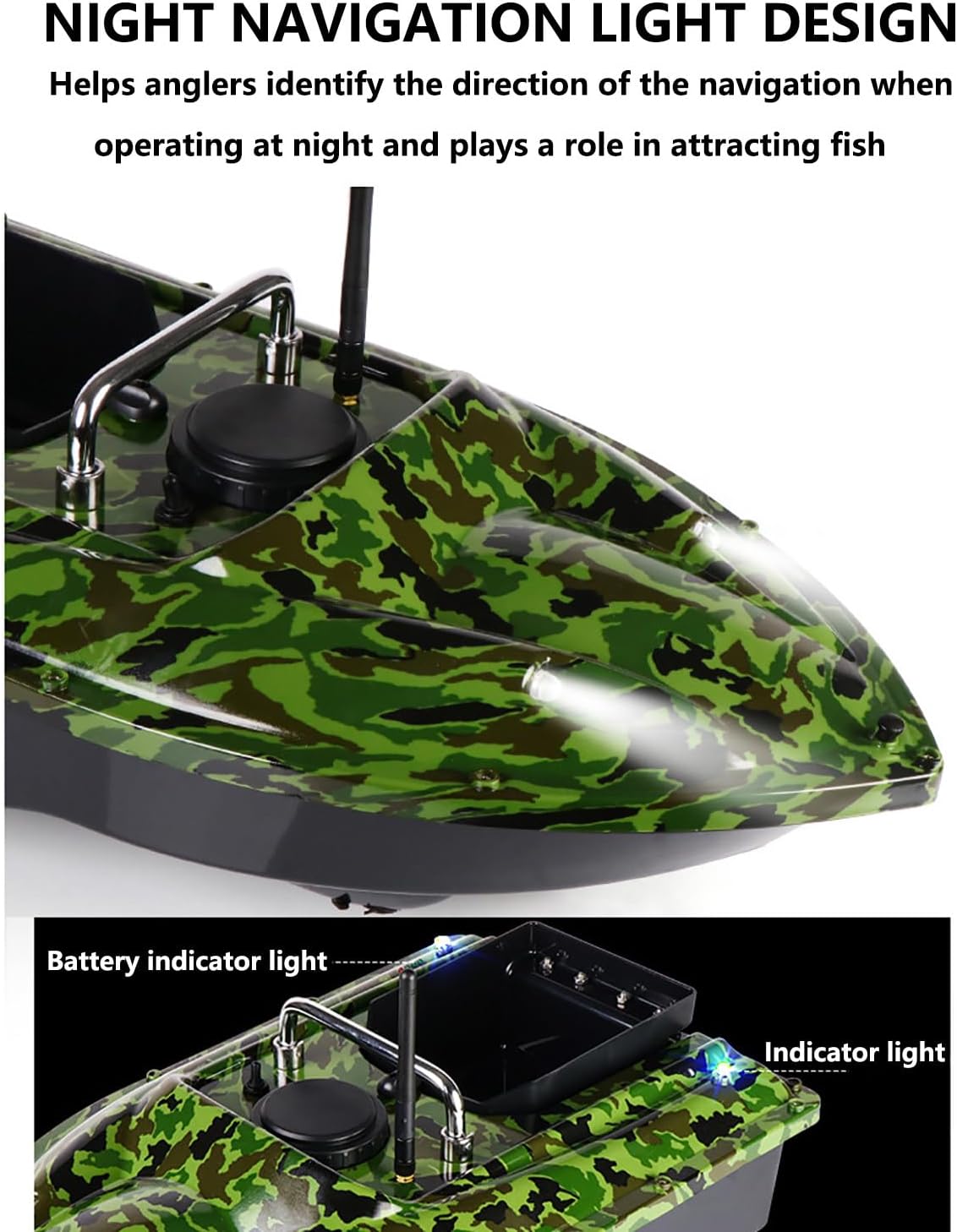 1. 【Nuovo battello da pesca con esche GPS】Migliora la tua esperienza di pesca con questo battello da pesca con esche con telecomando GPS intelligente. Con funzioni come il ritorno automatico a casa, luci notturne, questo battello è perfetto per la pesca notturna. 2. 【Rilascio esche senza sforzo】Grande silo indipendente, carico fino a 1,5 kg. Il telecomando impermeabile e la correzione automatica dell'imbardata rendono la navigazione un gioco da ragazzi. Che tu sia un principiante o un pescatore esperto, questo battello da pesca con esche è un must per il tuo arsenale da pesca. 3. 【Posizionamento GPS】: Cruise control. Telecomando a lunga distanza da 500 metri. Avviso di batteria scarica/ritorno automatico durante la navigazione, quando la batteria della barca è scarica e la distanza del telecomando supera i 500 metri, la barca tornerà automaticamente al punto di partenza. 4. 【Pronto per la pesca notturna】Il design della luce di navigazione notturna aiuta i pescatori a identificare la direzione quando operano di notte e ha l'effetto di attirare i pesci. Schermo LCD impermeabile che mostra la distanza dalla nave, potenza della batteria, luce notturna, visualizzazione della chiave di posizione, visualizzazione del ritorno a 1 tasto e così via. 5. 【Batteria a lunga durata】 Con batteria rimovibile di grande capacità da 2x 7,4 V 12000 mAh, tempo di ricarica 8-10 ore, 1 batteria può essere utilizzata per circa 3-4 ore. Design a doppio motore. Combatti per onde e tempeste di livello 5-6. Se hai bisogno di acquistare batterie aggiuntive, contattaci!